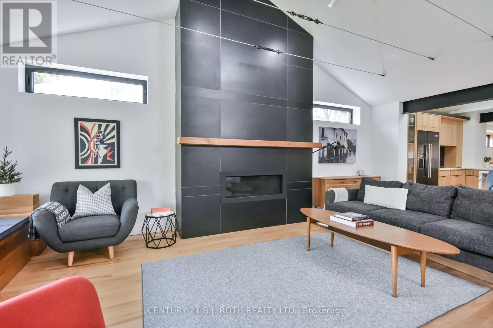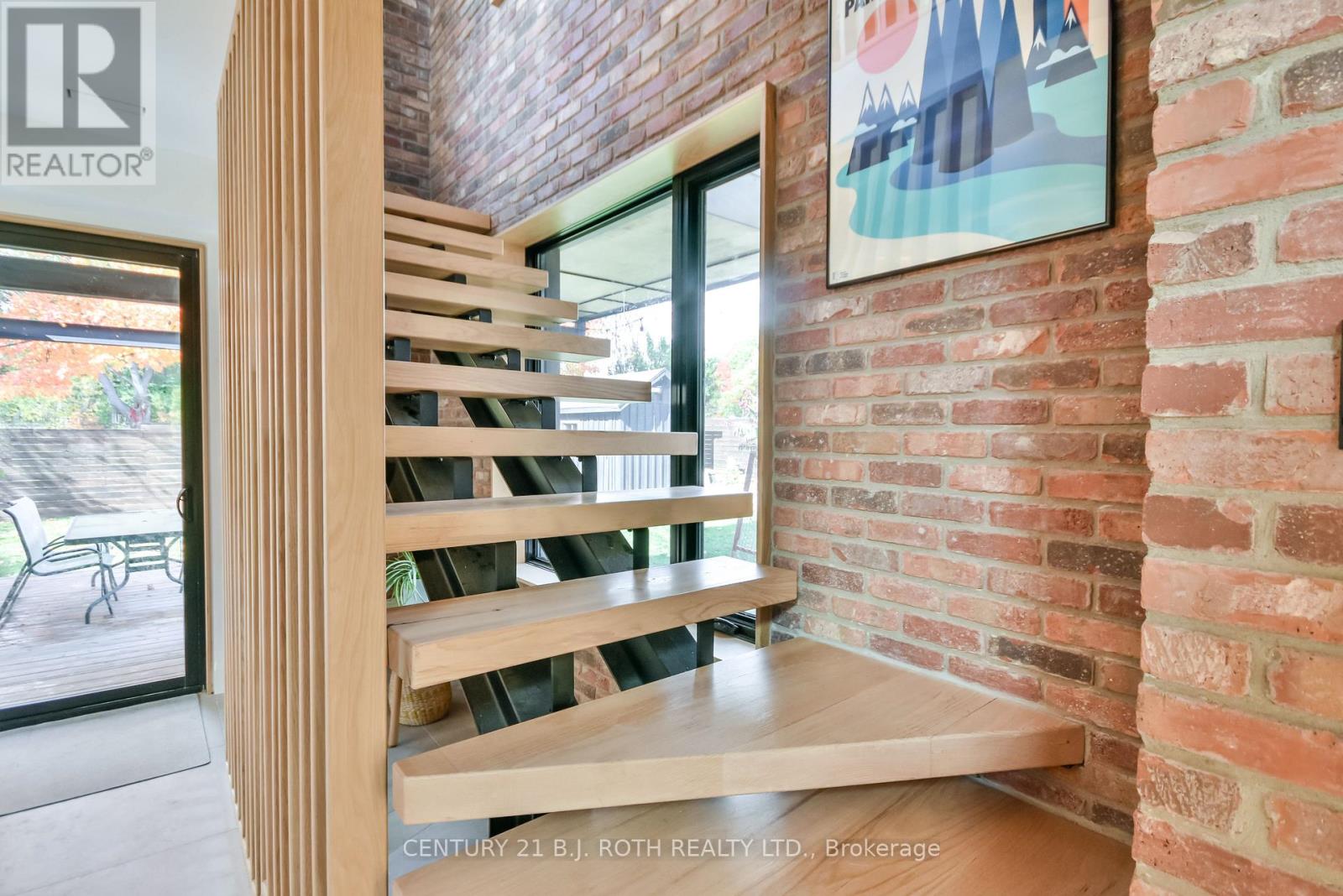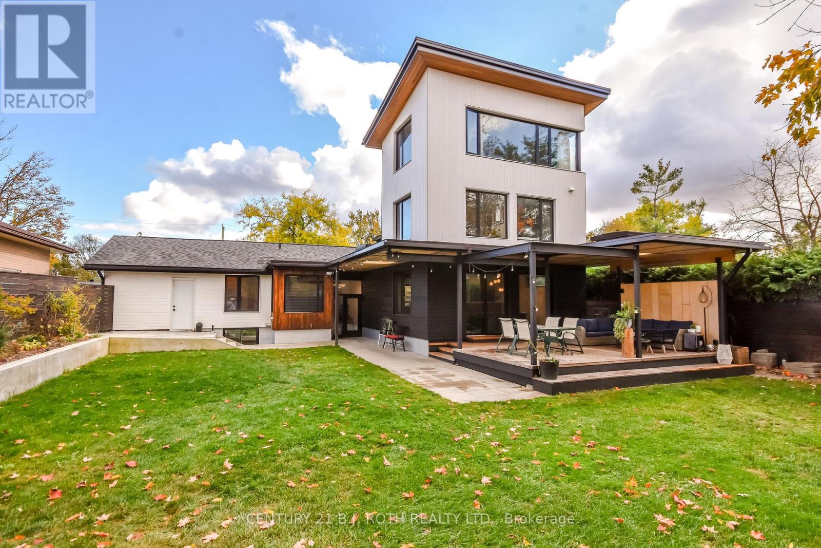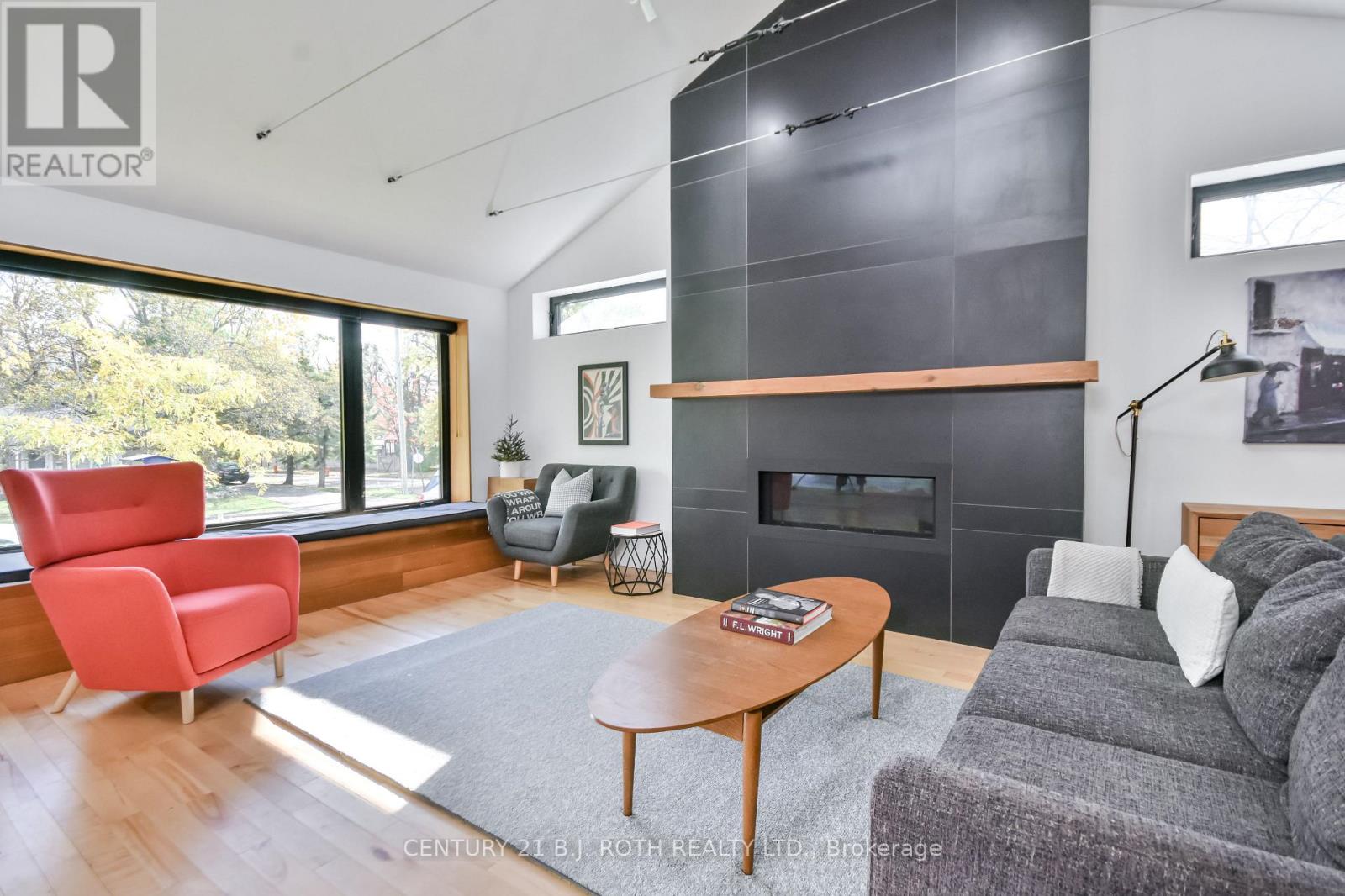 Stunning Mid-Century Modern Masterpiece, Fully Renovated in Prestigious East End. Prepare to be impressed by the flawless execution of high end building. This home has been reimagined with a dramatic 3-storey addition creating a one-of-kind living experience that blends sophisticated, midcentury modern flair with state-of-the art comfort. From the soaring ceilings to the spa-inspired ensuite, every detail has been meticulously curated. Discover unique touches like statement brick wall and sophisticated covered low-slope front entry that enhances the homes curb appeal.Featuring Dramatic, Sun-drenched, open concept, great room with awe inspired aircraft cables and vaulted ceiling gives a sense of volume. The cupola and skylight bathe the area in natural light, highlighting the custom fluted cabinetry of the new designer kitchen and stylish slat wall feature. A true centerpiece, with gorgeous waterfall countertops and ample storage perfect for daily life and grand-scale entertaining. Ascend to your private oasis the master suite features a custom-built king size bed frame and is flooded with light from oversized windows. The lower level spa-like bathroom is a revelation, complete with luxurious stone finishes, soaker tub, custom vanity, steam shower and heated flooring. Enjoy beautiful warm days and cozy evenings on the heated, covered porch, overlooking a spacious backyard adorned with mature trees- a perfect setting for entertaining. Rest easy with a complete suite of new mechanicals, incl: new furnace, a/c, a ducted mini split for optimal climate control. The envelope is fortified with rigid interior insulation, delta wrap water proofing, insulated foundation, new sump pump, and new municipal sewer line, ensuring efficiency and peace of mind for years to come. A rare opportunity to own a bespoke architectural gem. Book your private viewing today. Owner is licensed realtor. (id:64974)
