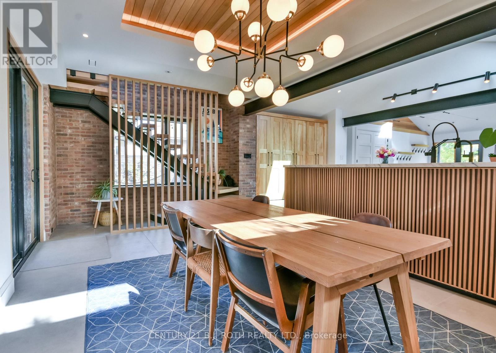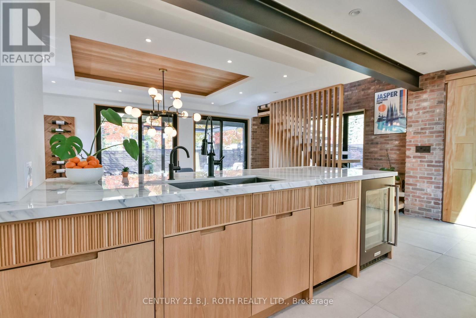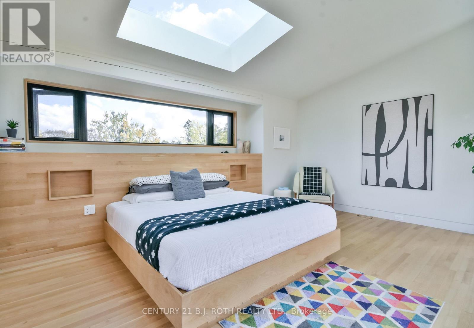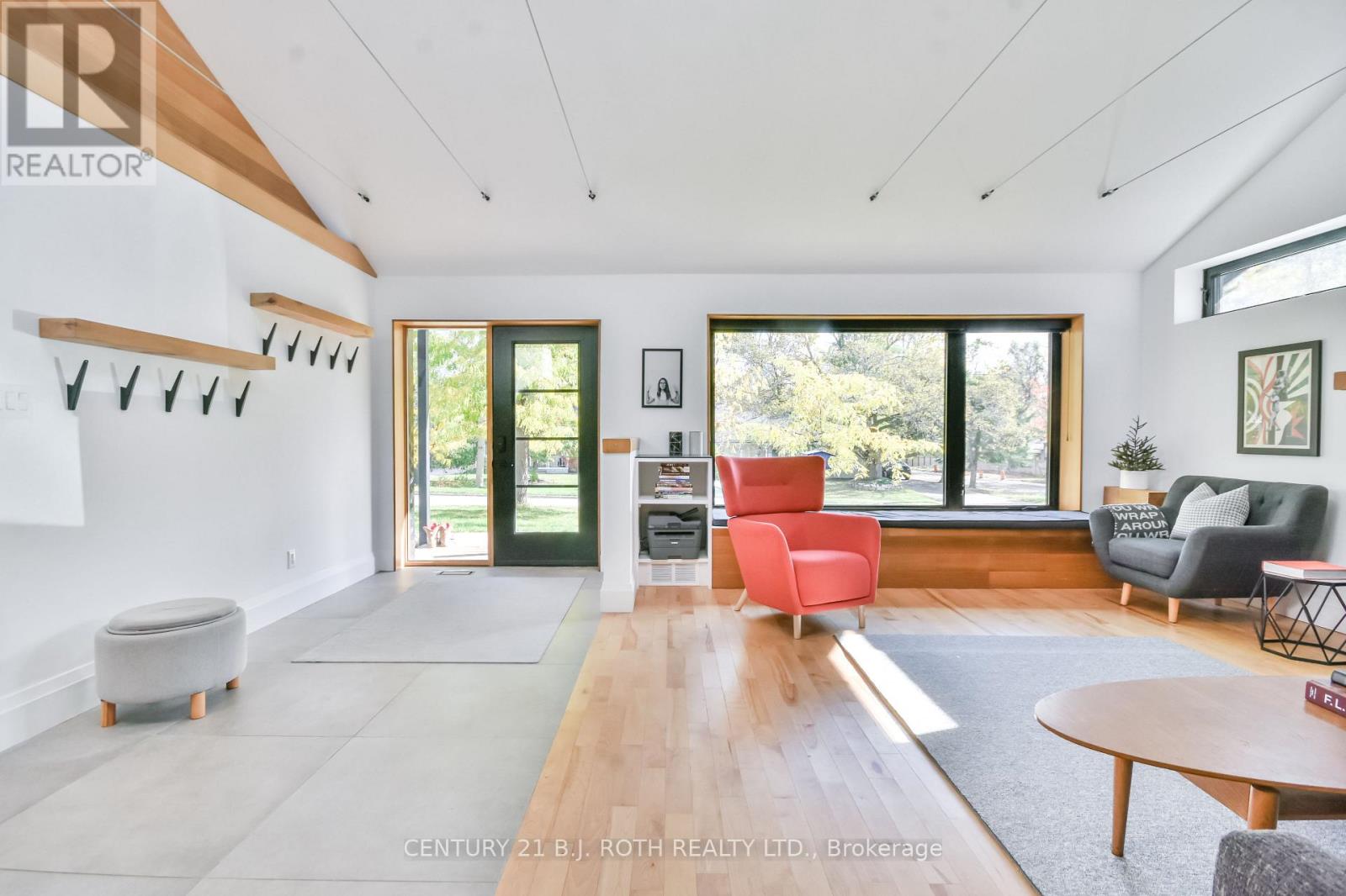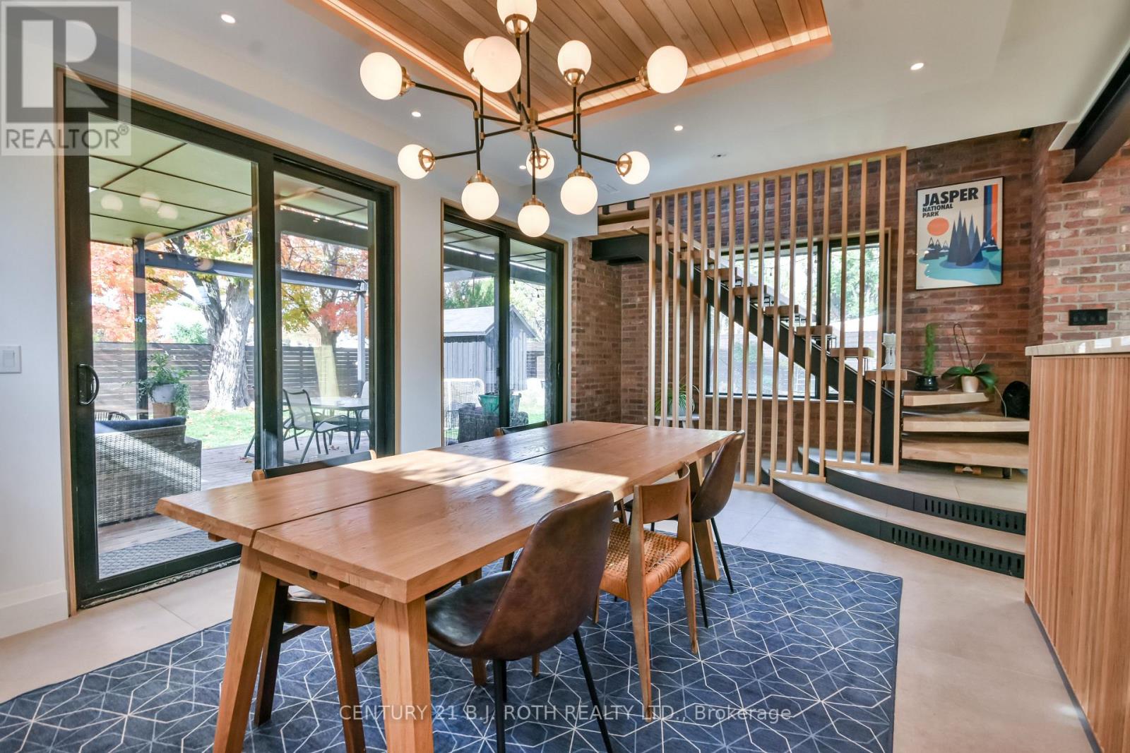 Stunning Mid-Century Modern Masterpiece, Fully Renovated in Prestigious East End. Prepare to be impressed by the flawless execution of high end building. This home has been reimagined with a dramatic 3-storey addition creating a one-of-kind living experience that blends sophisticated, midcentury modern flair with state-of-the art comfort. From the soaring ceilings to the spa-inspired ensuite, every detail has been meticulously curated. Discover unique touches like statement brick wall and sophisticated covered low-slope front entry that enhances the homes curb appeal.Featuring Dramatic, Sun-drenched, open concept, great room with awe inspired aircraft cables and vaulted ceiling gives a sense of volume. The cupola and skylight bathe the area in natural light, highlighting the custom fluted cabinetry of the new designer kitchen and stylish slat wall feature. A true centerpiece, with gorgeous waterfall countertops and ample storage perfect for daily life and grand-scale entertaining. Ascend to your private oasis the master suite features a custom-built king size bed frame and is flooded with light from oversized windows. The lower level spa-like bathroom is a revelation, complete with luxurious stone finishes, soaker tub, custom vanity, steam shower and heated flooring. Enjoy beautiful warm days and cozy evenings on the heated, covered porch, overlooking a spacious backyard adorned with mature trees- a perfect setting for entertaining. Rest easy with a complete suite of new mechanicals, incl: new furnace, a/c, a ducted mini split for optimal climate control. The envelope is fortified with rigid interior insulation, delta wrap water proofing, insulated foundation, new sump pump, and new municipal sewer line, ensuring efficiency and peace of mind for years to come. A rare opportunity to own a bespoke architectural gem. Book your private viewing today. Owner is licensed realtor. (id:64974)