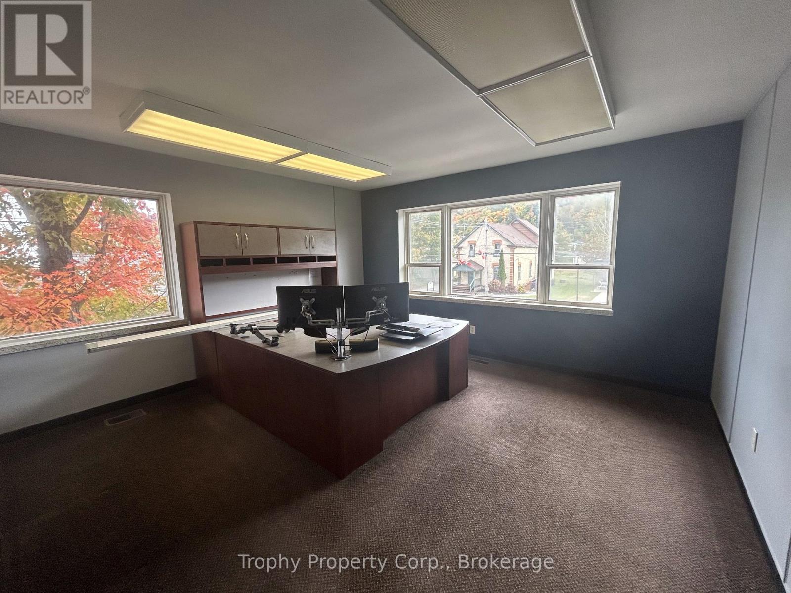 EXCELLENT BRIGHT LARGE EXECUTIVE OFFICES WITH 4 SIDES OF WINDOWS AND RIVER VIEWS OPPOSITE THE LCBO IN DOWNTOWN HALIBURTON. CURRENTLY CONFIGURED WITH 6 LARGE OFFICES, BOARDROOM, KITCHEN, RECEPTION, VAULT ROOM, THREE WASHROOMS AND UTILITY ROOM. THIS SELF-CONTAINED SUITE ENJOYS SEPARATE FURNACE, AIR CONDITIONING, WIFI, SECURITY SYSTEM AND HYDRO, EXCLUSIVE PRIME STREET SIGNAGE WITH DIRECTIONAL BANNERS AND POSSIBLE NAMING RIGHTS. TWO ENTRANCES FROM STREET AND REAR PAVED PARKING AREAS WITH PASSENGER LIFT. PROFESSIONALS, CHARITIES, NOT FOR PROFITS, LAWYERS, REAL ESTATE, ACCOUNTANTS AND GENERAL BUSINESS OPERATIONS WILL BE CONSIDERED AND IDEAL. LANDLORD WILLING TO CONSIDER LEASEHOLD IMPROVEMENTS AND/OR DIVIDING INTO SMALLER SUITES. (id:64974)