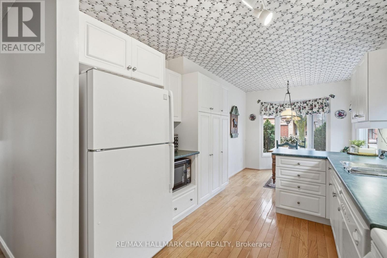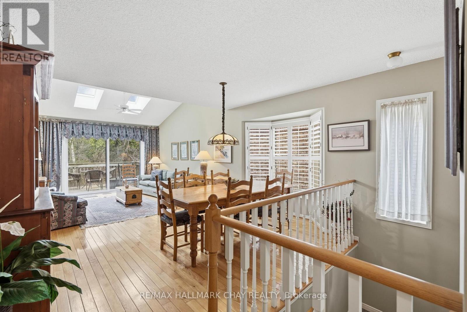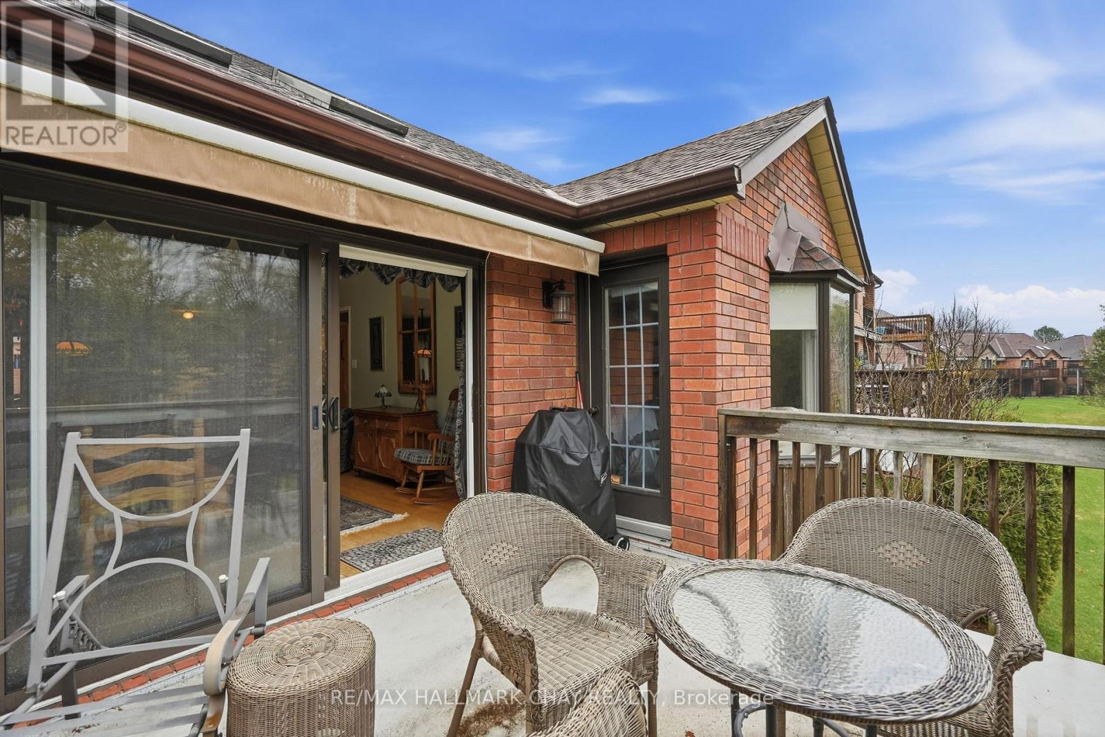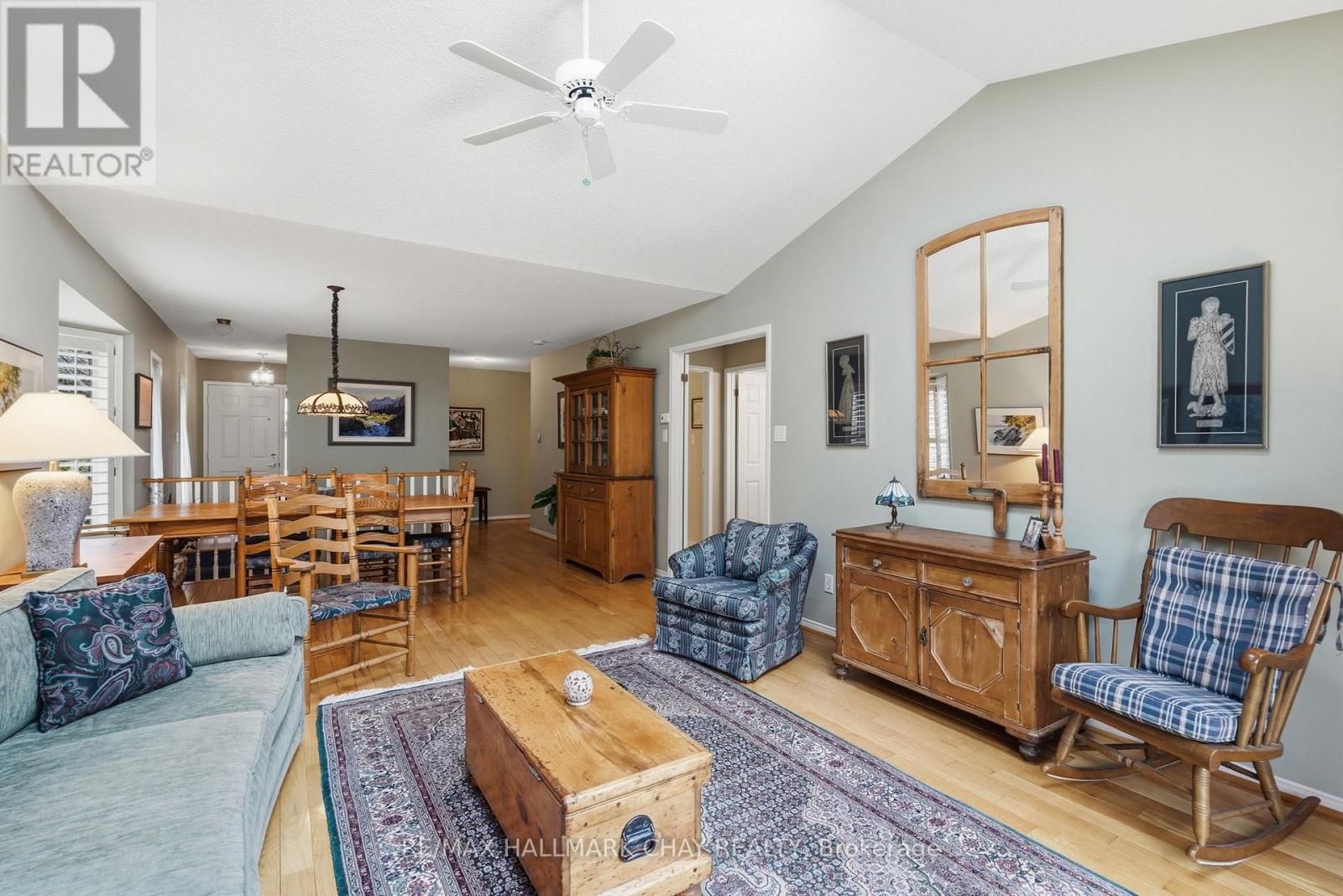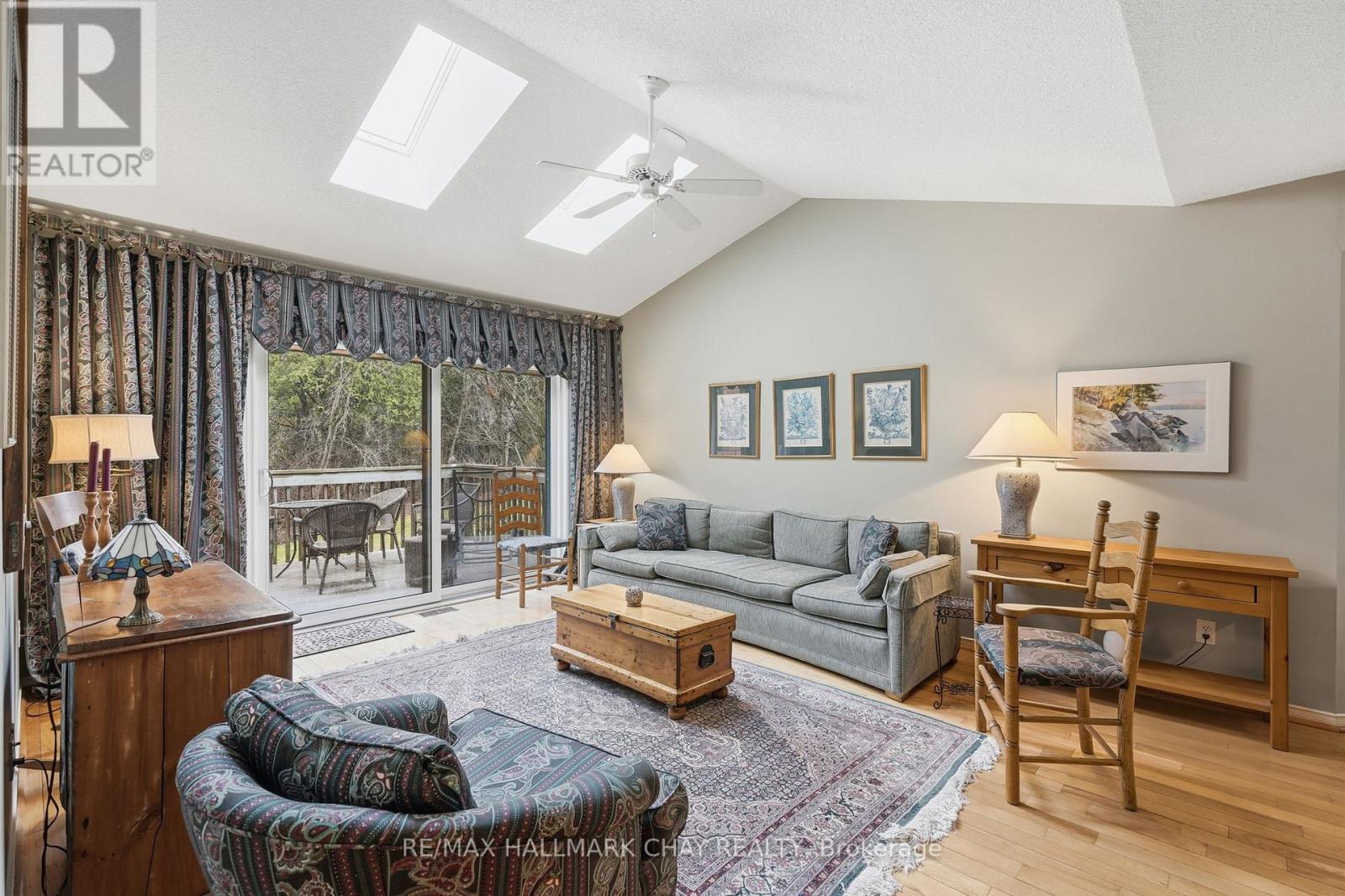 Welcome to Green Briar-an established and highly sought-after adult lifestyle community just steps from the Nottawasaga Golf Course. This beautifully maintained bungalow offers the perfect balance of comfort, space, and low-maintenance living, ideal for those looking to simplify without compromise.A spacious foyer welcomes you into the home, leading into a bright and inviting main living area. The open-concept living and dining room is highlighted by rich hardwood floors, a vaulted ceiling, and a skylight that fills the space with natural light. From here, step out onto the deck overlooking mature trees-creating a peaceful and private outdoor setting.The eat-in kitchen offers a functional layout with ample space for casual dining and everyday living. The primary bedroom is generously sized and features a walk-in closet along with its own walkout to the deck, complete with a gas BBQ hookup-perfect for enjoying quiet mornings or relaxed evenings outdoors. A versatile den on the main floor provides flexibility for a home office, reading room, or guest space, and is complemented by a well-appointed bathroom with a walk-in shower.The fully finished walkout basement extends the living space beautifully, offering a large rec room with a cozy gas fireplace and a dedicated games or hobby nook. Expansive windows allow for plenty of natural light, and the walkout leads to a charming three-season sunroom overlooking the treed surroundings. This level also includes a spacious second bedroom, a full 4-piece bathroom, a finished laundry area, and an abundance of storage.The garage is accessed via a convenient side entry, and the overall setting offers a quiet, community-focused lifestyle surrounded by nature, walking paths, and golf. A wonderful opportunity to enjoy easy living in one of the area's most desirable adult communities. (id:64974)
