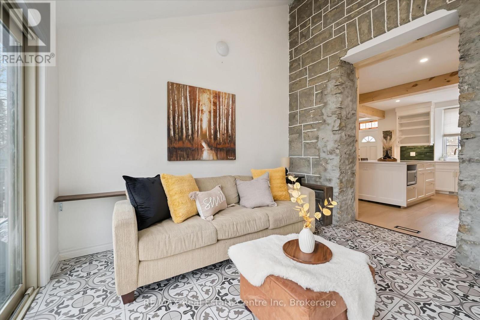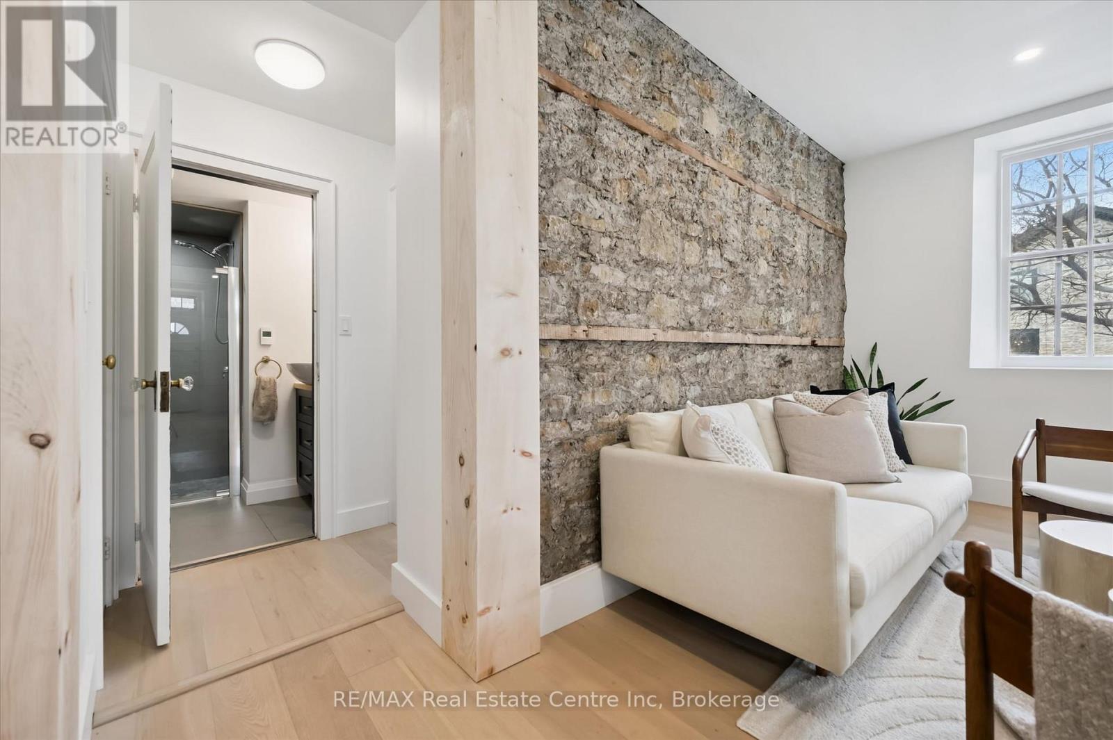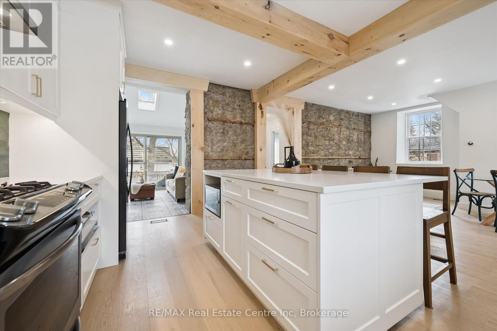 Stunning stone 4 bedroom home with character and charm. This charming 4 bedroom home has been lovingly renovated with a massive, open concept main floor living space. Beamed ceilings, exposed stone walls, new bright white chef's kitchen with quartz countertops and massive island. From the moment you step inside you'll recognize the attention to detail and the love that went into this home. Gleaming neutral hardwood, gorgeous gem toned backsplash, stainless appliances, and so much space! The high ceilings and large windows make this floor inviting and airy. The den, with abundant windows sits just off the kitchen, and a convenient main floor bedroom and newly renovated 3 piece bath with tiled shower and heated floors round out this level. Each end of the home has its own staircase, one to the oversized primary bedroom (with walk in closet) and one to the children's wing. One bedroom upstairs is connected to the primary, perfect for a nursery or office. The second floor bathroom features a clawfoot tub. The backyard is an oasis, with perennial gardens, newer deck and is fully fenced with mature trees, and a private pond. Along the side of the home a concrete pad was poured to double as extra parking and a mini basketball court. The single car garage has been insulated and drywalled and is connected to the home by an interior door. This home is truly the perfect blend of historic elegance with warmth and character, and modern conveniences. (id:64974)