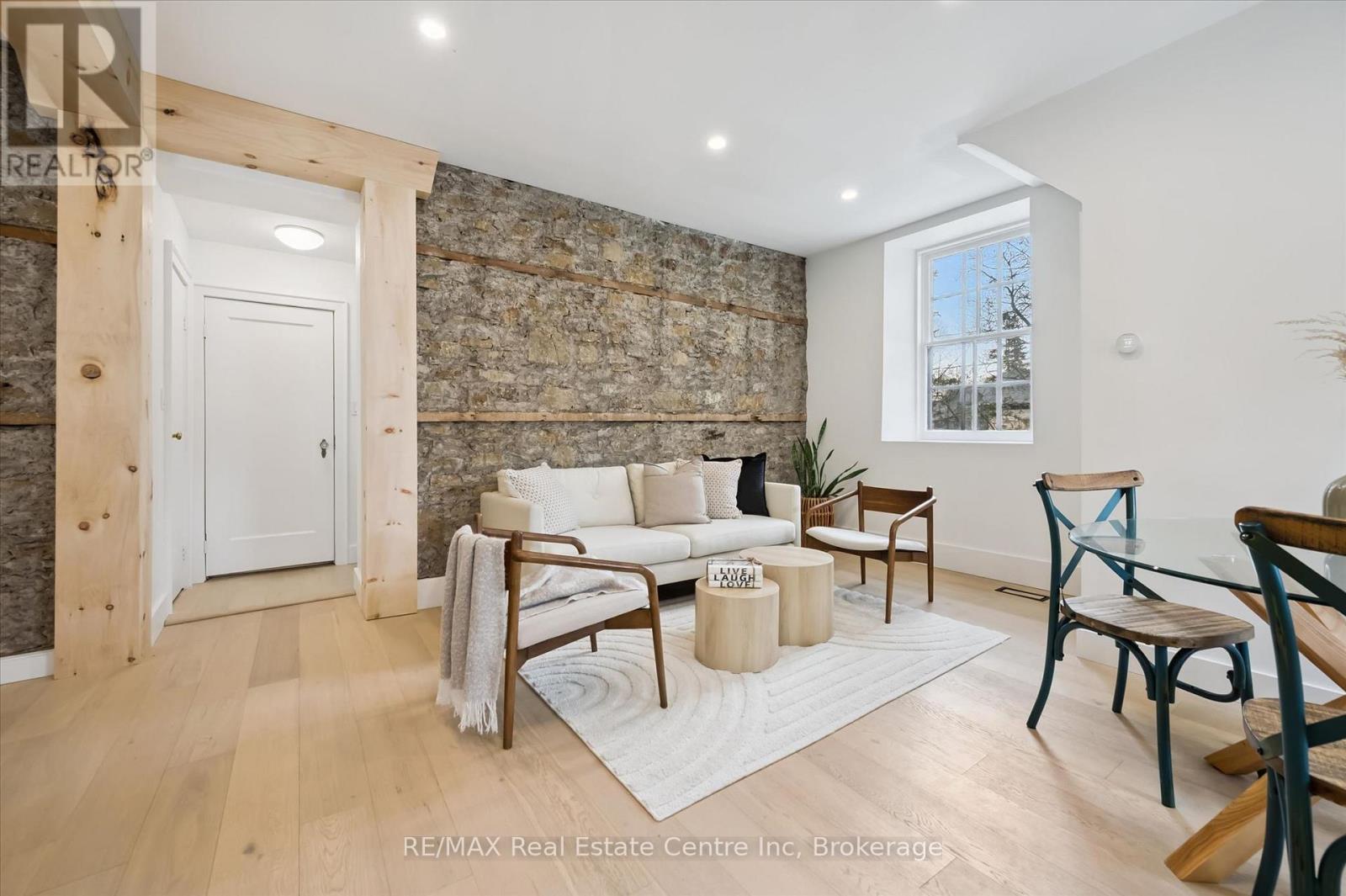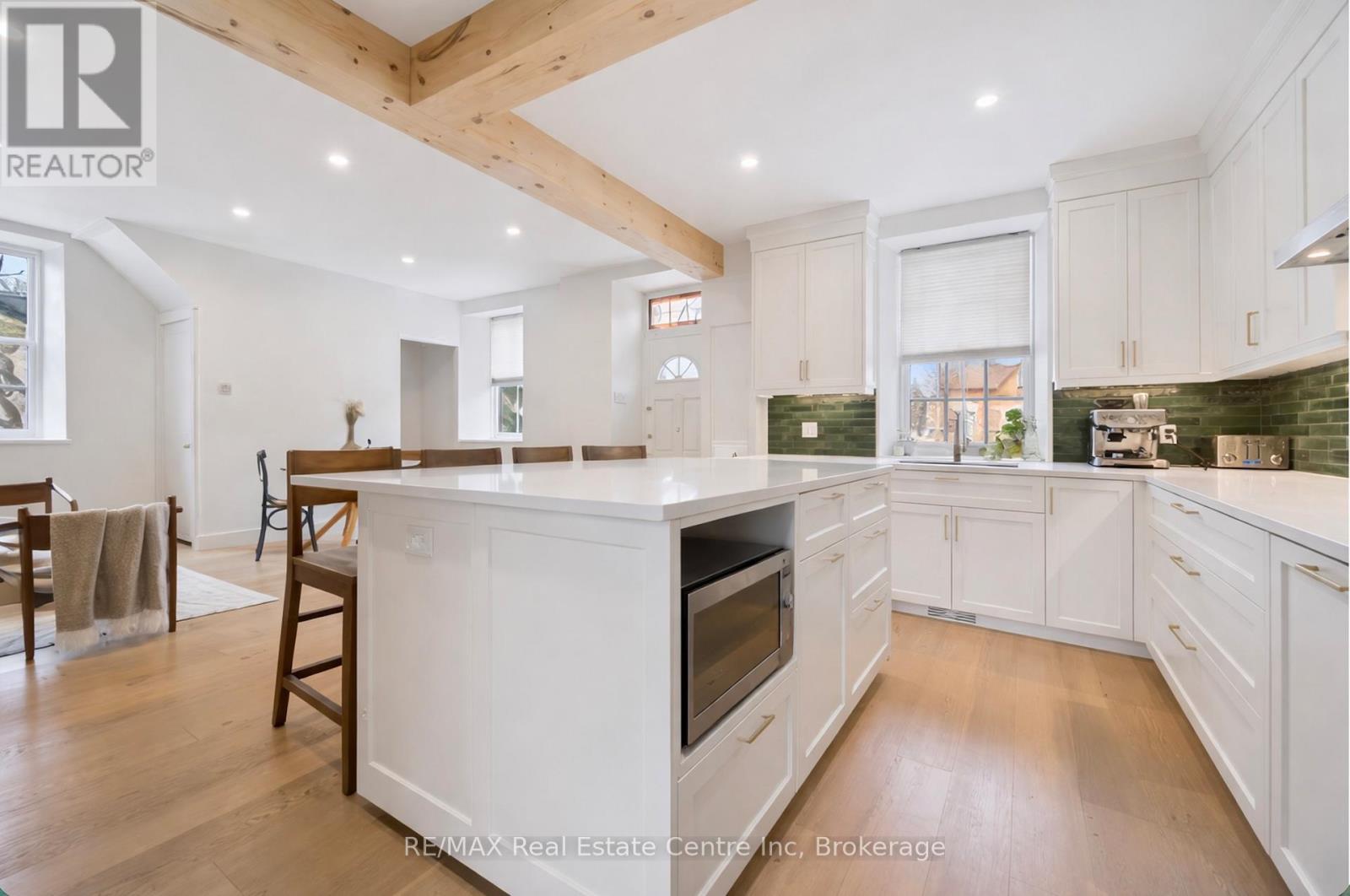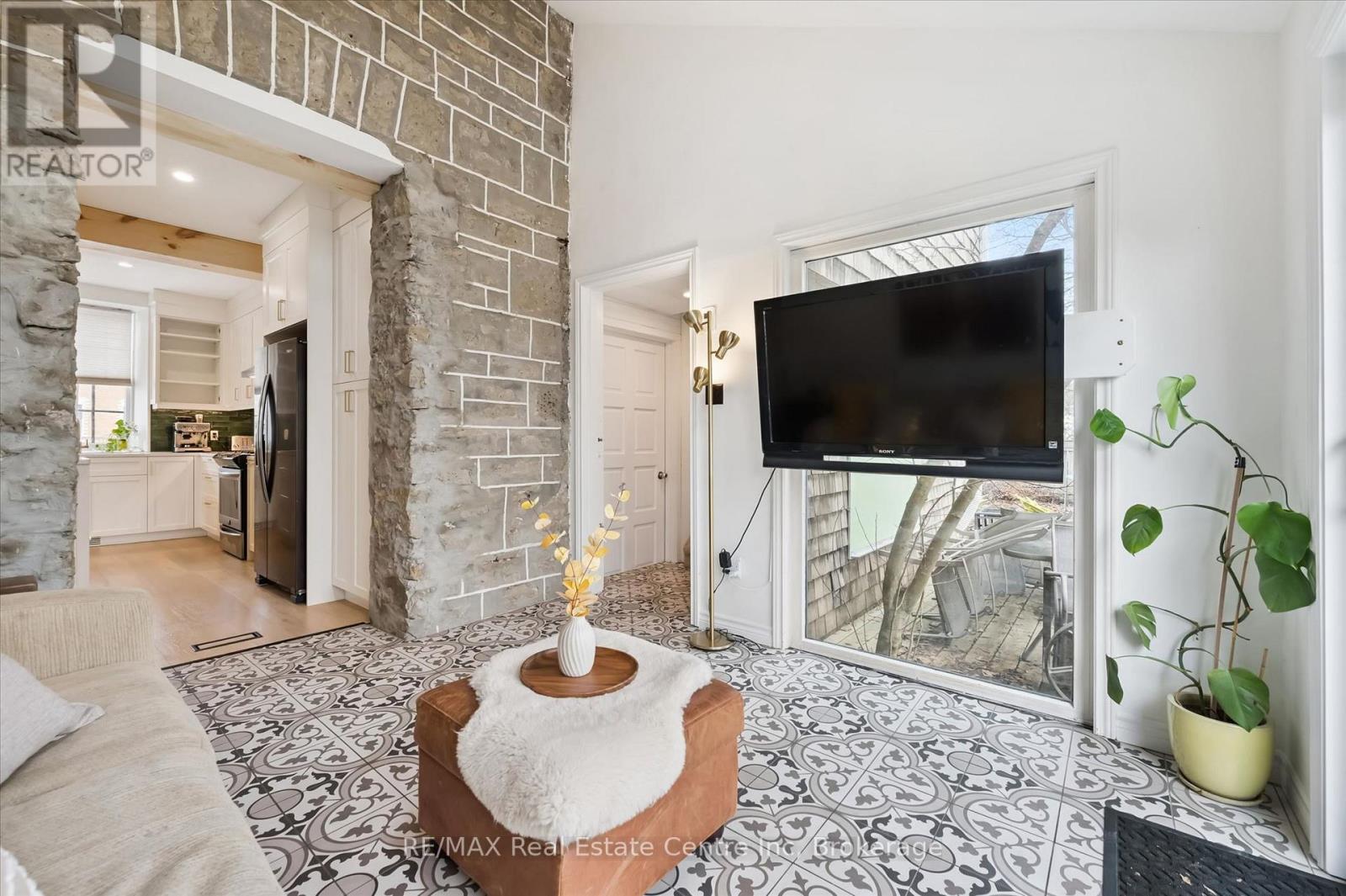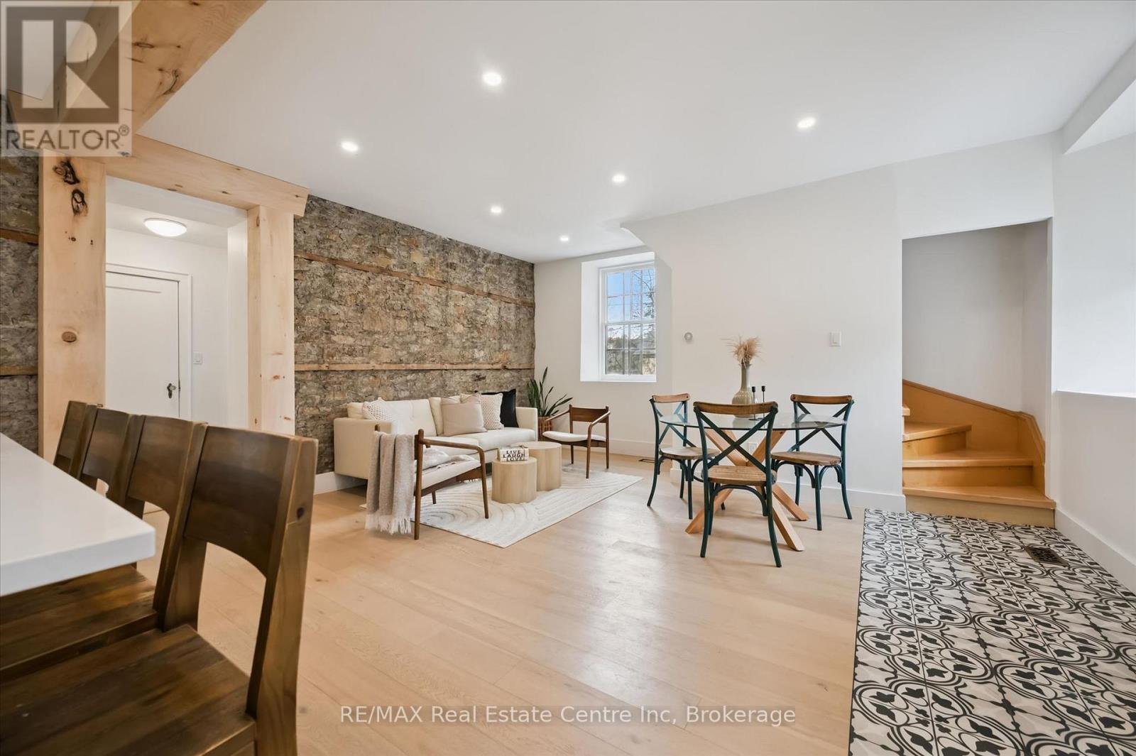 Stunning stone 4 bedroom home with character and charm. This charming 4 bedroom home has been lovingly renovated with a massive, open concept main floor living space. Beamed ceilings, exposed stone walls, new bright white chef's kitchen with quartz countertops and massive island. From the moment you step inside you'll recognize the attention to detail and the love that went into this home. Gleaming neutral hardwood, gorgeous gem toned backsplash, stainless appliances, and so much space! The high ceilings and large windows make this floor inviting and airy. The den, with abundant windows sits just off the kitchen, and a convenient main floor bedroom and newly renovated 3 piece bath with tiled shower and heated floors round out this level. Each end of the home has its own staircase, one to the oversized primary bedroom (with walk in closet) and one to the children's wing. One bedroom upstairs is connected to the primary, perfect for a nursery or office. The second floor bathroom features a clawfoot tub. The backyard is an oasis, with perennial gardens, newer deck and is fully fenced with mature trees, and a private pond. Along the side of the home a concrete pad was poured to double as extra parking and a mini basketball court. The single car garage has been insulated and drywalled and is connected to the home by an interior door. This home is truly the perfect blend of historic elegance with warmth and character, and modern conveniences. (id:64974)