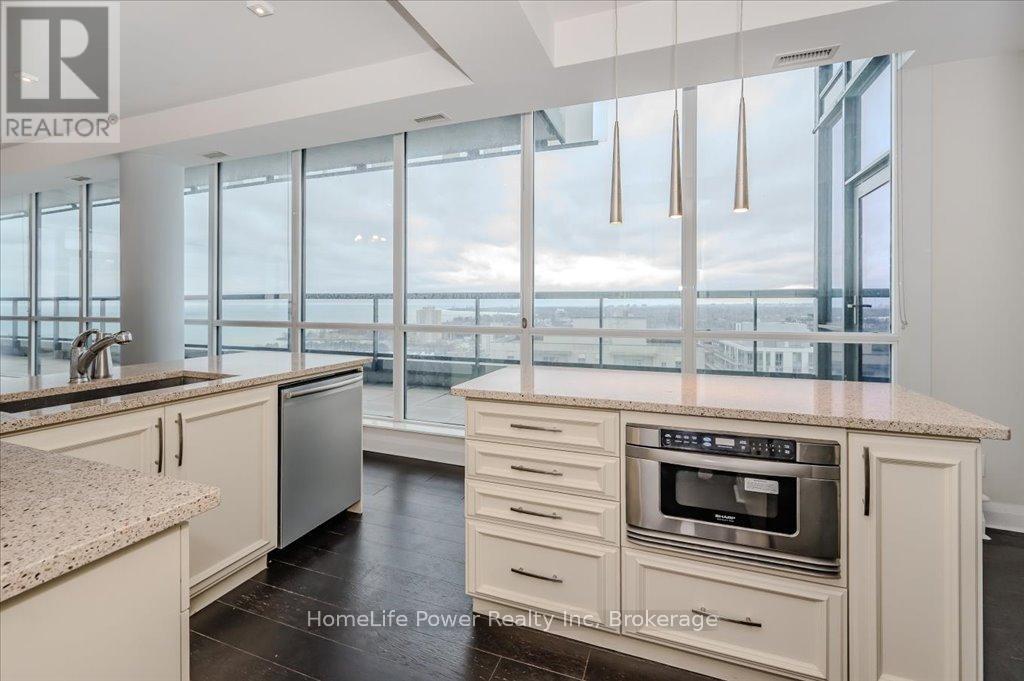 Welcome to Unit 2001 at 1 Hurontario St, an elegant 2-bedroom + den, 2.5-bath, sub-penthouse, offering unparalleled panoramic views of Lake Ontario, the marina, and the Toronto skyline. This 2,280 sq. ft. luxury residence features a spectacular 612 sq. ft. wraparound terrace, perfect for enjoying breathtaking western sunsets over Port Credits waterfront. Inside, you'll find soaring 10-ft ceilings, gleaming hardwood floors, and a modern chefs kitchen with granite countertops. The spacious open-concept layout is flooded with natural light, thanks to floor-to-ceiling windows that frame the stunning views. The primary suite offers a spa-like ensuite and walk-in closet, while the versatile den is ideal for a home office or additional lounge space. With lots of upgrades, this residence embodies waterfront elegance in a thriving village setting, just steps from boutique shops, restaurants, and the GO Train. Residents enjoy state-of-the-art amenities, including a fitness center, two party rooms, a 24-hour concierge, and a rooftop garden terrace. Don't miss this rare opportunity to own a luxurious waterfront home in Port Credits most sought-after condo residence. Schedule your private tour today! (id:64974)