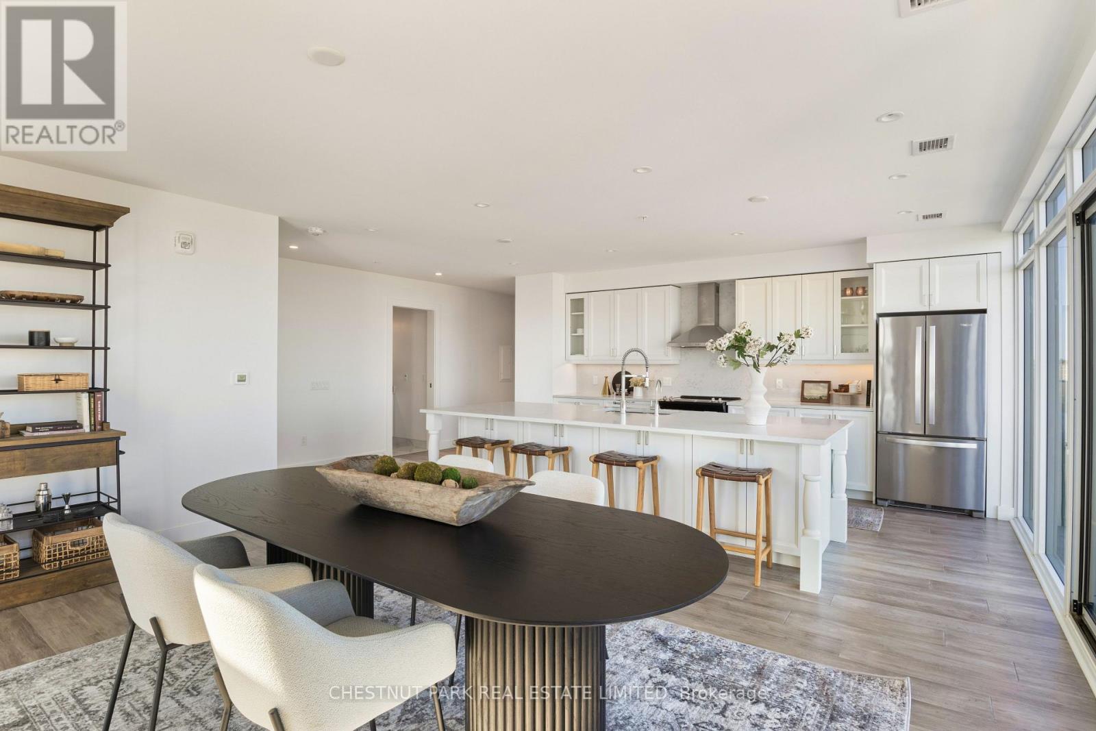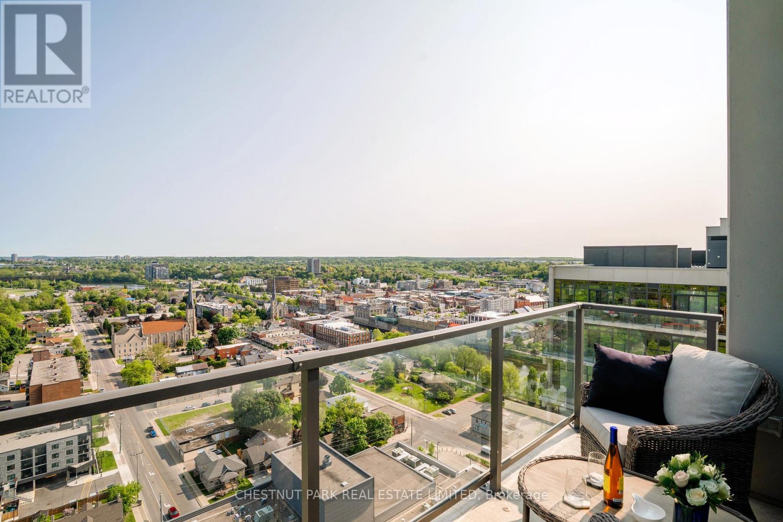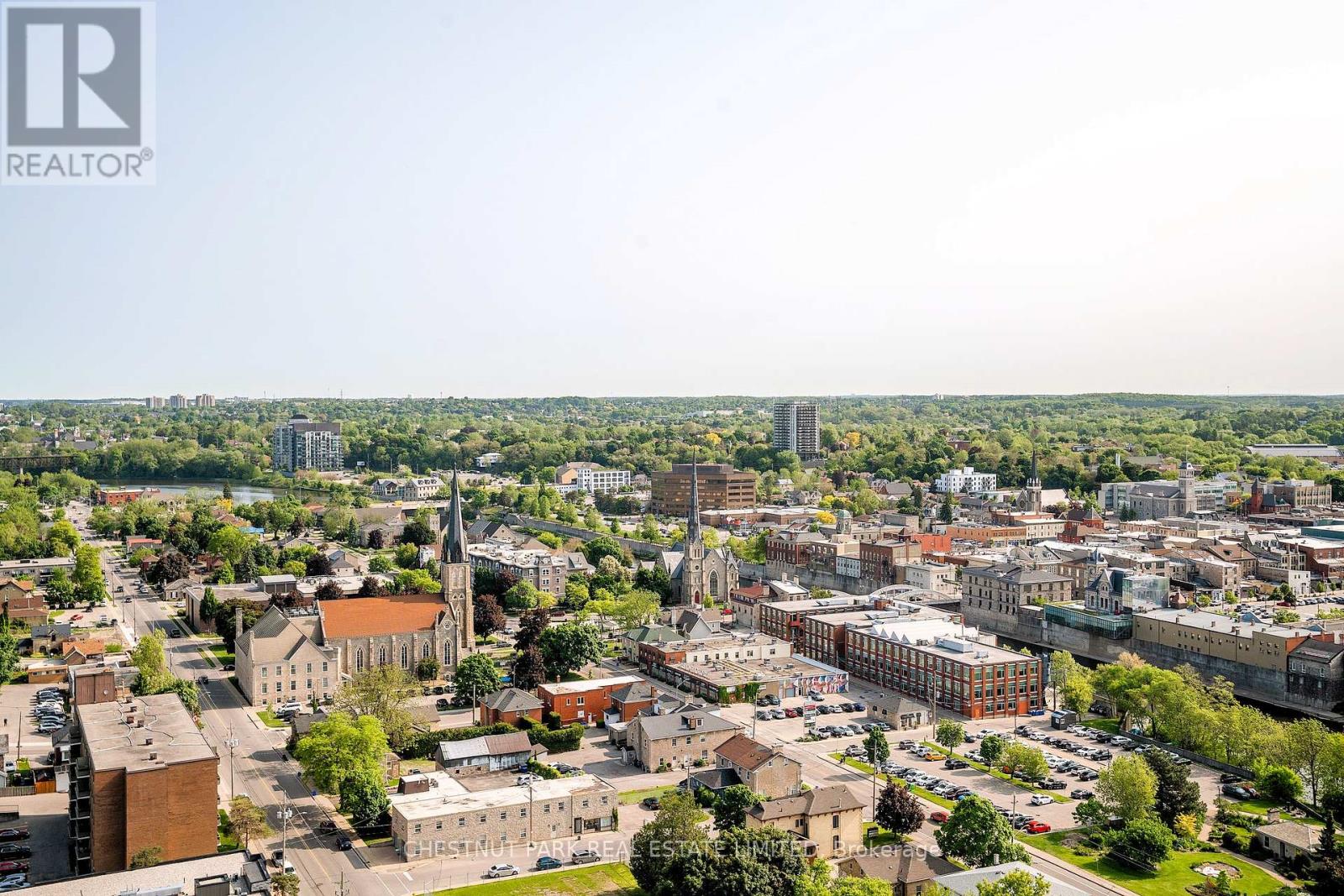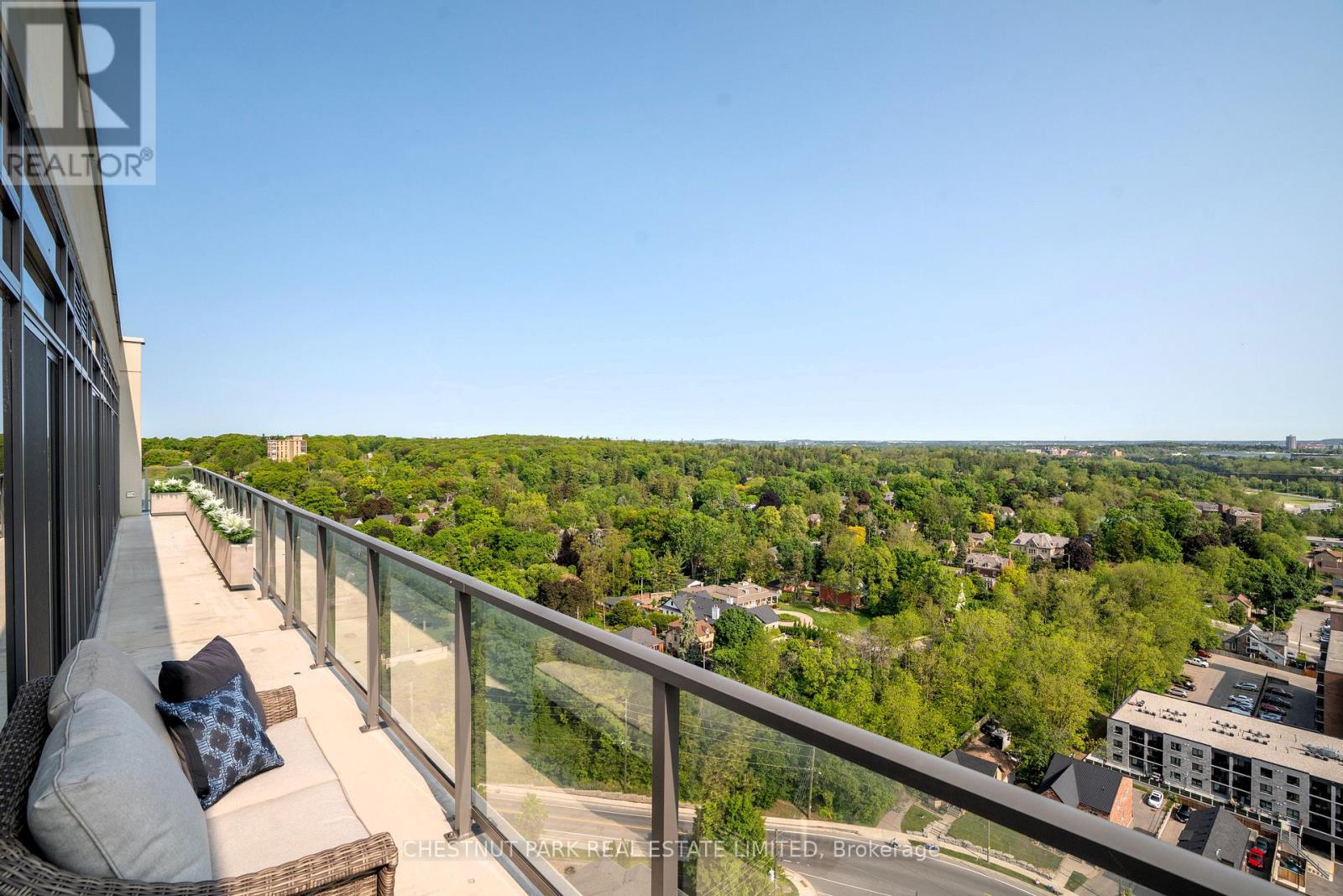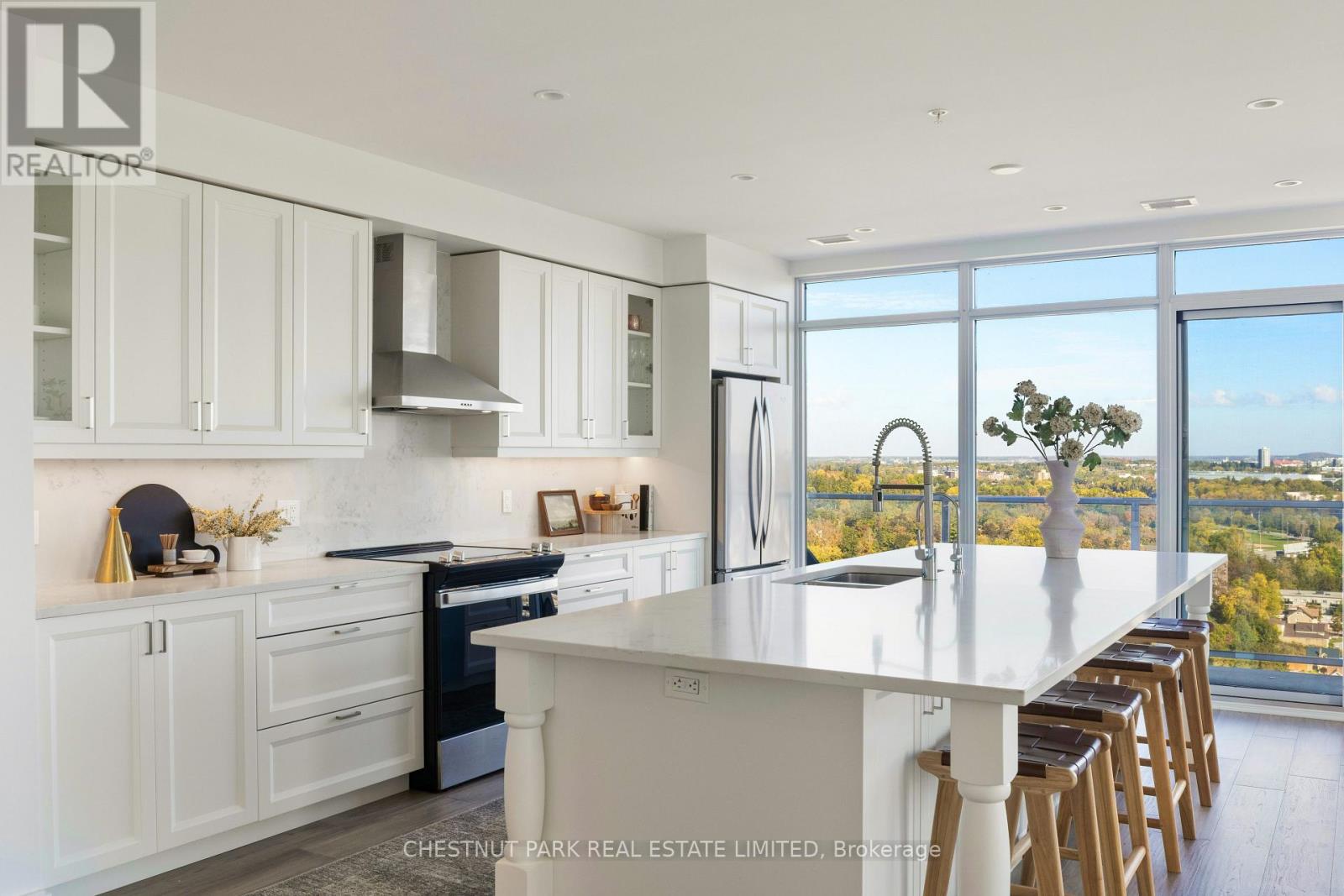 Luxury Penthouse Living in the Heart of the Gaslight District! An extraordinary 2,300 sq. ft. residence created by seamlessly combining two expansive units. Spanning the entire side of the building, this one-of-a-kind three-bedroom, three-bathroom home offers breathtaking panoramic views of historic downtown Cambridge and the Grand River. Step into a grand foyer that opens into a sun-drenched, open-concept living space. Floor-to-ceiling windows bathe the home in natural light, while engineered hardwood floors add warmth and sophistication. The thoughtful layout includes pocket doors in every bedroom, maximizing both space and functionality. At the heart of the home is a chefs dream kitchen, fully upgraded with quartz countertops and backsplash, an oversized island, and premium finishes. Designed for both style and efficiency, this space is perfect for intimate dinners or lavish gatherings. The primary suite is a private retreat, complete with a spacious walk-in closet/dressing area with custom organizers and a large window. The spa-like ensuite boasts a walk-in glass shower and dual sinks, while sliding glass doors provide direct access to the penthouses expansive 100-ft. terrace. The second bedroom features floor-to-ceiling windows, a wall-to-wall closet, and its own private three-piece ensuite. A third generous bedroom currently configured as an office/den offers additional flexibility. This extraordinary residence also features a wraparound balcony accessible from every room, offering spectacular sunrise and sunset views over the city skyline and Grand River. Additional features include two underground parking spaces (one with an EV charging station), two private storage lockers, and access to state-of-the-art amenities: a rooftop terrace, private dining room, fitness center, yoga & Pilates studio, and an elegant lobby. (id:64974)