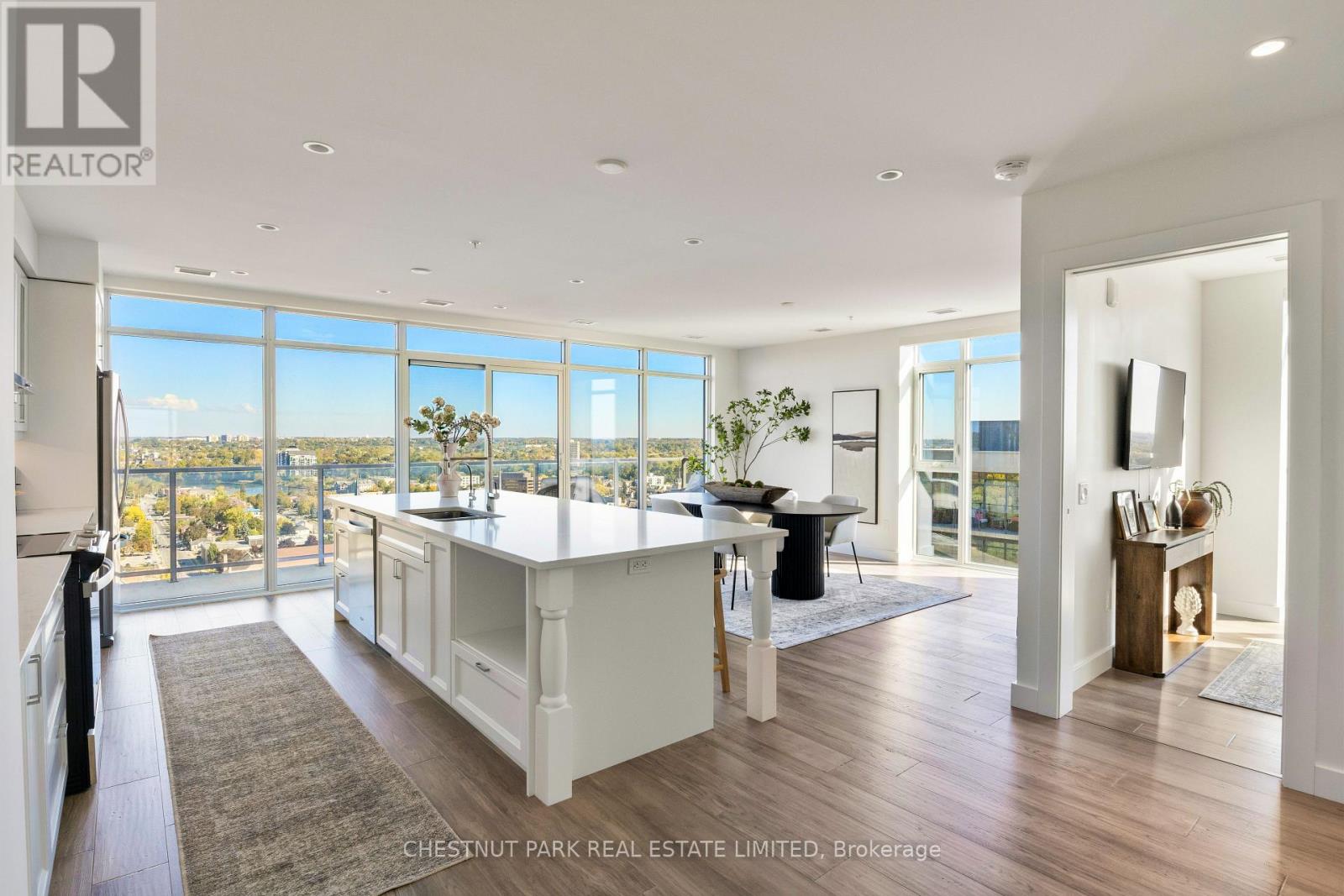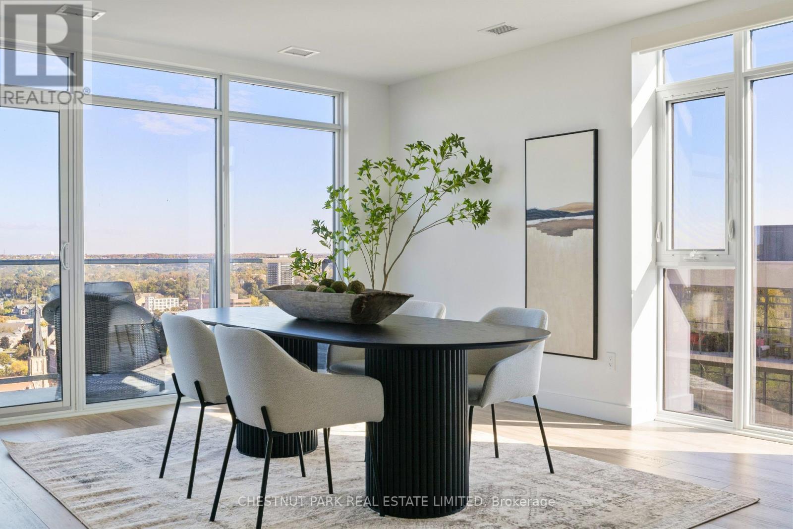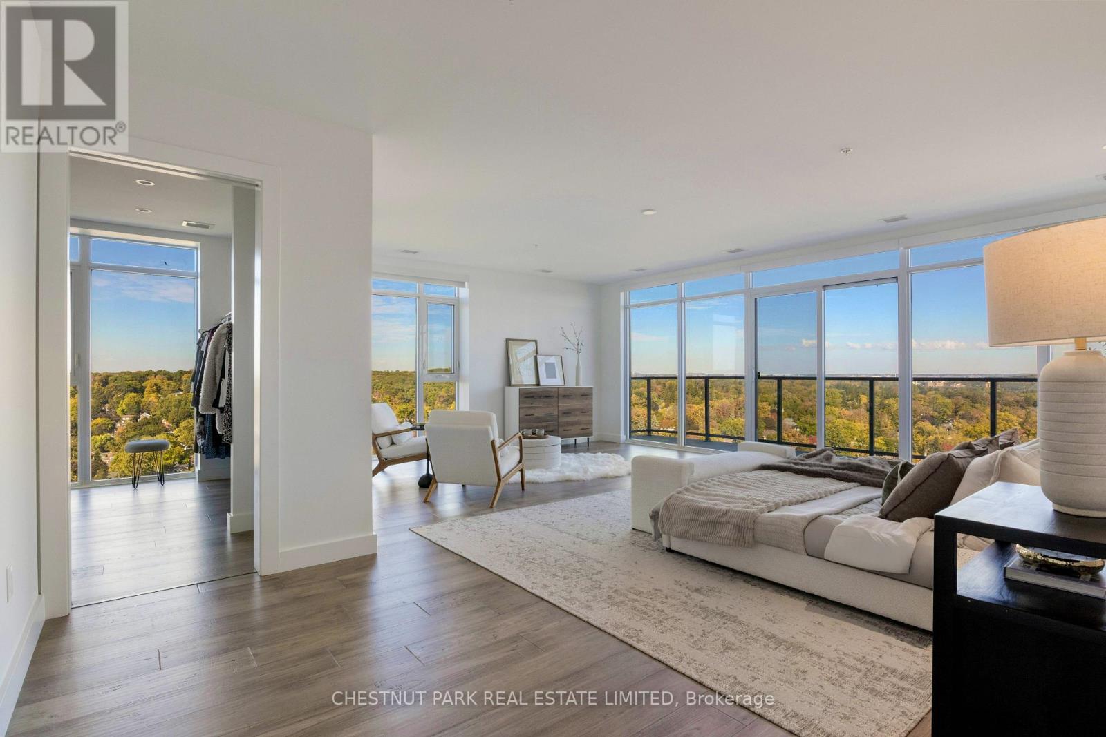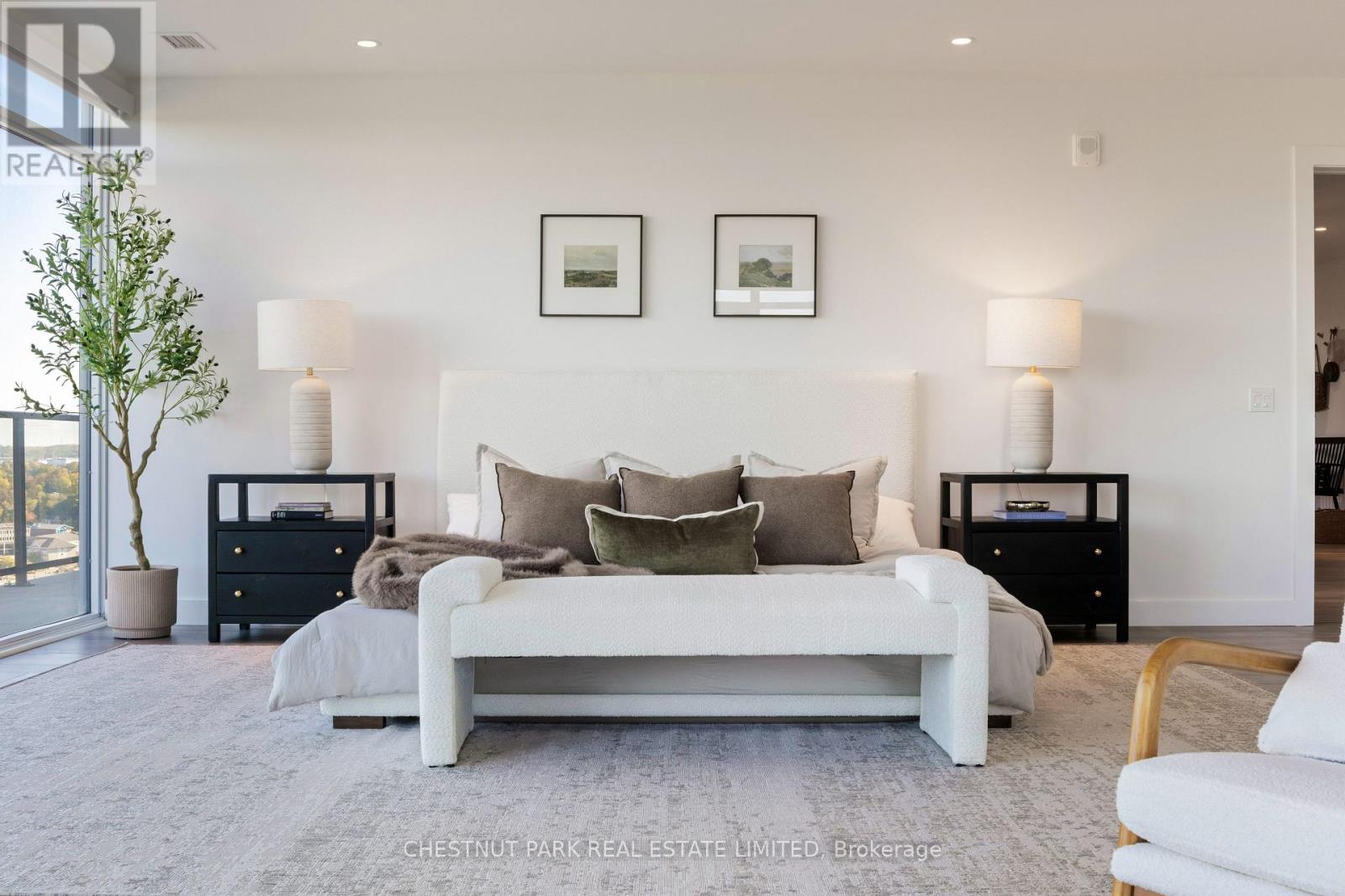 Luxury Penthouse Living in the Heart of the Gaslight District! An extraordinary 2,300 sq. ft. residence created by seamlessly combining two expansive units. Spanning the entire side of the building, this one-of-a-kind three-bedroom, three-bathroom home offers breathtaking panoramic views of historic downtown Cambridge and the Grand River. Step into a grand foyer that opens into a sun-drenched, open-concept living space. Floor-to-ceiling windows bathe the home in natural light, while engineered hardwood floors add warmth and sophistication. The thoughtful layout includes pocket doors in every bedroom, maximizing both space and functionality. At the heart of the home is a chefs dream kitchen, fully upgraded with quartz countertops and backsplash, an oversized island, and premium finishes. Designed for both style and efficiency, this space is perfect for intimate dinners or lavish gatherings. The primary suite is a private retreat, complete with a spacious walk-in closet/dressing area with custom organizers and a large window. The spa-like ensuite boasts a walk-in glass shower and dual sinks, while sliding glass doors provide direct access to the penthouses expansive 100-ft. terrace. The second bedroom features floor-to-ceiling windows, a wall-to-wall closet, and its own private three-piece ensuite. A third generous bedroom currently configured as an office/den offers additional flexibility. This extraordinary residence also features a wraparound balcony accessible from every room, offering spectacular sunrise and sunset views over the city skyline and Grand River. Additional features include two underground parking spaces (one with an EV charging station), two private storage lockers, and access to state-of-the-art amenities: a rooftop terrace, private dining room, fitness center, yoga & Pilates studio, and an elegant lobby. (id:64974)
