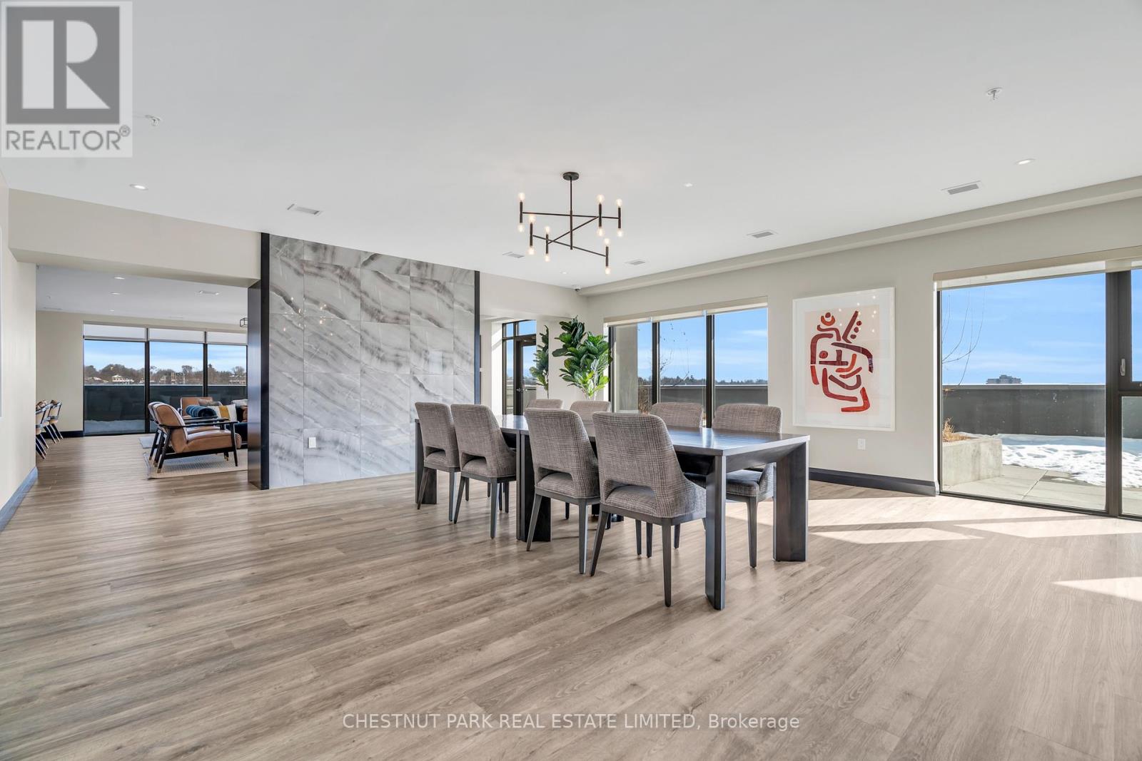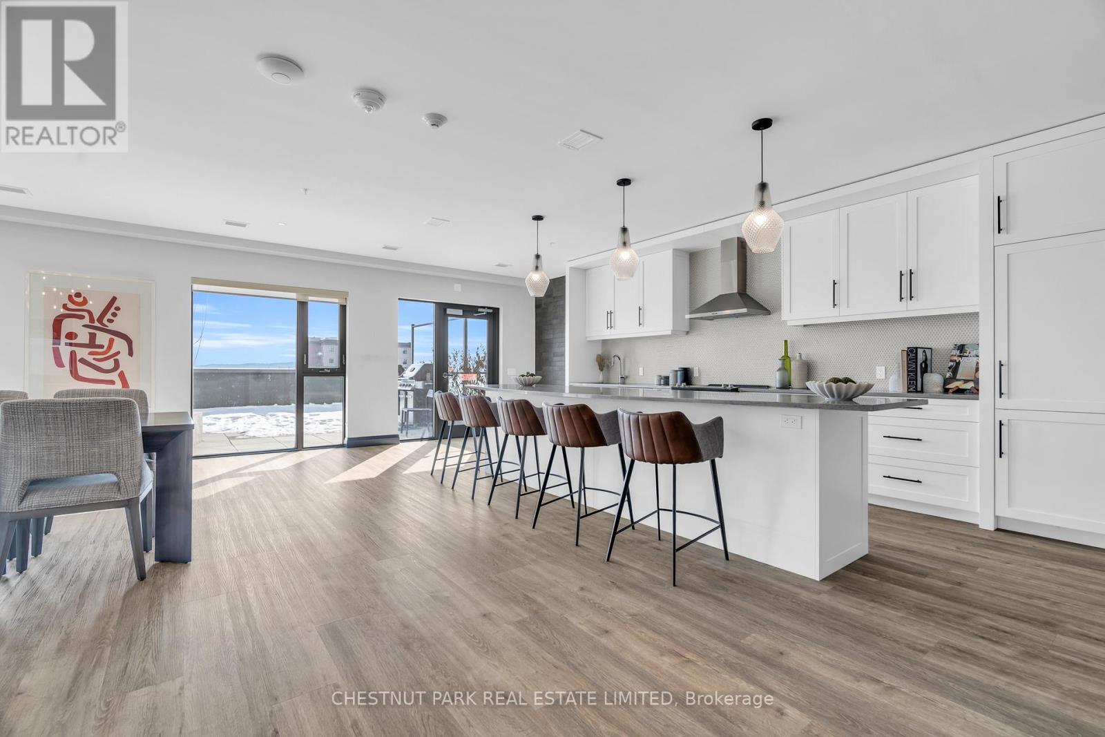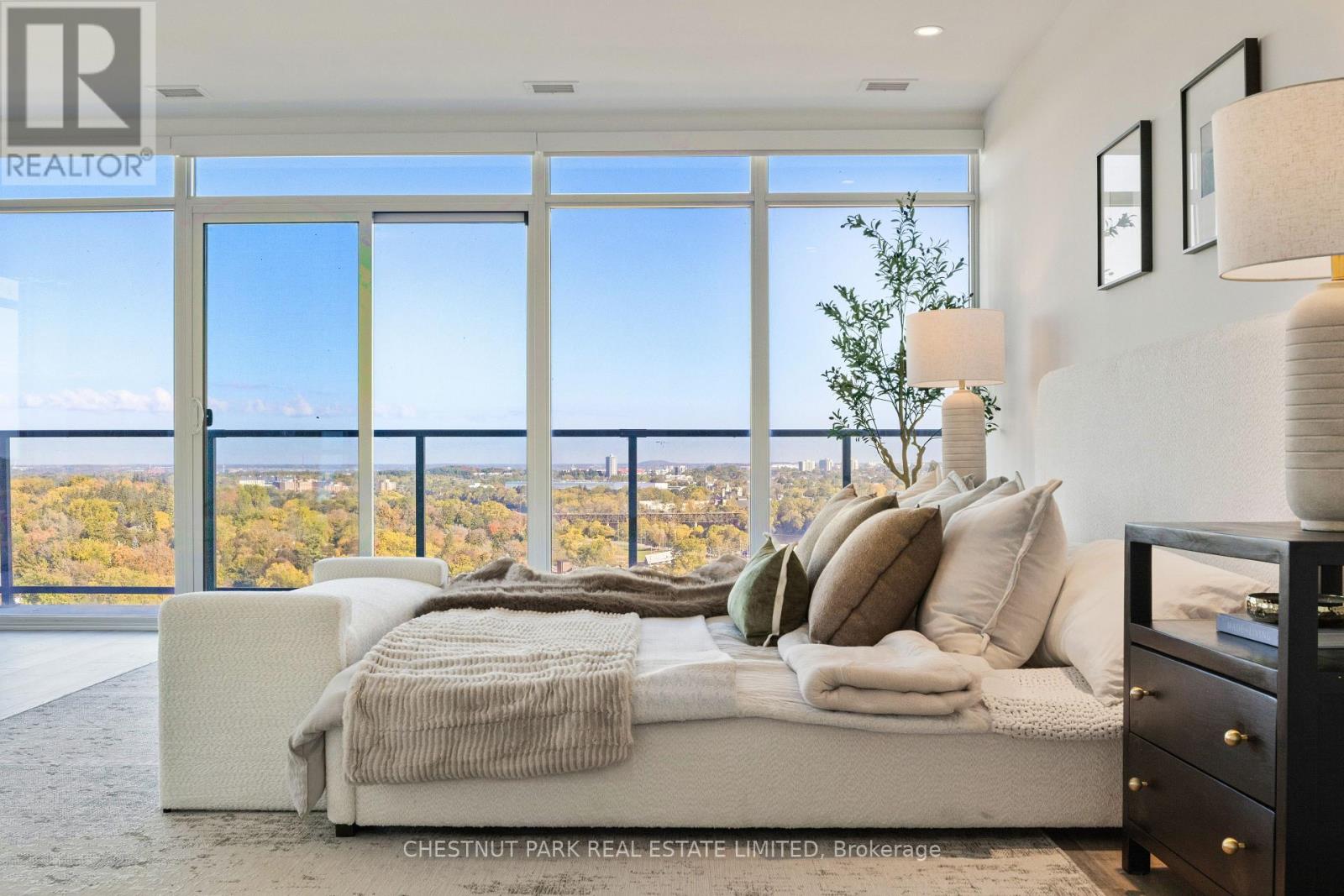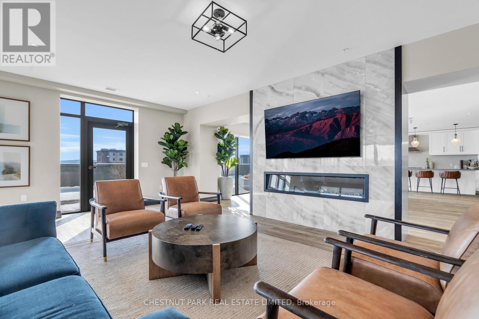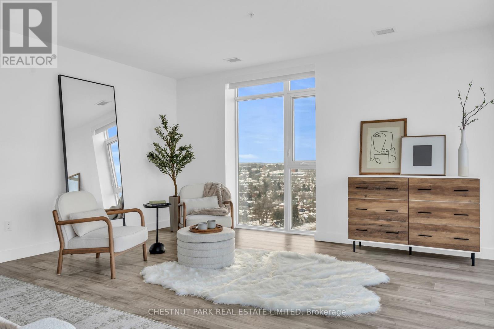 Luxury Penthouse Living in the Heart of the Gaslight District! An extraordinary 2,300 sq. ft. residence created by seamlessly combining two expansive units. Spanning the entire side of the building, this one-of-a-kind three-bedroom, three-bathroom home offers breathtaking panoramic views of historic downtown Cambridge and the Grand River. Step into a grand foyer that opens into a sun-drenched, open-concept living space. Floor-to-ceiling windows bathe the home in natural light, while engineered hardwood floors add warmth and sophistication. The thoughtful layout includes pocket doors in every bedroom, maximizing both space and functionality. At the heart of the home is a chefs dream kitchen, fully upgraded with quartz countertops and backsplash, an oversized island, and premium finishes. Designed for both style and efficiency, this space is perfect for intimate dinners or lavish gatherings. The primary suite is a private retreat, complete with a spacious walk-in closet/dressing area with custom organizers and a large window. The spa-like ensuite boasts a walk-in glass shower and dual sinks, while sliding glass doors provide direct access to the penthouses expansive 100-ft. terrace. The second bedroom features floor-to-ceiling windows, a wall-to-wall closet, and its own private three-piece ensuite. A third generous bedroom currently configured as an office/den offers additional flexibility. This extraordinary residence also features a wraparound balcony accessible from every room, offering spectacular sunrise and sunset views over the city skyline and Grand River. Additional features include two underground parking spaces (one with an EV charging station), two private storage lockers, and access to state-of-the-art amenities: a rooftop terrace, private dining room, fitness center, yoga & Pilates studio, and an elegant lobby. (id:64974)