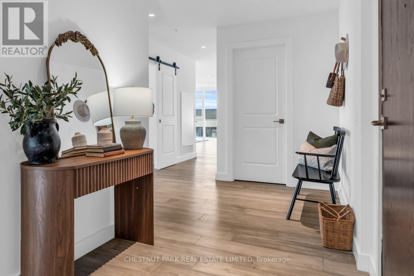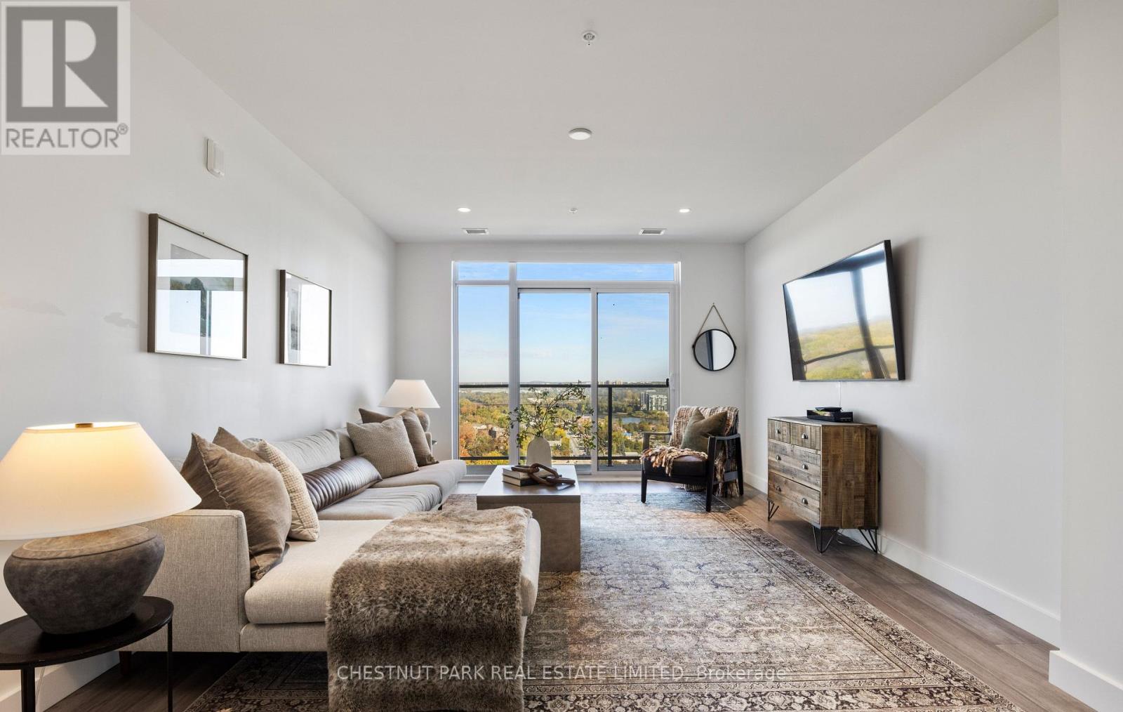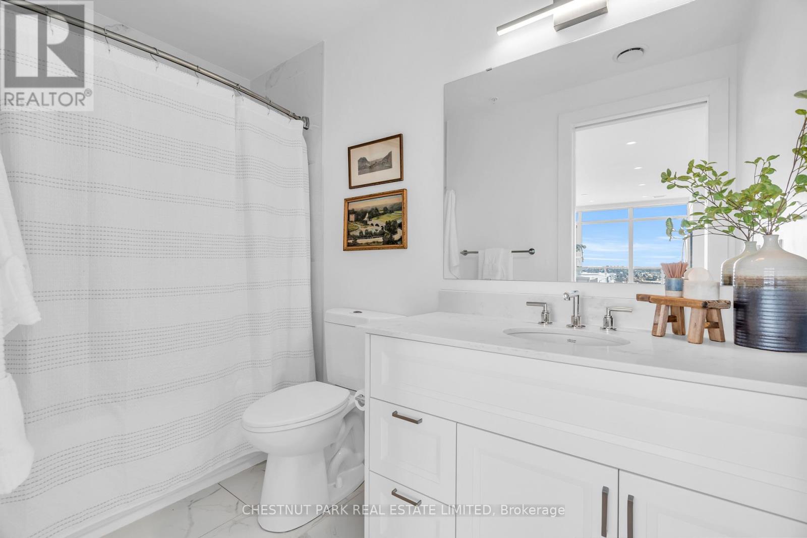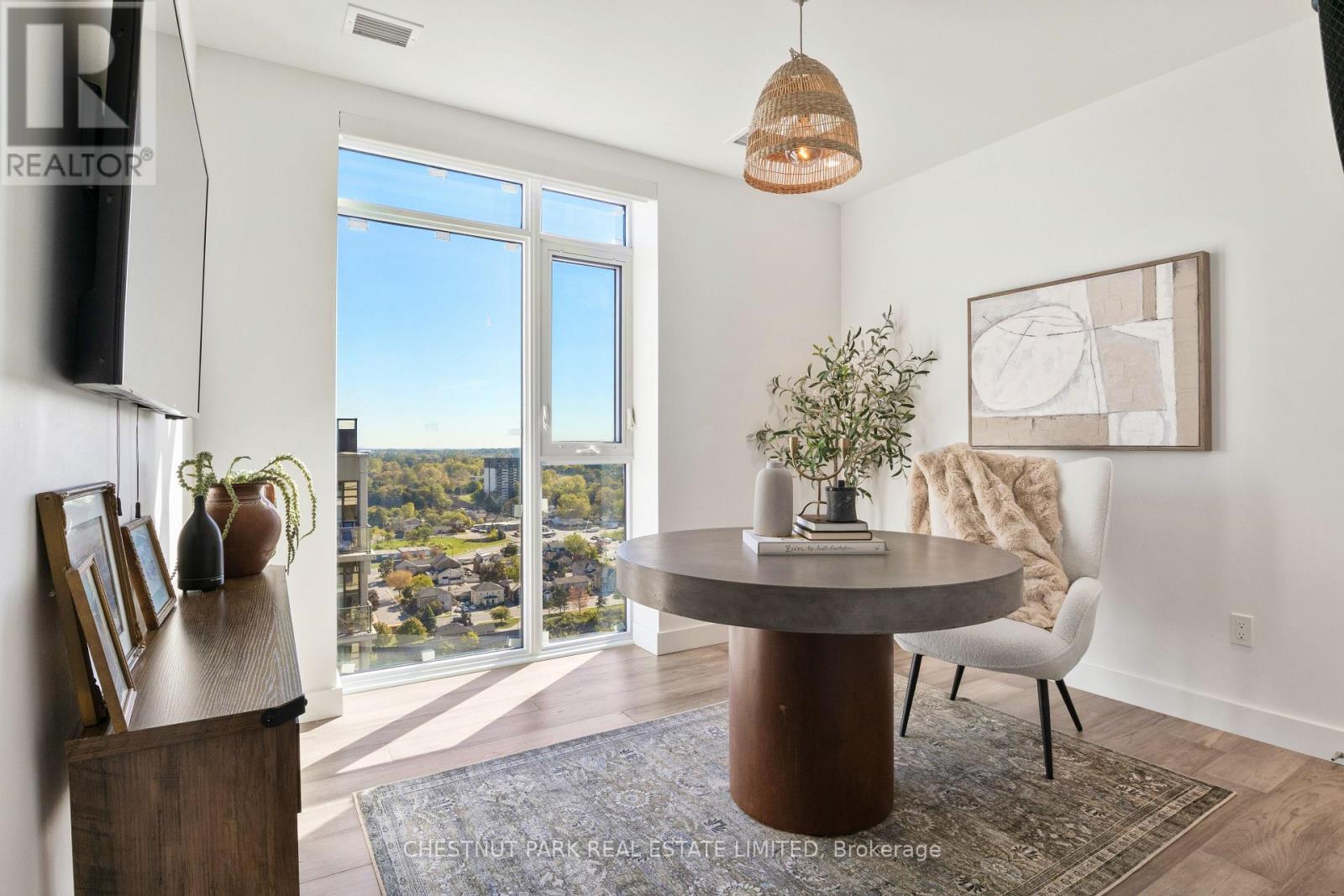 Luxury Penthouse Living in the Heart of the Gaslight District! An extraordinary 2,300 sq. ft. residence created by seamlessly combining two expansive units. Spanning the entire side of the building, this one-of-a-kind three-bedroom, three-bathroom home offers breathtaking panoramic views of historic downtown Cambridge and the Grand River. Step into a grand foyer that opens into a sun-drenched, open-concept living space. Floor-to-ceiling windows bathe the home in natural light, while engineered hardwood floors add warmth and sophistication. The thoughtful layout includes pocket doors in every bedroom, maximizing both space and functionality. At the heart of the home is a chefs dream kitchen, fully upgraded with quartz countertops and backsplash, an oversized island, and premium finishes. Designed for both style and efficiency, this space is perfect for intimate dinners or lavish gatherings. The primary suite is a private retreat, complete with a spacious walk-in closet/dressing area with custom organizers and a large window. The spa-like ensuite boasts a walk-in glass shower and dual sinks, while sliding glass doors provide direct access to the penthouses expansive 100-ft. terrace. The second bedroom features floor-to-ceiling windows, a wall-to-wall closet, and its own private three-piece ensuite. A third generous bedroom currently configured as an office/den offers additional flexibility. This extraordinary residence also features a wraparound balcony accessible from every room, offering spectacular sunrise and sunset views over the city skyline and Grand River. Additional features include two underground parking spaces (one with an EV charging station), two private storage lockers, and access to state-of-the-art amenities: a rooftop terrace, private dining room, fitness center, yoga & Pilates studio, and an elegant lobby. (id:64974)
