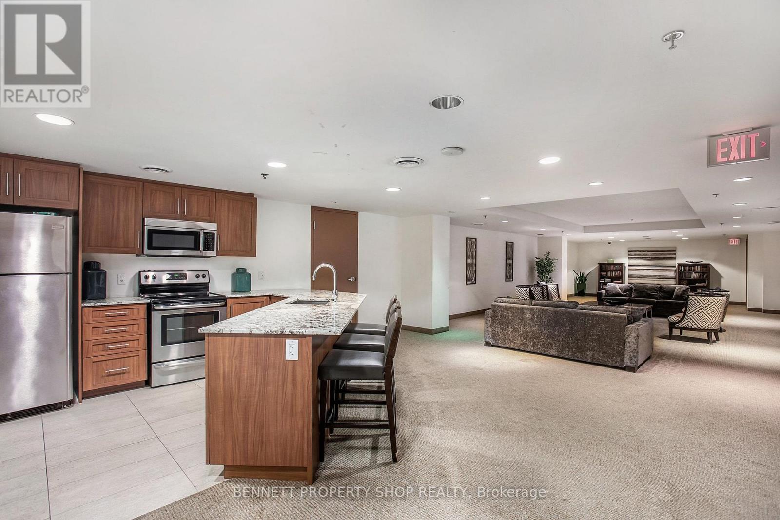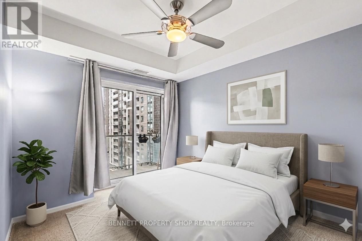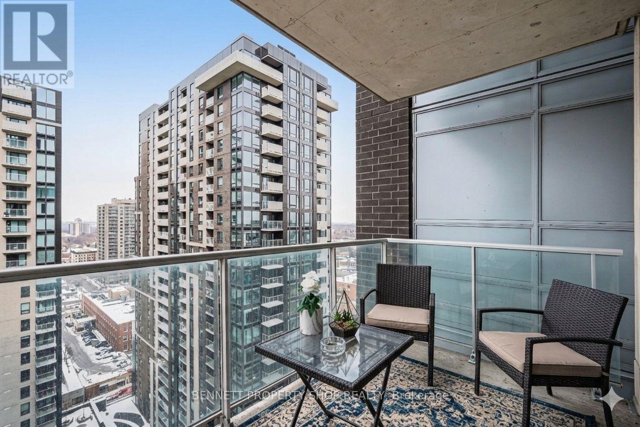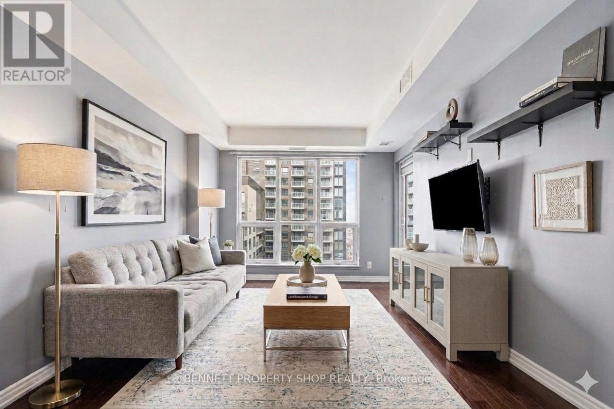 Enjoy downtown living at its best in this stylish 1-bedroom, 1-bathroom condo in sought-after Sandy Hill. The open-concept living and dining area features floor-to-ceiling windows, rich dark hardwood flooring, and direct access to a private balcony, creating a bright and comfortable living space. The kitchen is finished with dark cabinetry, stainless steel appliances, and a convenient breakfast bar that connects seamlessly with the main living area.The generously sized bedroom offers large patio doors with balcony access, providing a quiet and inviting retreat. A spacious full bathroom and in-unit laundry complete the thoughtfully designed layout.Residents enjoy a wide range of amenities, a fitness centre, sauna, indoor pool, party room with full kitchen, and a landscaped outdoor terrace equipped with barbeques.All of this is within walking distance to public transit and LRT stations, the University of Ottawa, Parliament Hill, Rideau Centre, grocery stores, restaurants, and everyday essentials - an ideal setting for comfortable, connected downtown living. 24 hours irrevocable on all offers. Some photos are digitally enhanced. (id:64974)