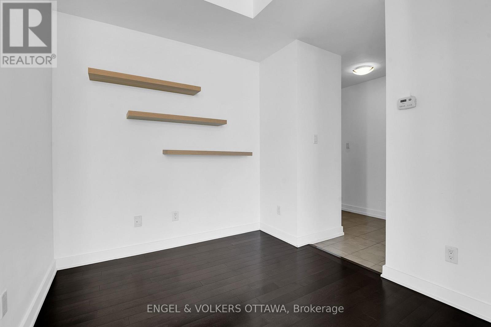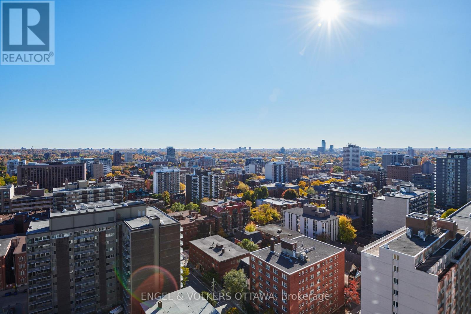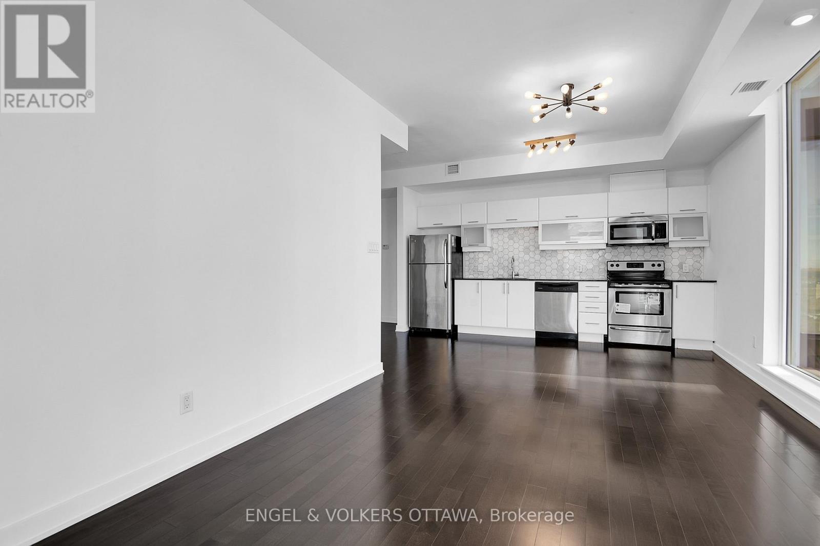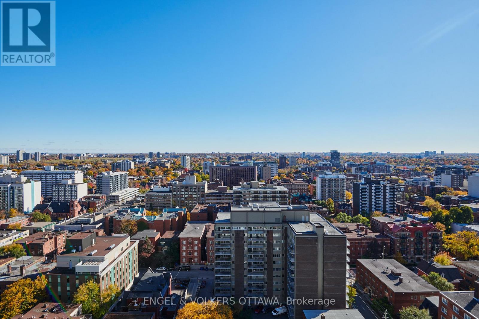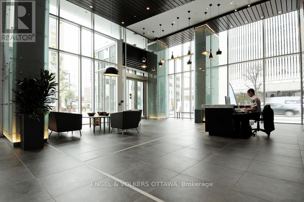 Luxurious 1-bedroom + den CORNER unit, spanning 805 sq. ft.-one of the largest 1 bed. floor plans in its collection. This sophisticated residence offers an open-concept layout with floor-to-ceiling windows that provide million-dollar, unobstructed downtown views from the 20th floor. The custom kitchen is equipped with granite countertops, a beautiful new backsplash, and elegant white cabinetry. Sliding doors open to a private balcony, perfect for enjoying the city scape. The versatile office/den area is conveniently located to the right of the kitchen. The large primary bedroom boasts a corner window and a dedicated study area. Additional features include in-suite laundry (2024), custom roller blinds (2025), hardwood floors, and updated light fixtures throughout the unit. A parking space and storage locker are also included. Residents will enjoy an array of amenities, including a 24-hour concierge/security service, a guest suite, a terrace, an outdoor patio with BBQs, an indoor pool, a gym, and a conference room. For ultimate convenience, Farm Boy is located on the ground level, with amazing restaurants and an LCBO just steps away. The building offers quick access to Parliament Hill, Rideau Centre, the University of Ottawa, and the Financial District. (id:64974)