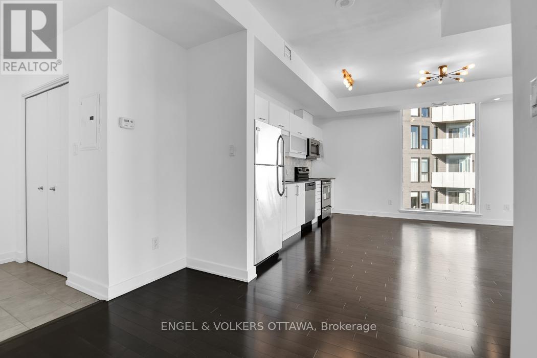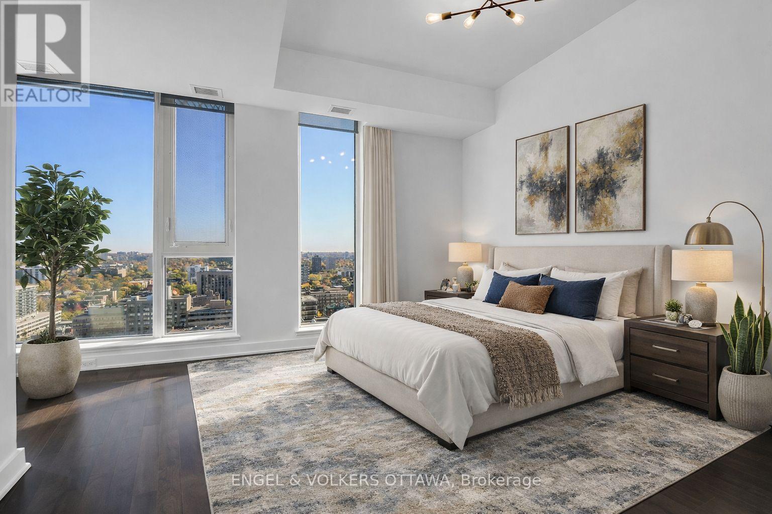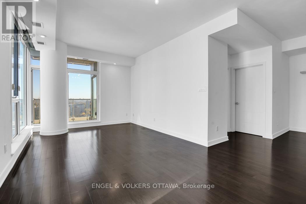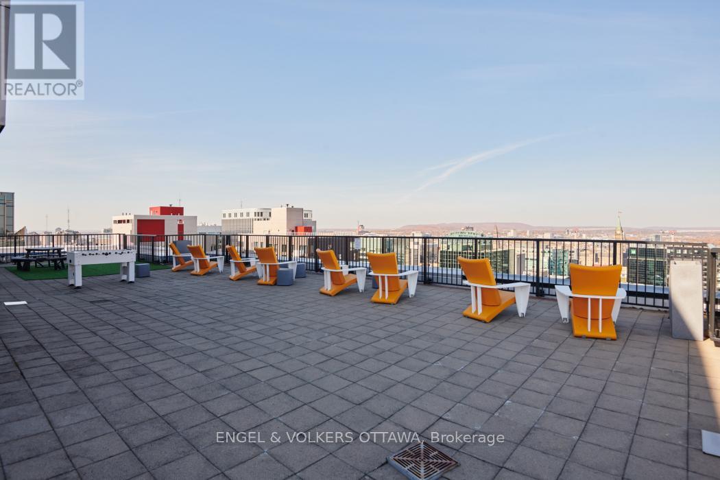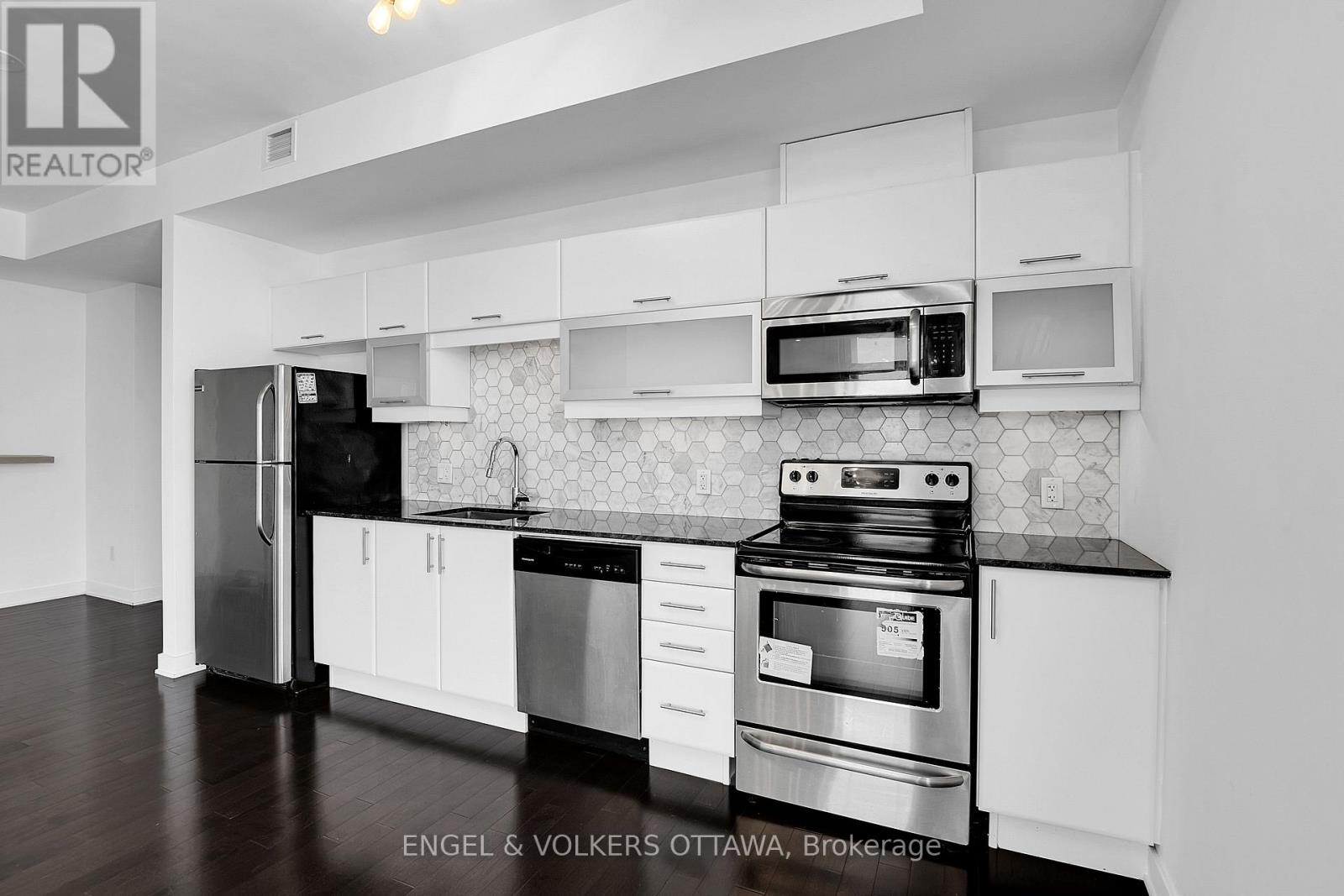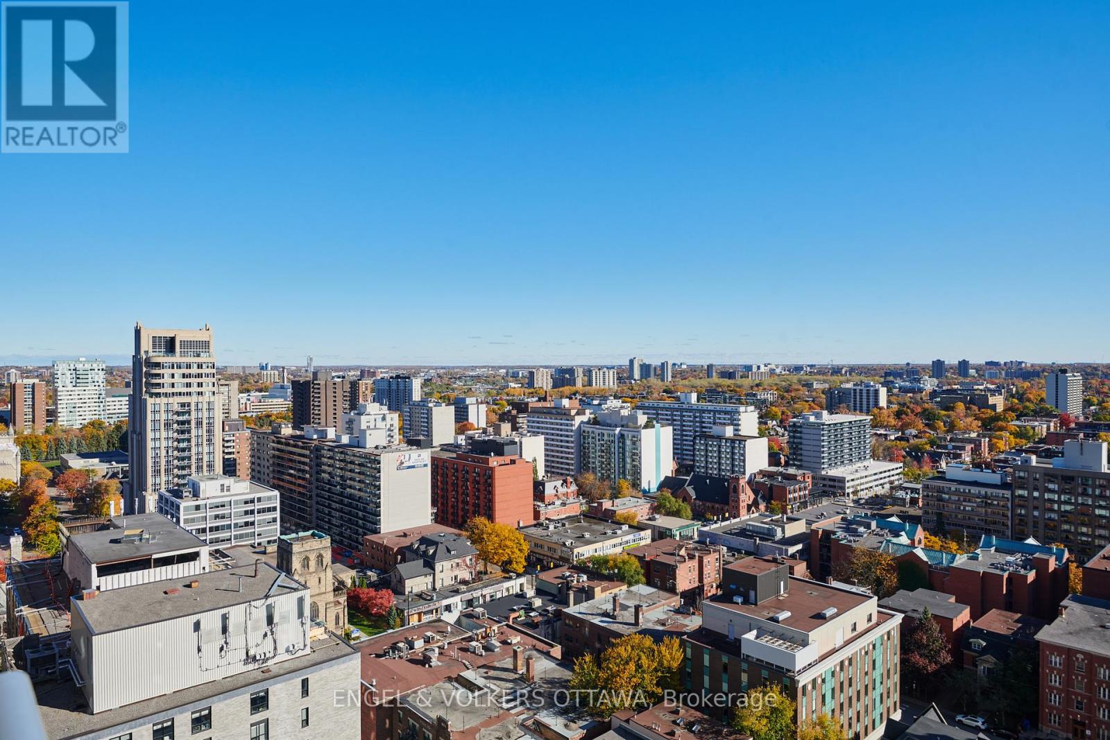 Luxurious 1-bedroom + den CORNER unit, spanning 805 sq. ft.-one of the largest 1 bed. floor plans in its collection. This sophisticated residence offers an open-concept layout with floor-to-ceiling windows that provide million-dollar, unobstructed downtown views from the 20th floor. The custom kitchen is equipped with granite countertops, a beautiful new backsplash, and elegant white cabinetry. Sliding doors open to a private balcony, perfect for enjoying the city scape. The versatile office/den area is conveniently located to the right of the kitchen. The large primary bedroom boasts a corner window and a dedicated study area. Additional features include in-suite laundry (2024), custom roller blinds (2025), hardwood floors, and updated light fixtures throughout the unit. A parking space and storage locker are also included. Residents will enjoy an array of amenities, including a 24-hour concierge/security service, a guest suite, a terrace, an outdoor patio with BBQs, an indoor pool, a gym, and a conference room. For ultimate convenience, Farm Boy is located on the ground level, with amazing restaurants and an LCBO just steps away. The building offers quick access to Parliament Hill, Rideau Centre, the University of Ottawa, and the Financial District. (id:64974)