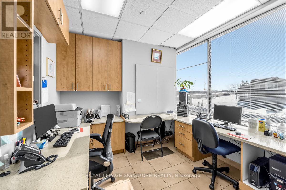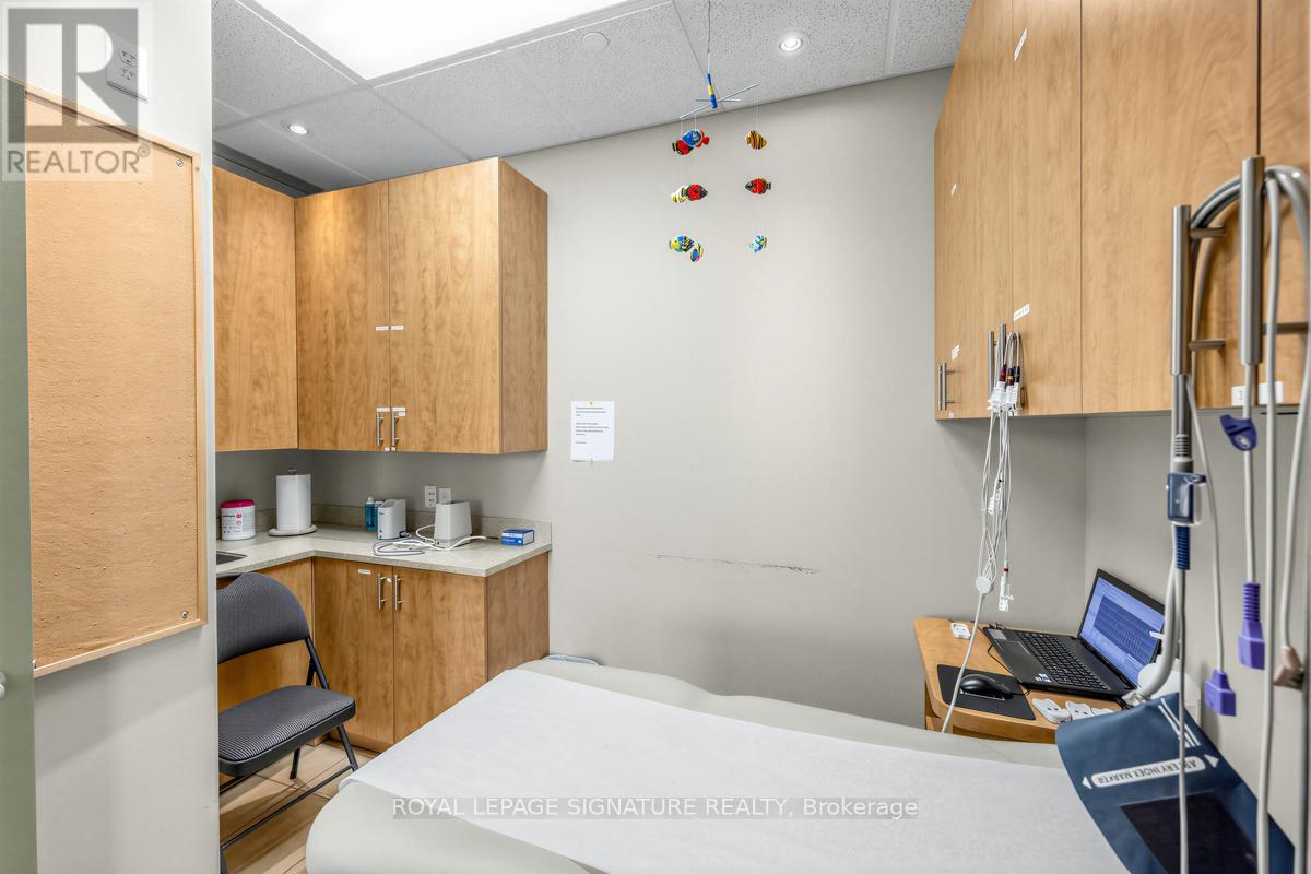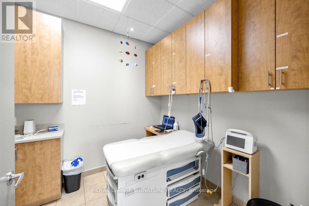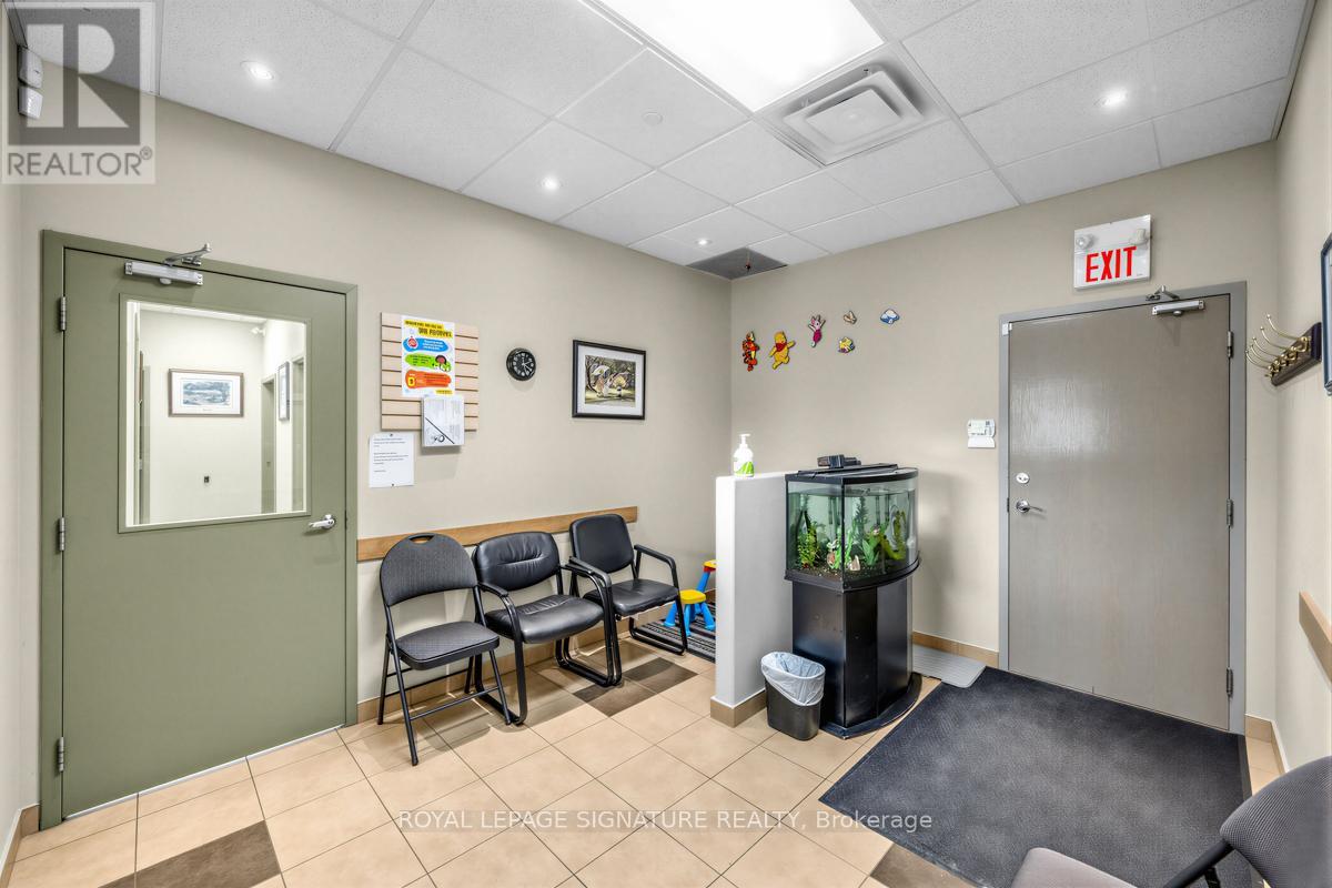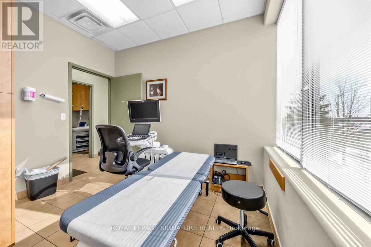 Bright, professional and well-appointed corner unit ideal for a medical specialist or general office use. Currently configured as a turnkey medical office featuring three private patient rooms, a welcoming reception area, and a spacious waiting room. The unit also includes an ensuite washroom and kitchenette for added convenience. Enjoy abundant natural light through large west-facing windows - most offices benefit from a window view. Positioned on a high-traffic corner, this property offers excellent visibility and accessibility with ample on-site parking for staff and clients alike. Situated within a thriving medical hub alongside complementary tenants including a pharmacy, large family practice and medical labs, making this an exceptional opportunity for any specialist looking to establish or grow their practice. Flexible zoning permits both medical and general office use. (id:64974)