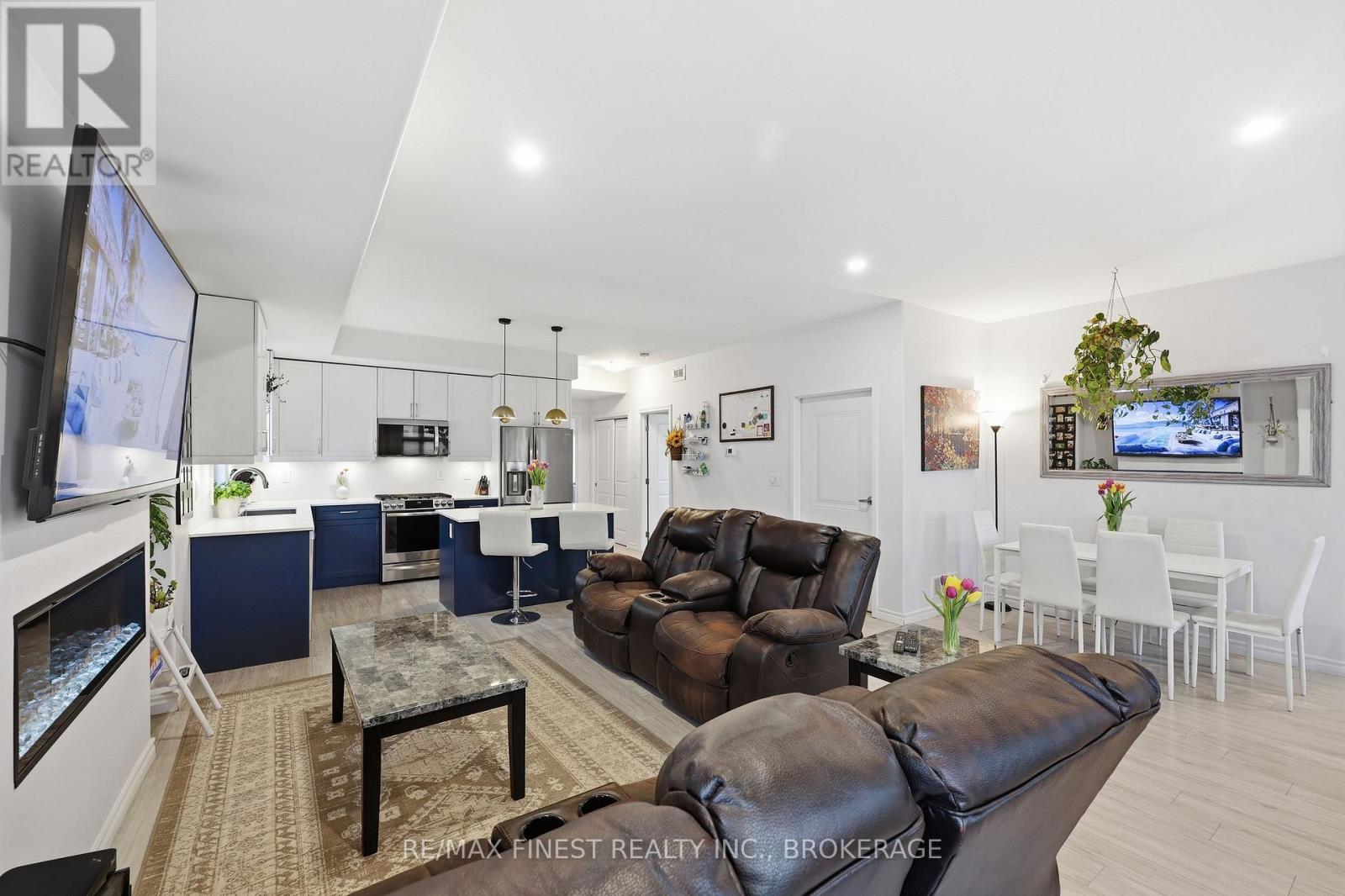 Welcome to 1015 Terra Verde Way, Unit 201. A rare opportunity to own in the sought-after Terra Verde community. This spacious 3-bedroom, 2-bath end unit stacked townhouse offers a generous 1,825 sqft. of living space. The open-concept main level features a modern kitchen with stainless steel appliances, gas range, and a large island, flowing seamlessly into the bright living and dining areas complete with an electric fireplace and is perfect for entertaining. The main level also includes two bedrooms, a full 4-piece bathroom, and convenient in-unit laundry, offering flexible space for guests, family, or a home office. The upper level is dedicated to the primary bedroom, featuring a walk-in closet, a 5-piece ensuite, and access to a private balcony. Additional highlights include carpet-free flooring throughout, a heated garage with space for two vehicles plus storage, and a dedicated additional outdoor parking space. Ideally located with direct access to the K&P Trail, nearby parks, shared pathways, and within walking distance to restaurants, cafés, and a daycare, this home offers the perfect balance of lifestyle, convenience, and low-maintenance living. (id:64974)