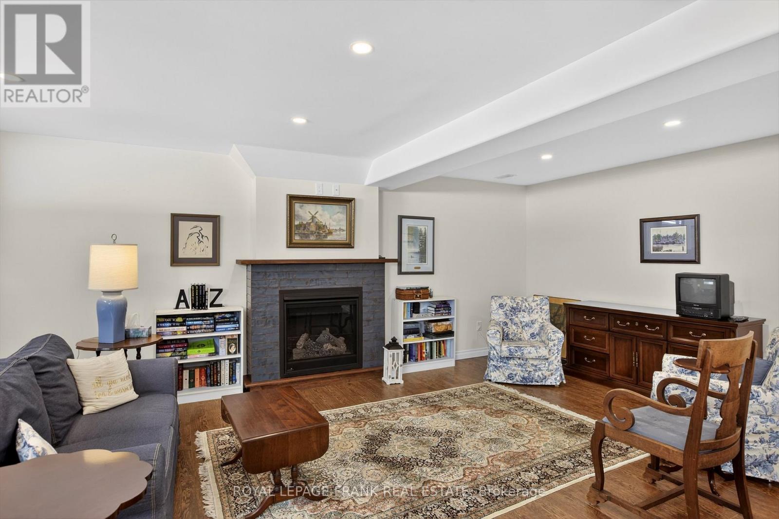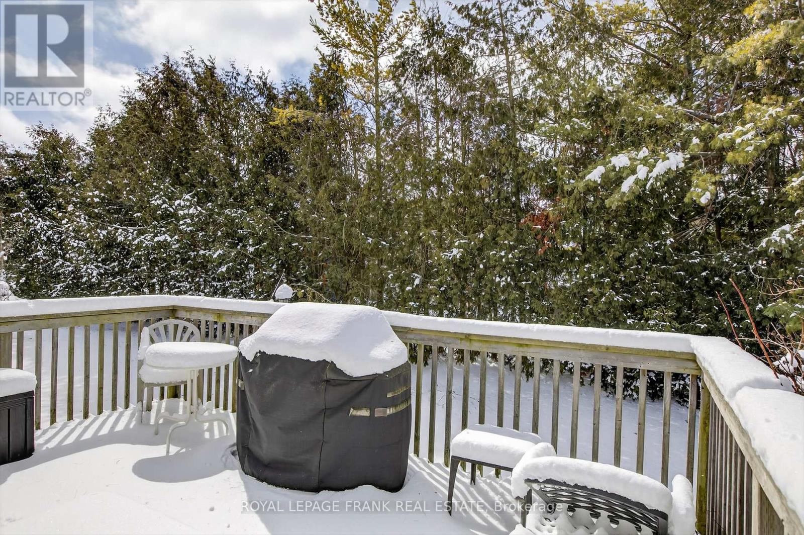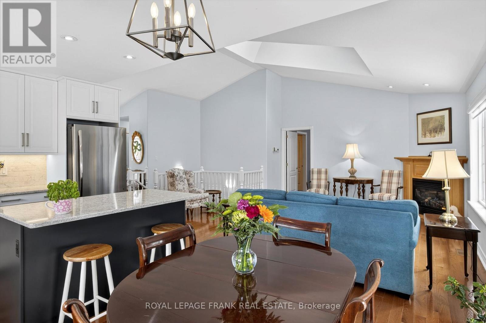 THIS HOME HAS IT ALL - 2+1 bedroom, 3 bath condominium in Peterborough's preferred west-end with a beautifully finished lower level backing onto tree line for privacy. Vaulted ceilings, hardwood flooring, open concept living space on main floor, double garage; 2100 sq ft of living space on both levels. Designer kitchen with solid-surface countertops, loads of cabinetry and centre island. Bright spacious Living room with fireplace and walk-out to upper deck. Primary bedroom with 3pc ensuite bath. Main level laundry. Lower level offers large Family room with second fireplace, Guest Bedroom and 4pc bath, as well as ample storage and utility space. Move right in and enjoy maintenance-free living, close to all amenities. (id:64974)