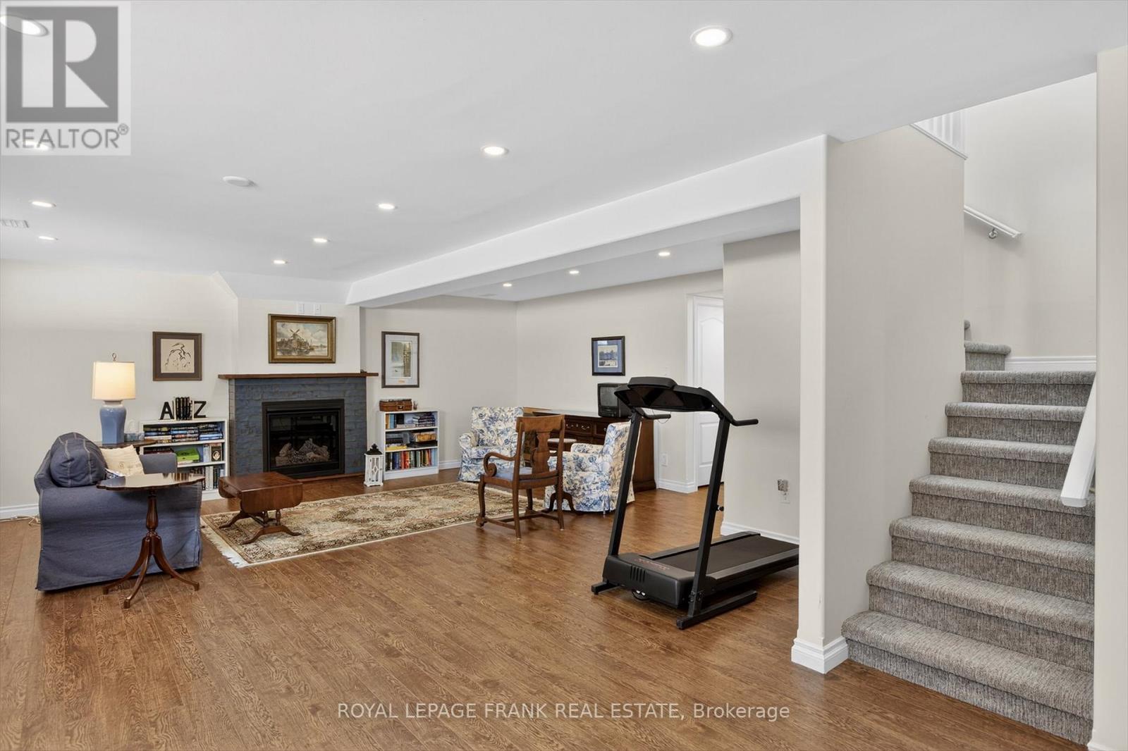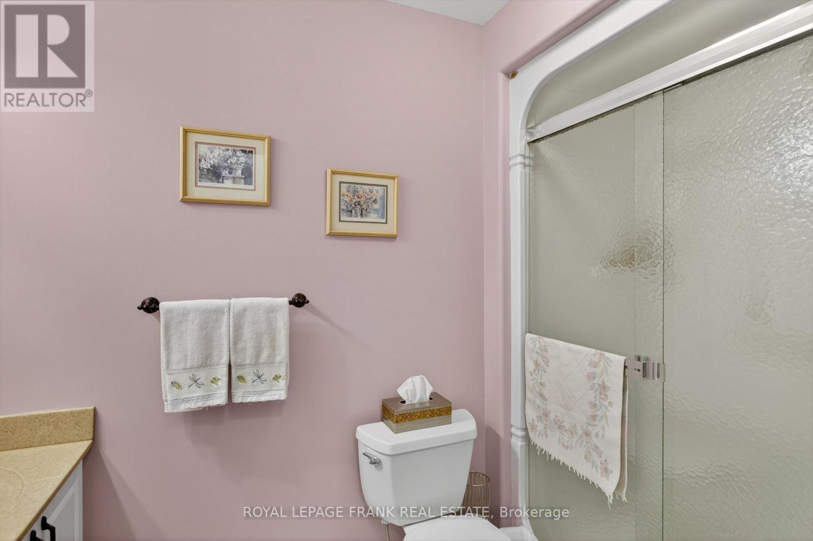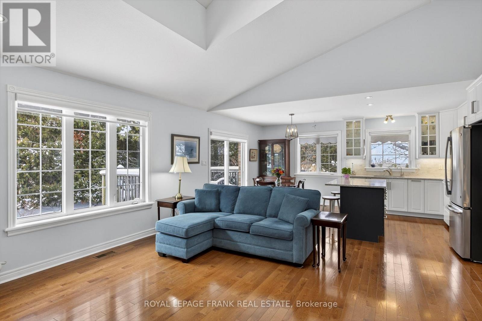 THIS HOME HAS IT ALL - 2+1 bedroom, 3 bath condominium in Peterborough's preferred west-end with a beautifully finished lower level backing onto tree line for privacy. Vaulted ceilings, hardwood flooring, open concept living space on main floor, double garage; 2100 sq ft of living space on both levels. Designer kitchen with solid-surface countertops, loads of cabinetry and centre island. Bright spacious Living room with fireplace and walk-out to upper deck. Primary bedroom with 3pc ensuite bath. Main level laundry. Lower level offers large Family room with second fireplace, Guest Bedroom and 4pc bath, as well as ample storage and utility space. Move right in and enjoy maintenance-free living, close to all amenities. (id:64974)