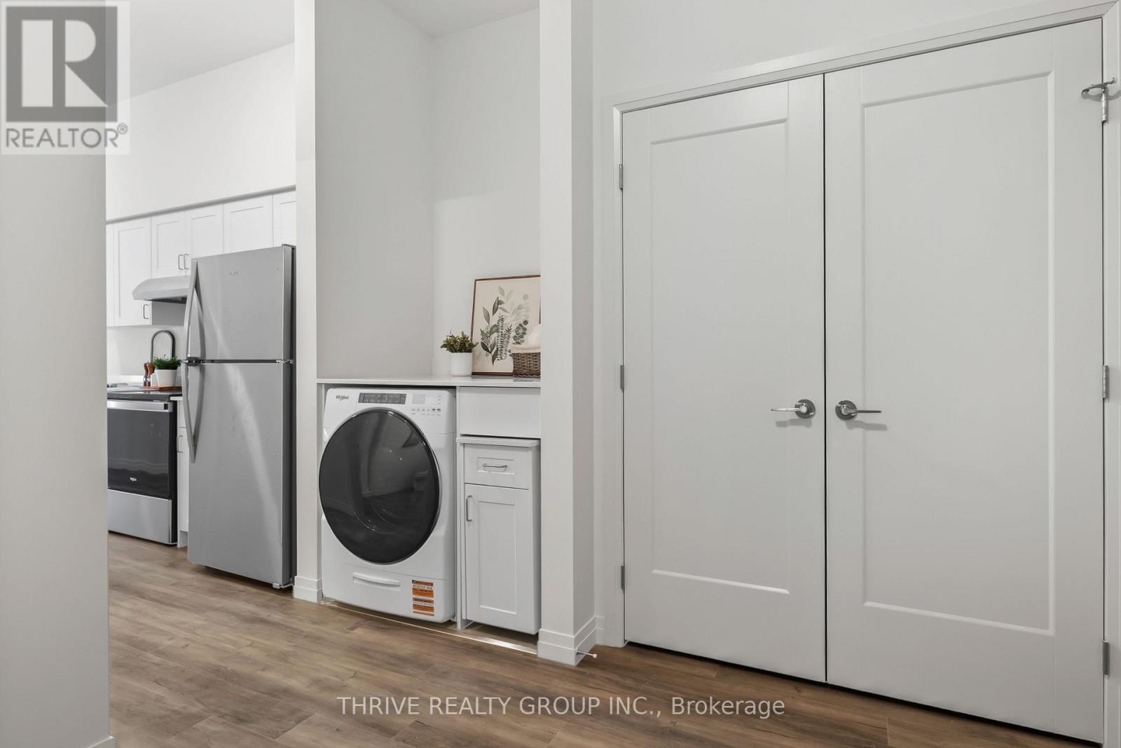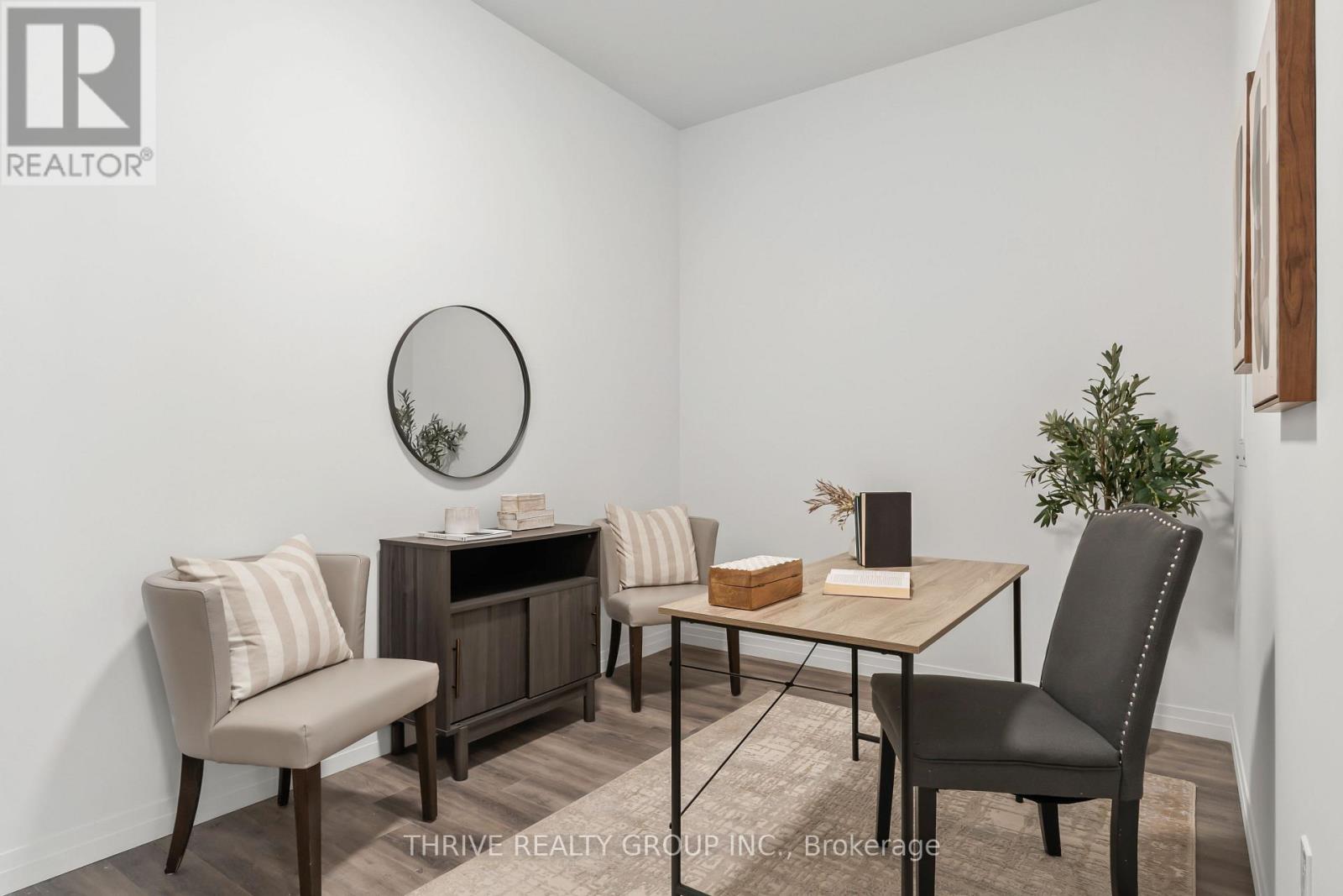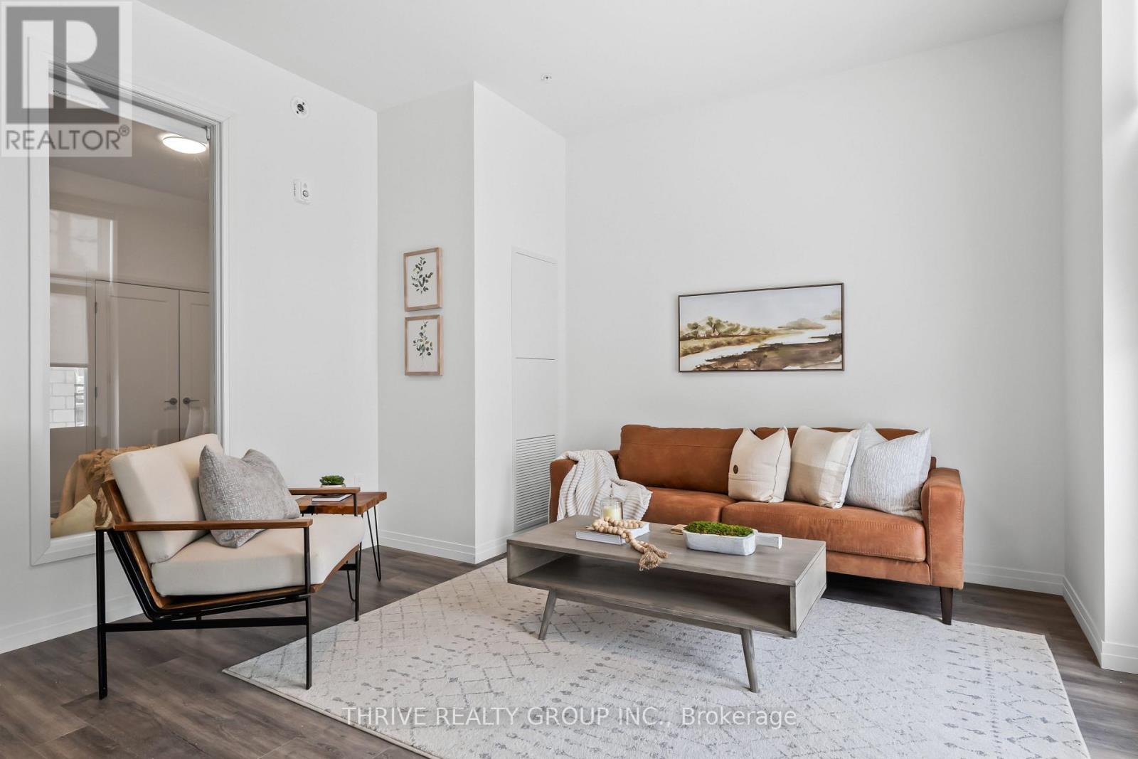 Welcome to Chelsea on the Thames, a brand new, purpose-built community in the heart of SoHo Village, thoughtfully designed to offer modern living in a vibrant, community-focused building. This 1-bedroom plus den, 1-bath suite provides versatile living space, featuring a functional, open-concept kitchen and living area ideal for everyday comfort and entertaining. The den offers flexibility as a home office, guest room, or additional storage space to suit your lifestyle. Step outside to your private terrace, extending your living space and providing an inviting spot for morning coffee or relaxing at the end of the day. Enjoy the convenience of in-suite laundry, a dishwasher, and efficient central heating and air conditioning for year-round comfort, plus 1 underground parking spot available for $50 per month. Tenants are responsible for Hydro. Located at 373 Hill Street, you'll be close to transit, parks, schools, and everyday amenities. *Photos are of a similar unit in the building and may not reflect the exact finishes or layout of this suite.* (id:64974)