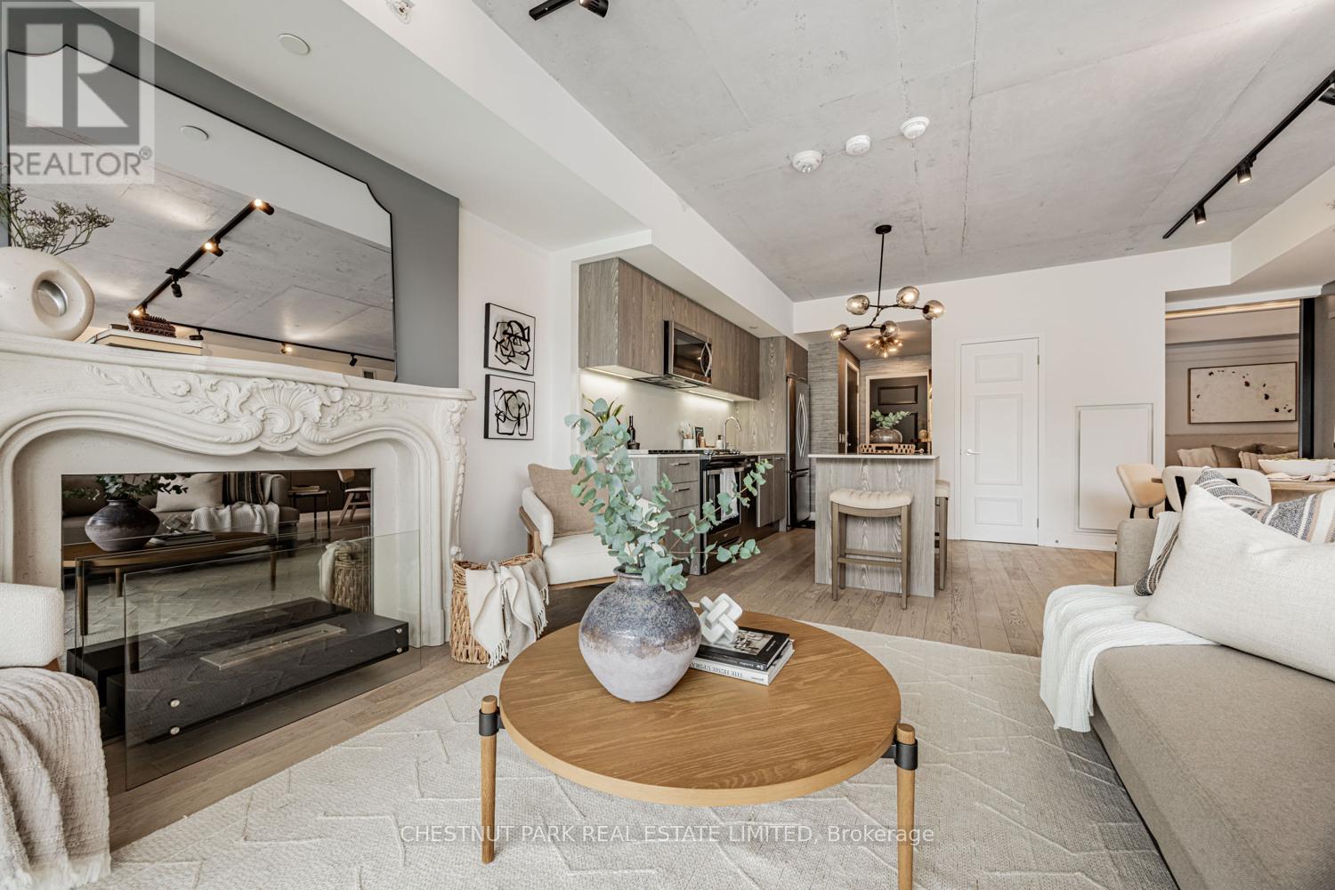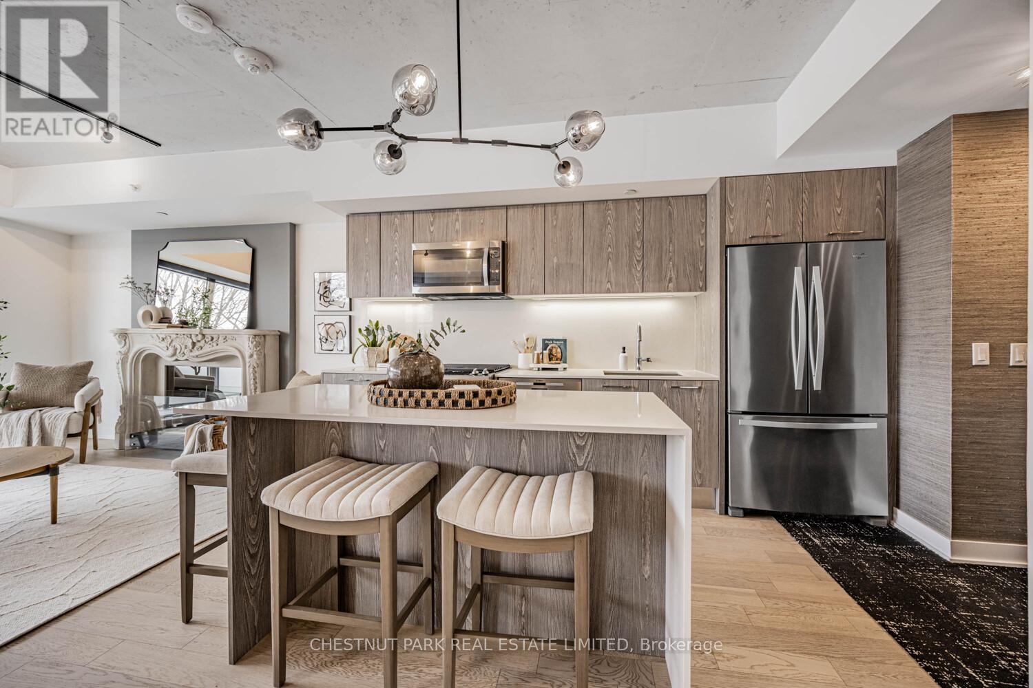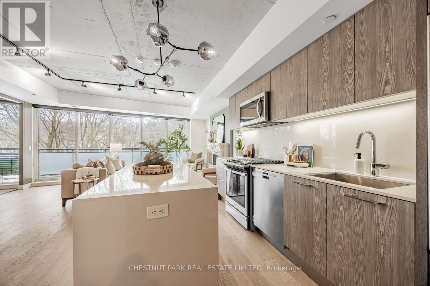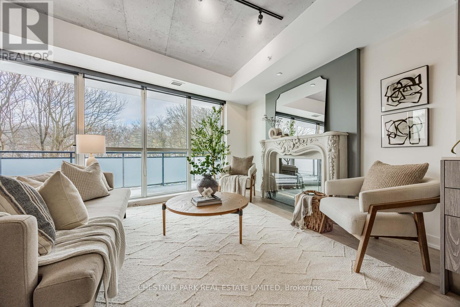 Bright, upgraded and located in the walk and transit friendly Upper Beach community, this exceptional 2 bedroom suite at The Southwood offers a peaceful escape with urban conveniences at your doorstep. Overlooking a quiet ravine with unbelievable seasonal views, this unit features a functional, extra-wide entertaining space and balcony with green views and stunning designer curated upgrades throughout. The bedrooms have been elevated with custom closet organizers, sliding doors and millwork, layered lighting and window coverings while the living area features an ethanol fuel fireplace with mantel and art gallery wall with custom millwork and welded steel arms to display your favourite pieces. Functional kitchen with French door fridge, Bosch dishwasher and gas cooktop (+ gas BBQ hook-up on balcony!) and large kitchen island. Across from The Big Carrot organic grocer, steps to several retail hubs with many cafes, restaurants, public transit options (GO Danforth to Union <10 Mins!), new YMCA, Kingston Village, Glen Stewart Ravine and Woodbine Beach. Enjoy this well managed condo community with guest suite and party room, and small ratio of units in the building. Parking and bike locker included with large storage locker and EV charging upgrades available. (id:64974)