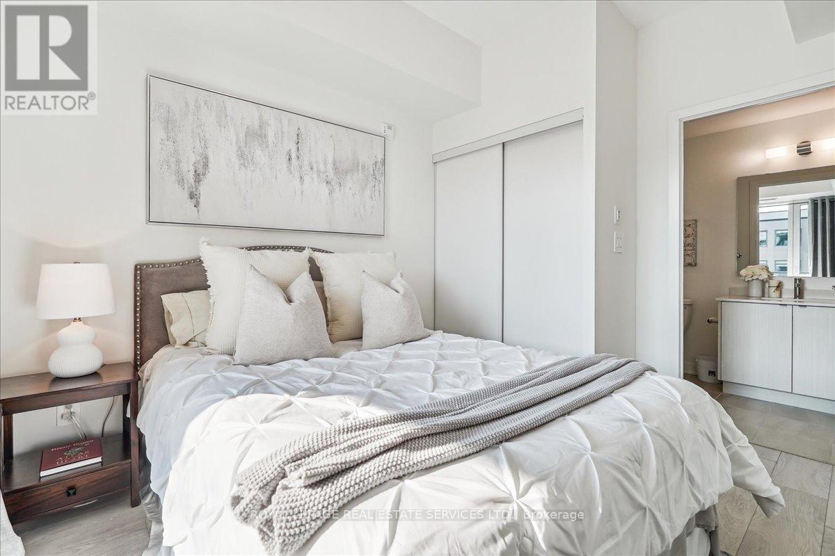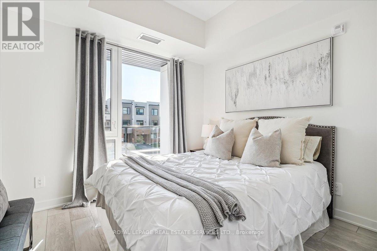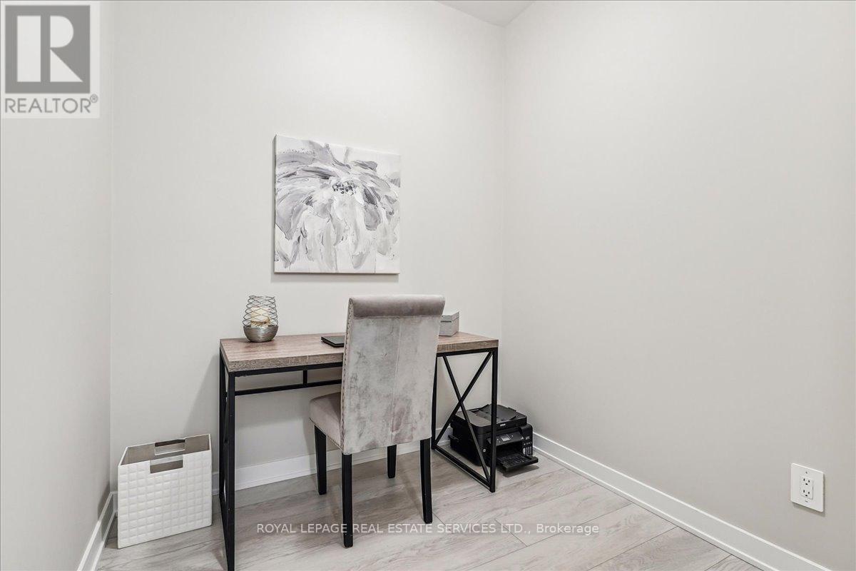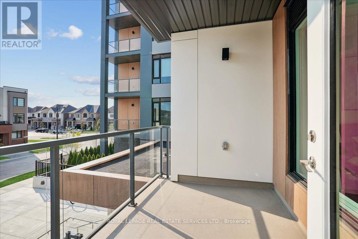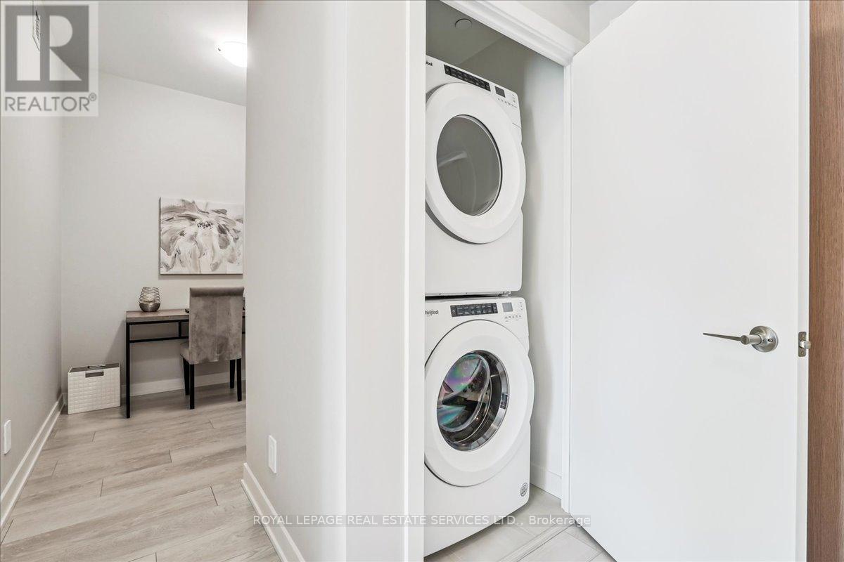 This stunning 1 Bedroom + Den, 2 Bathroom condo perfectly blends style and functionality! Featuring 9 ft ceilings, light grey laminate flooring, fresh paint throughout, and a modern kitchen with sleek quartz countertops, this home is completely move-in ready! Enjoy the open-concept layout with a spacious great room that flows seamlessly into the kitchen and out to your private, generously sized balcony-perfect for morning coffee or evening relaxation. The stylish kitchen offers white cabinetry, grey quartz countertops, and premium stainless steel appliances, including a fridge, glass cooktop with over-the-range oven, microwave, and dishwasher. The primary bedroom features a large window overlooking the balcony and a 4-piece ensuite with tile flooring and quartz counters. The versatile den is ideal for a home office or creative space, while the second full bathroom includes a glass-enclosed shower, quartz countertops, and elegant tile finishes. Includes in-suite washer & dryer, one parking space, and one storage locker. Building amenities feature a fully equipped fitness center, secure bike storage, a stylish party room with a kitchenette, and direct access to an outdoor lounge area with BBQs. Conveniently located close to Rattlesnake Golf Course, Downtown Milton, Mill Pond, Springridge Farm, and Toronto Premium Outlets. Just move in and enjoy modern condo living at its finest! (id:64974)