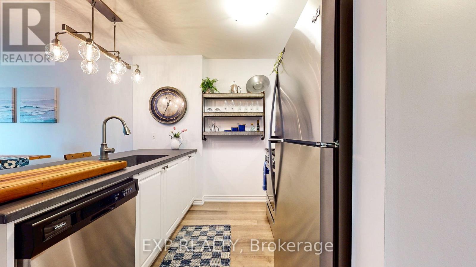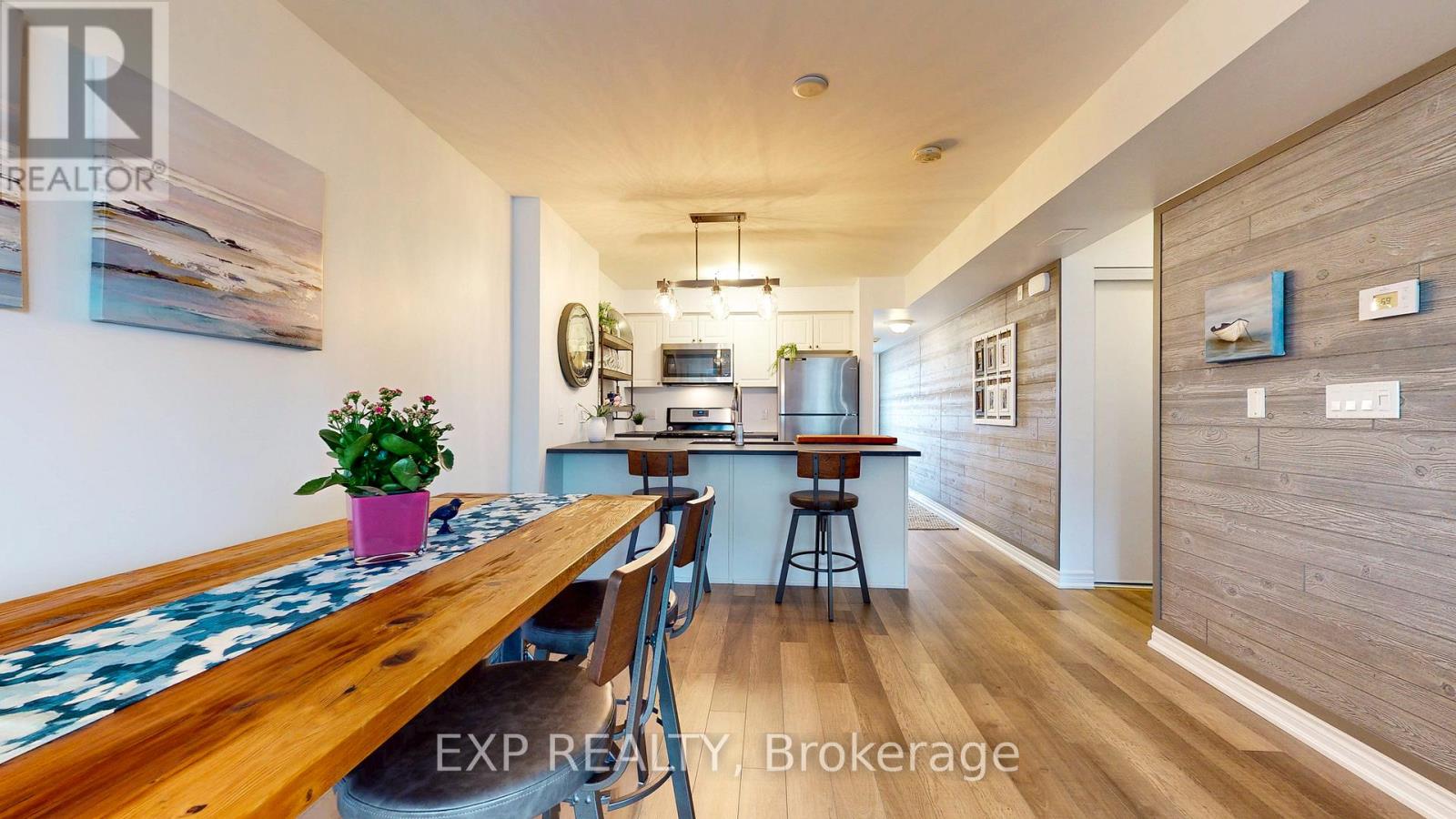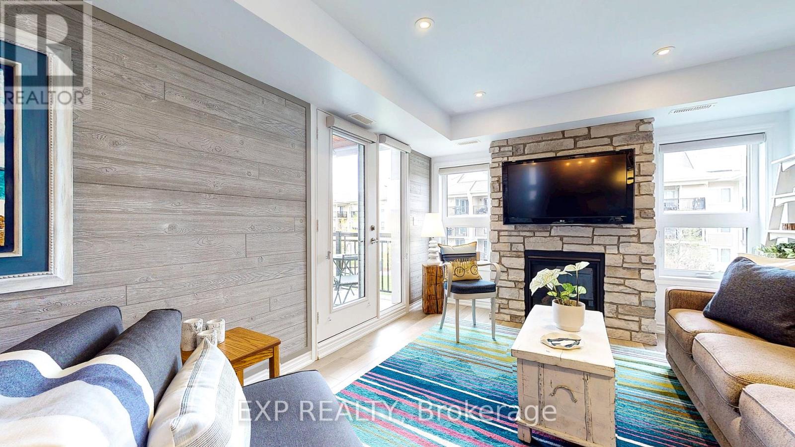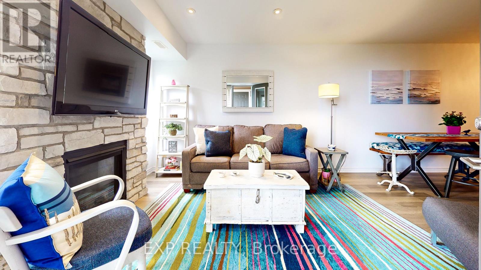 Experience the Georgian Bay lifestyle in the highly sought-after waterfront community of Wyldewood Cove in Collingwood. This bright, extensively upgraded 2-bedroom condo offers 1,081 sq ft of easy, low-maintenance living and one of the largest two-bedroom layouts in the building. With quality finishes throughout, the home features polished concrete countertops, smooth ceilings with pot lights, upgraded flooring, and a striking natural stone fireplace that anchors the living room. Both bathrooms have been beautifully renovated, featuring an oversized walk-in glass shower in one and a bathtub in the other. Step outside to your private patio with water views, complete with custom sunshades and a retractable screen-perfect for morning coffee or evening relaxation. Enjoy low condo fees, a friendly and welcoming community, and excellent amenities, including an outdoor pool, on-site gym, and shoreline storage for kayaks or paddle boards - ideal for sunset paddles. Just minutes from downtown Collingwood and Blue Mountain, this condo is ideal for downsizers, weekenders, or anyone seeking carefree waterfront living. With two exclusive parking spots and a like-new feel throughout, this is a must-see to truly appreciate. (id:64974)