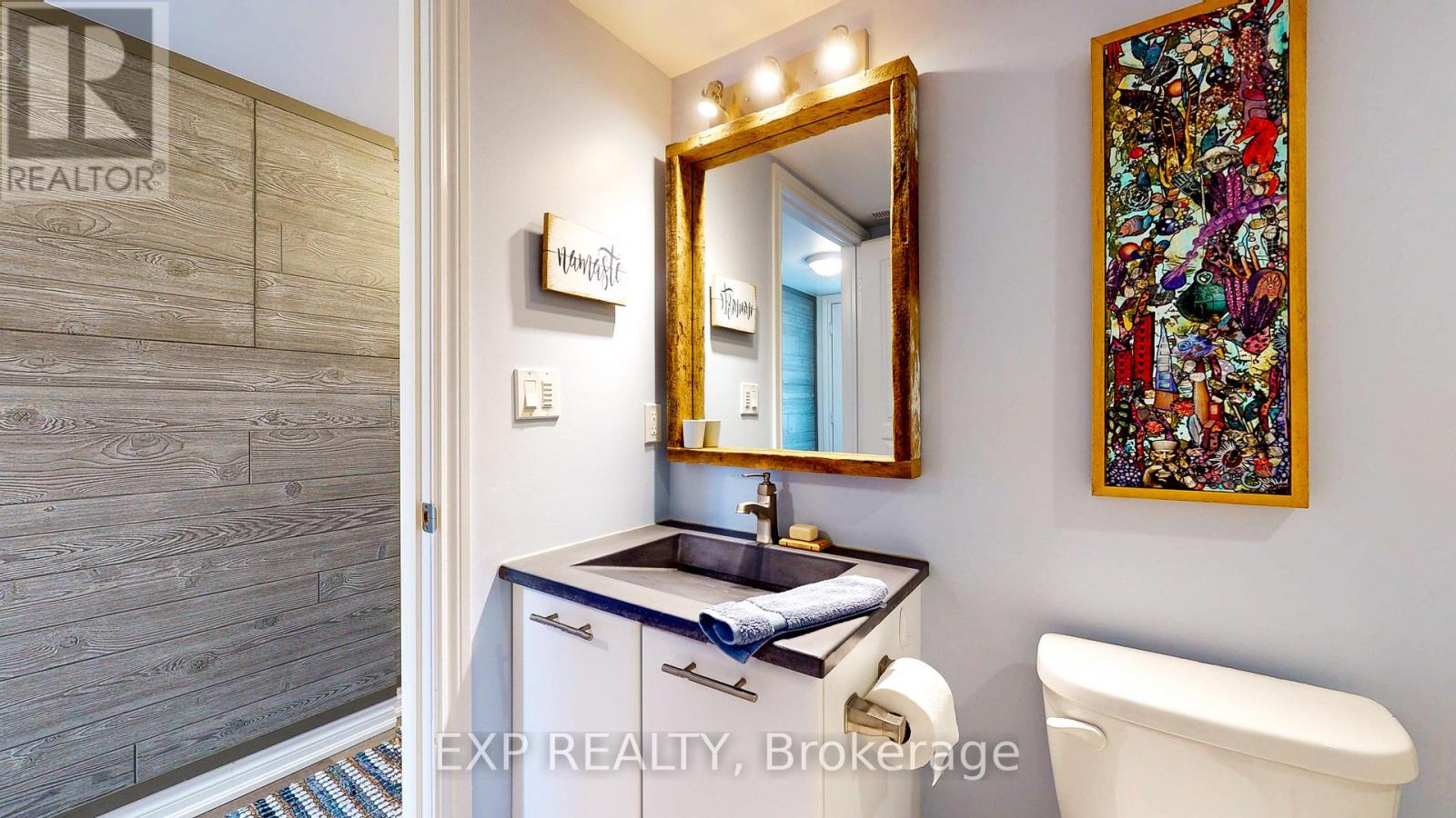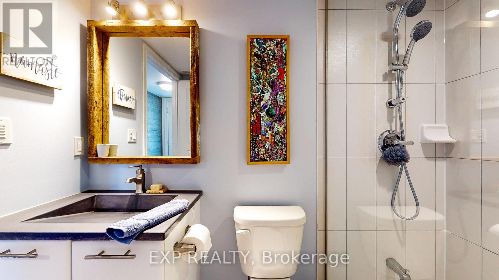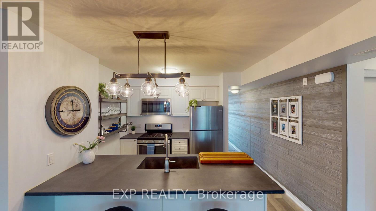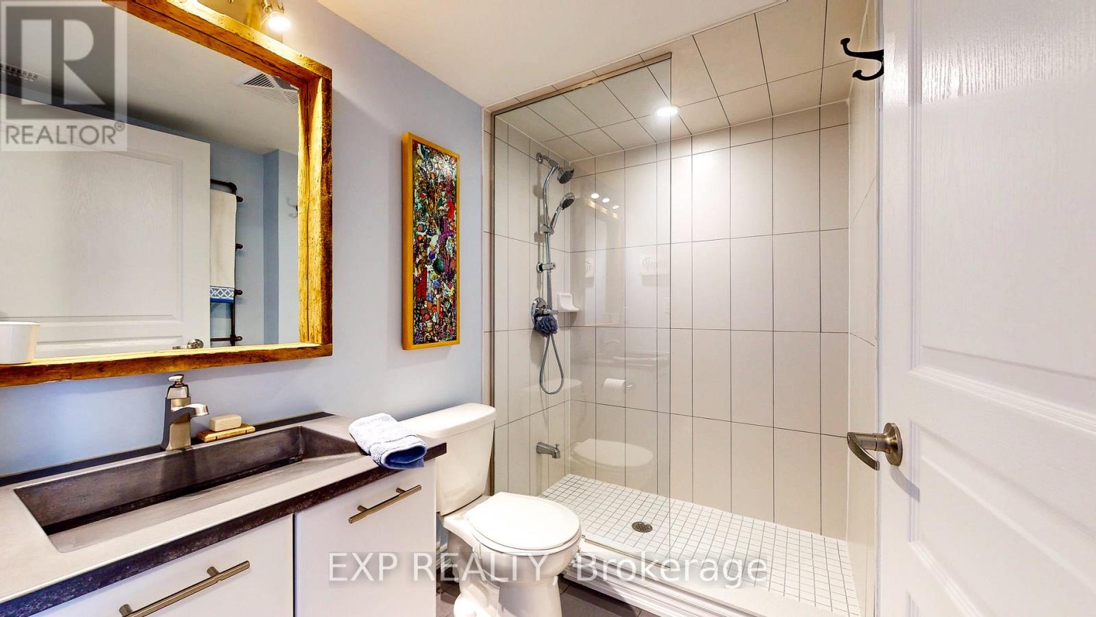 Experience the Georgian Bay lifestyle in the highly sought-after waterfront community of Wyldewood Cove in Collingwood. This bright, extensively upgraded 2-bedroom condo offers 1,081 sq ft of easy, low-maintenance living and one of the largest two-bedroom layouts in the building. With quality finishes throughout, the home features polished concrete countertops, smooth ceilings with pot lights, upgraded flooring, and a striking natural stone fireplace that anchors the living room. Both bathrooms have been beautifully renovated, featuring an oversized walk-in glass shower in one and a bathtub in the other. Step outside to your private patio with water views, complete with custom sunshades and a retractable screen-perfect for morning coffee or evening relaxation. Enjoy low condo fees, a friendly and welcoming community, and excellent amenities, including an outdoor pool, on-site gym, and shoreline storage for kayaks or paddle boards - ideal for sunset paddles. Just minutes from downtown Collingwood and Blue Mountain, this condo is ideal for downsizers, weekenders, or anyone seeking carefree waterfront living. With two exclusive parking spots and a like-new feel throughout, this is a must-see to truly appreciate. (id:64974)
