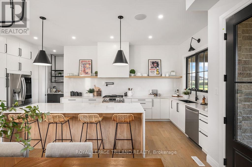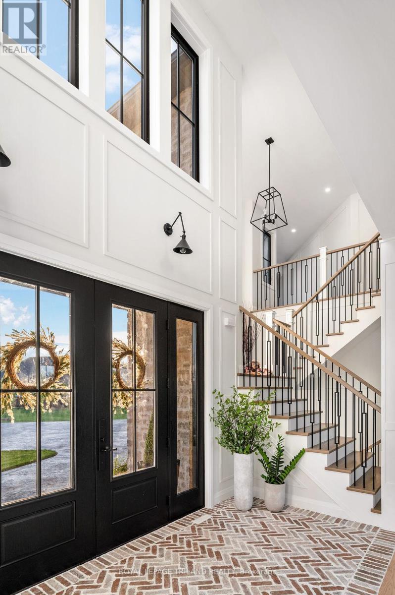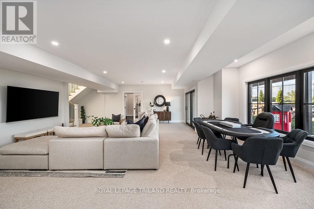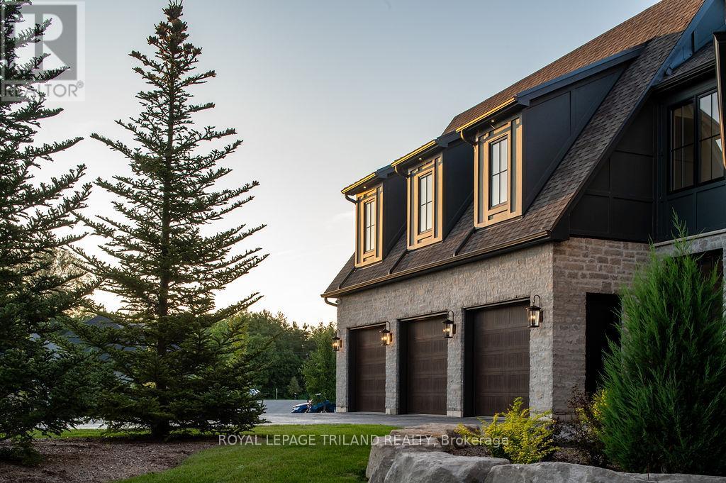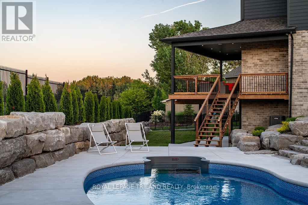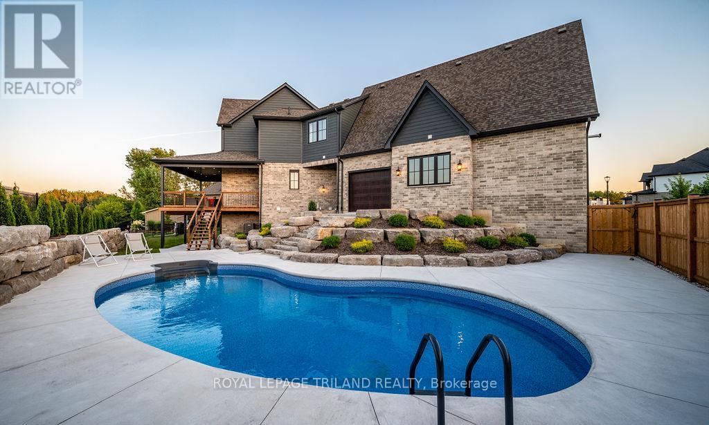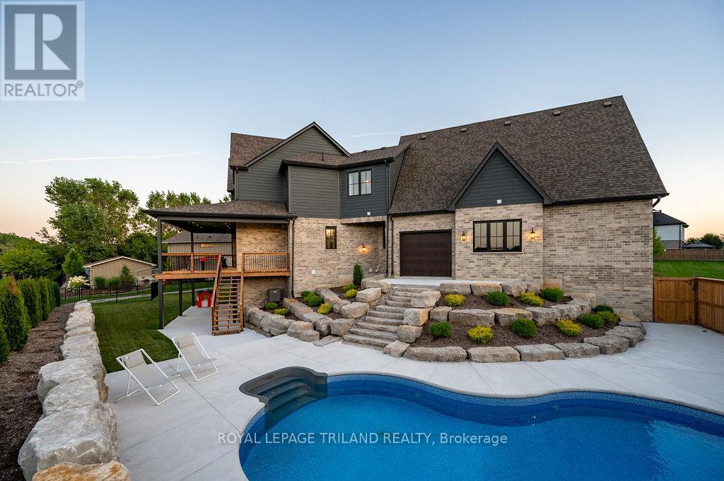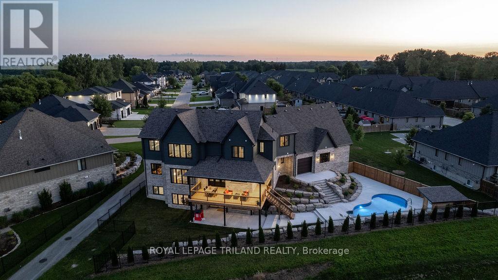 Welcome to Bella Lago Estates, Komoka's most exclusive and sought after neighbourhood. This exceptional property offers a rare opportunity for the discerning buyer to acquire a home defined by aesthetic perfection, timeless design, and a superior lifestyle. With just under 6,000 sq ft of luxurious living space, this residence truly offers something for everyone that's looking for superior design and elegance. A majestic exterior features a classic stone facade, a vast stamped concrete driveway, and handpicked pine trees, ensuring a timeless arrival. Step inside to soaring ceilings and abundant natural light that flows over a beautiful herringbone brick pattern floor. The open concept layout includes a great room and dining space perfect for entertaining. Enjoy seamless indoor/outdoor living with access to a covered deck offering tranquil views of the pond, ideal for your morning coffee or evening retreat. The executive den exudes sophistication with exposed wood beams and a built-in library. The second floor is dedicated to family comfort, featuring four spacious bedrooms, three full bathrooms, a convenient laundry room, and a bonus family room perfect for media or gaming. The fully finished walkout lower level is an entertainer's dream, complete with an additional bedroom, a full bathroom, a large rec room, and a dedicated gym space. The lower level walks out directly to your fully fenced backyard oasis featuring a sparkling pool. The yard is beautifully landscaped with armour stone and low-maintenance trees and shrubs. Access to the oversized heated triple car garage is made easy via slate stone steps from the backyard. Komoka is a fantastic community offering great schools, the YMCA community centre, grocery shopping, walking trails, and quick access to Highway 402. There are fine Restaurants just steps away. Opportunities to purchase within this exclusive enclave of just 29 homes in the private residence are rare, don't miss your chance. (id:64974)
