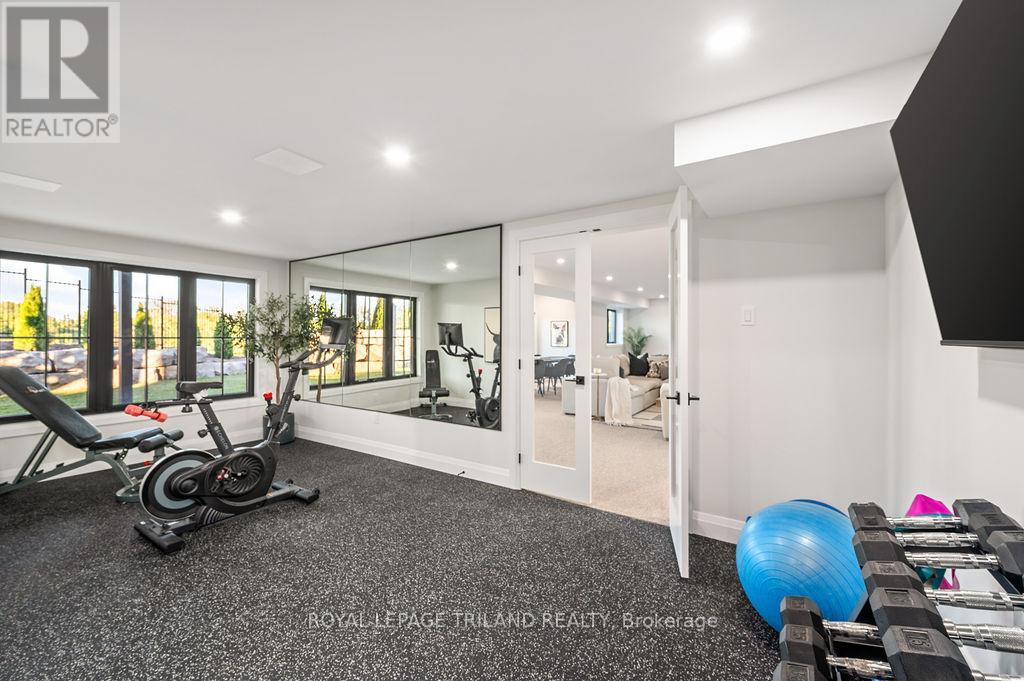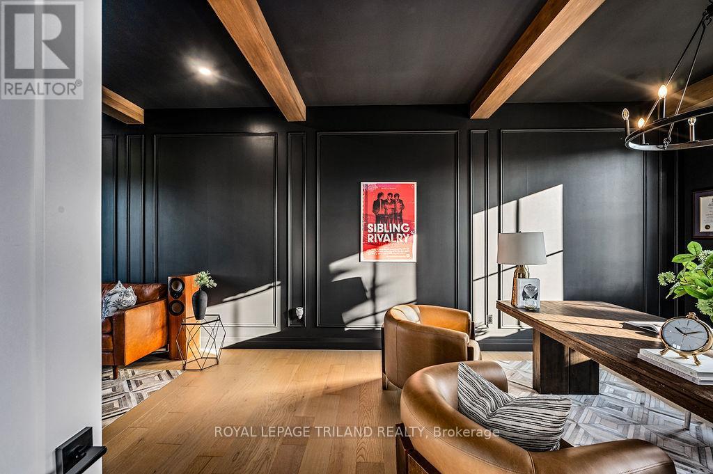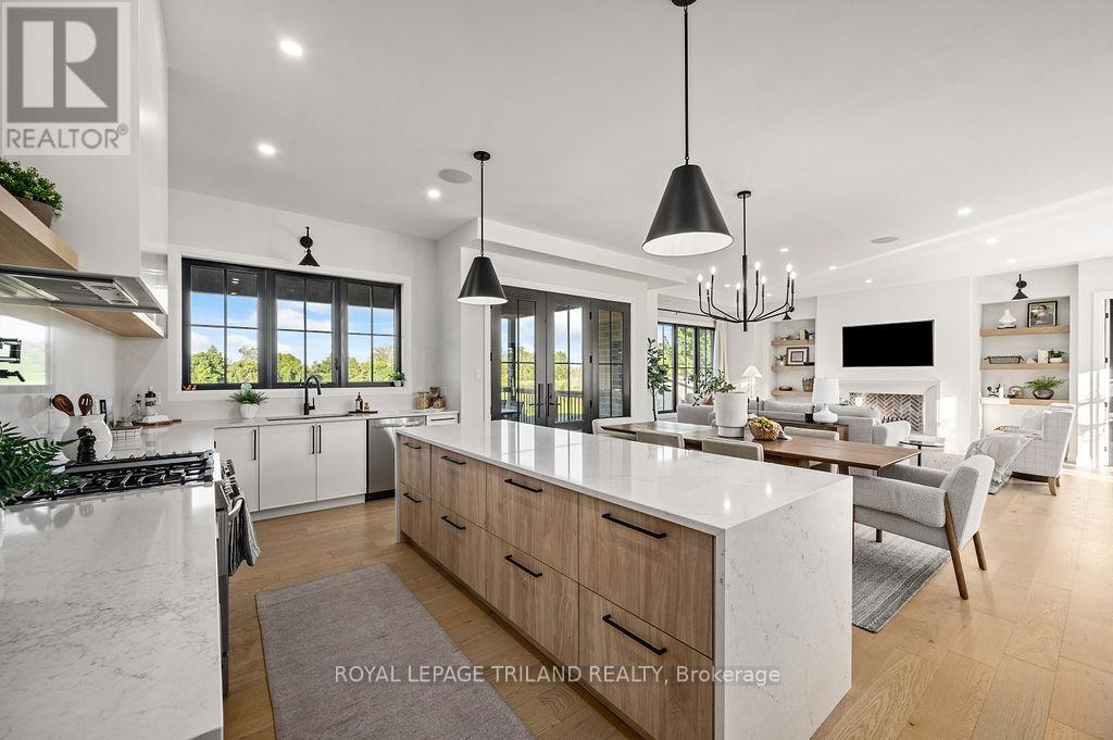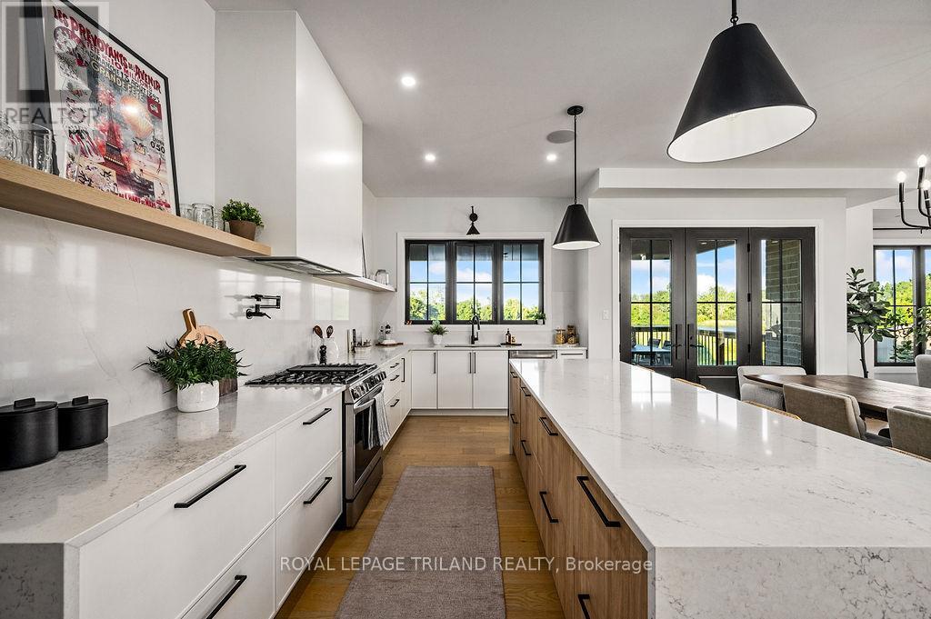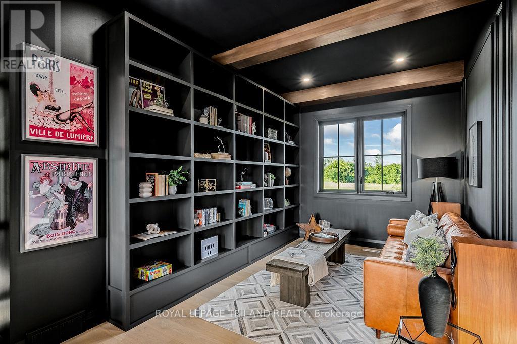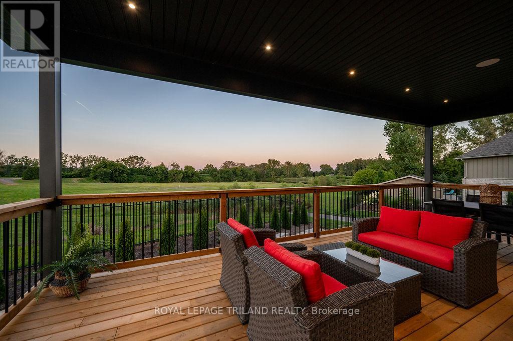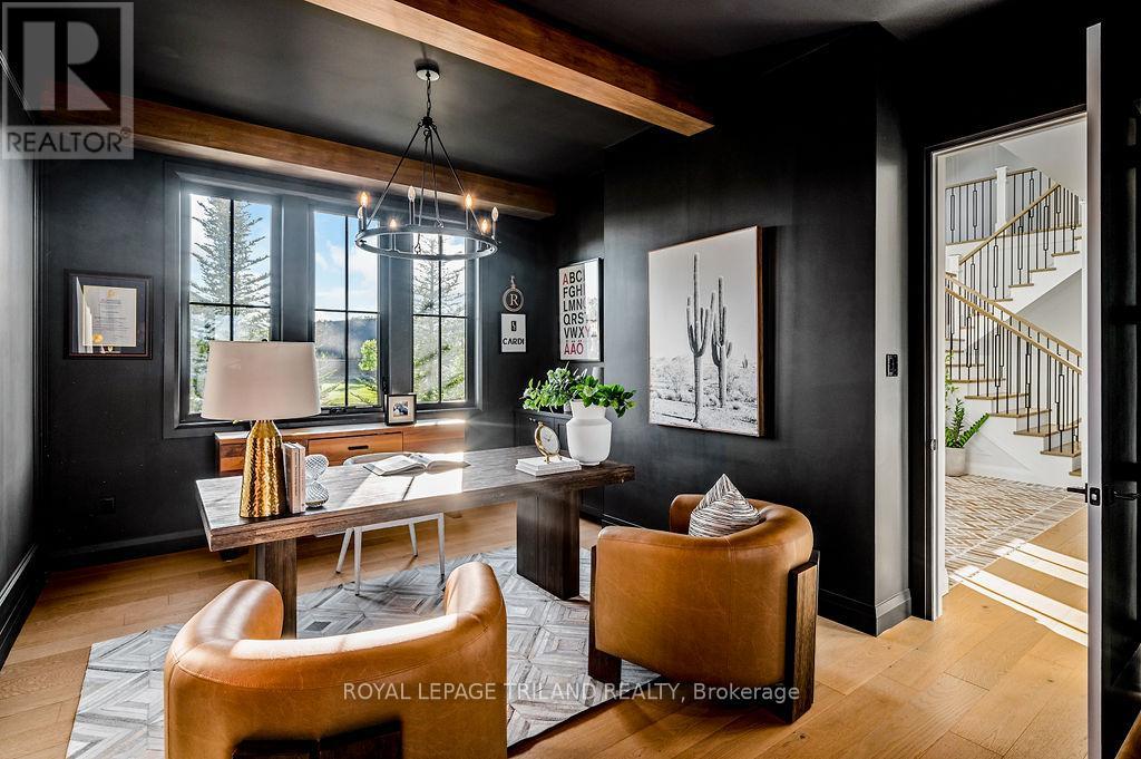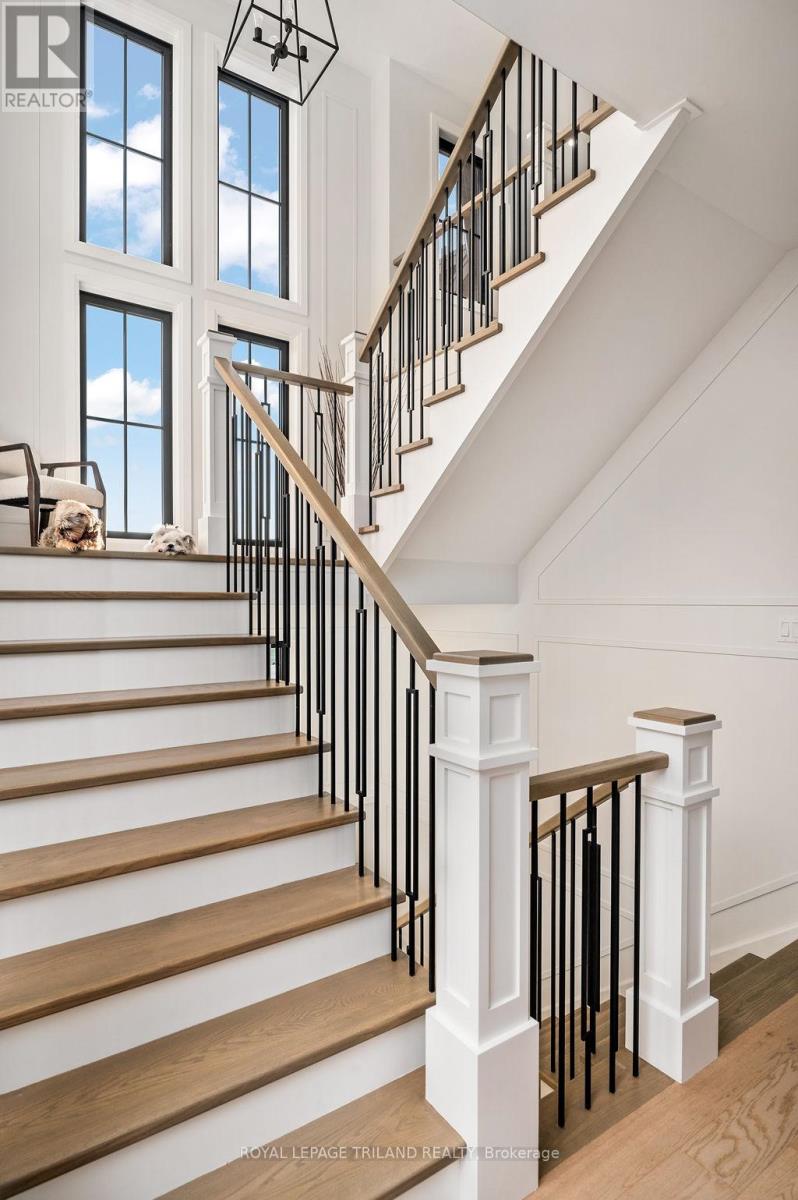 Welcome to Bella Lago Estates, Komoka's most exclusive and sought after neighbourhood. This exceptional property offers a rare opportunity for the discerning buyer to acquire a home defined by aesthetic perfection, timeless design, and a superior lifestyle. With just under 6,000 sq ft of luxurious living space, this residence truly offers something for everyone that's looking for superior design and elegance. A majestic exterior features a classic stone facade, a vast stamped concrete driveway, and handpicked pine trees, ensuring a timeless arrival. Step inside to soaring ceilings and abundant natural light that flows over a beautiful herringbone brick pattern floor. The open concept layout includes a great room and dining space perfect for entertaining. Enjoy seamless indoor/outdoor living with access to a covered deck offering tranquil views of the pond, ideal for your morning coffee or evening retreat. The executive den exudes sophistication with exposed wood beams and a built-in library. The second floor is dedicated to family comfort, featuring four spacious bedrooms, three full bathrooms, a convenient laundry room, and a bonus family room perfect for media or gaming. The fully finished walkout lower level is an entertainer's dream, complete with an additional bedroom, a full bathroom, a large rec room, and a dedicated gym space. The lower level walks out directly to your fully fenced backyard oasis featuring a sparkling pool. The yard is beautifully landscaped with armour stone and low-maintenance trees and shrubs. Access to the oversized heated triple car garage is made easy via slate stone steps from the backyard. Komoka is a fantastic community offering great schools, the YMCA community centre, grocery shopping, walking trails, and quick access to Highway 402. There are fine Restaurants just steps away. Opportunities to purchase within this exclusive enclave of just 29 homes in the private residence are rare, don't miss your chance. (id:64974)