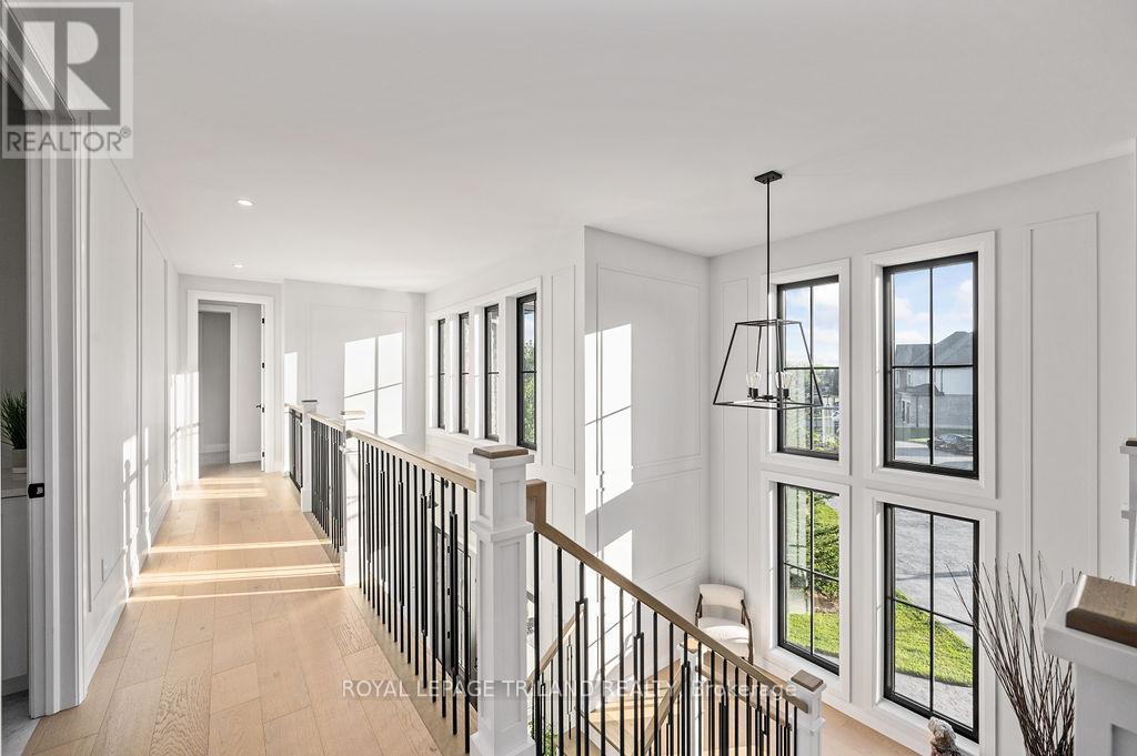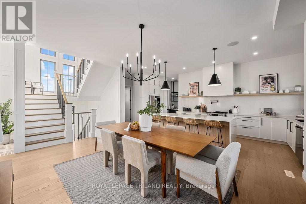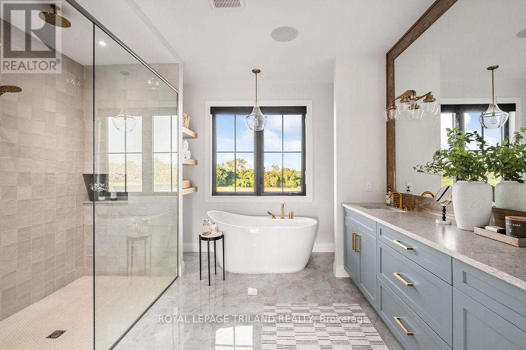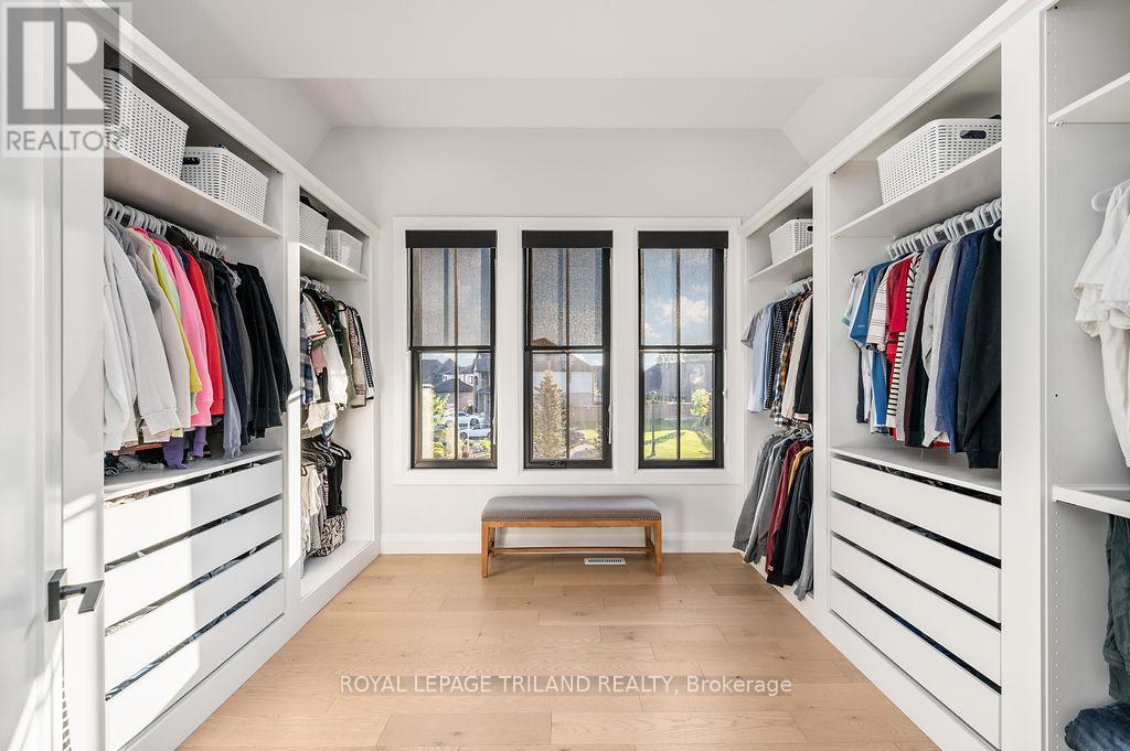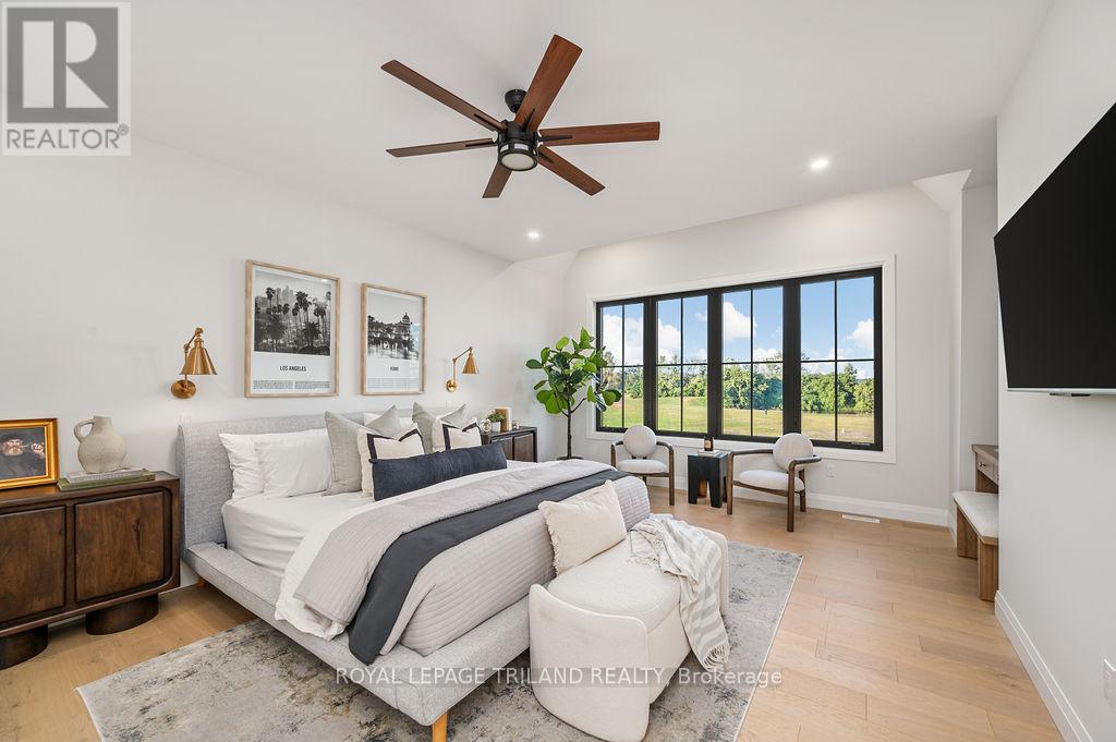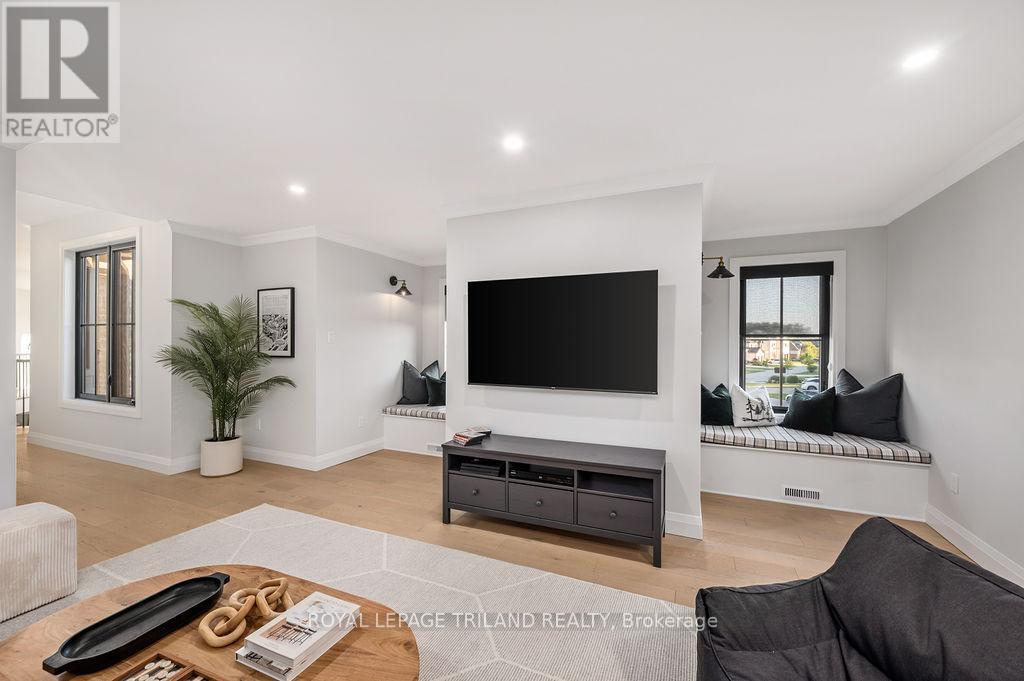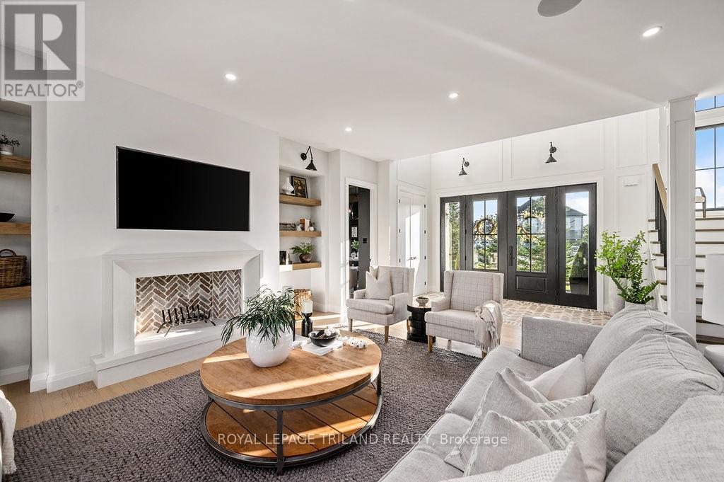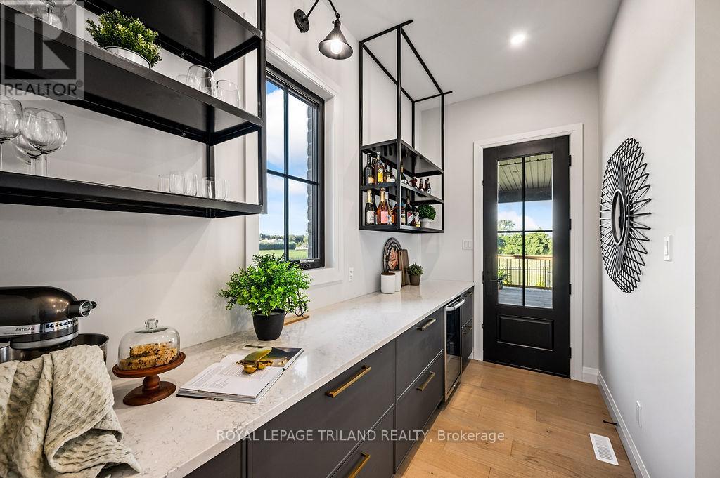 Welcome to Bella Lago Estates, Komoka's most exclusive and sought after neighbourhood. This exceptional property offers a rare opportunity for the discerning buyer to acquire a home defined by aesthetic perfection, timeless design, and a superior lifestyle. With just under 6,000 sq ft of luxurious living space, this residence truly offers something for everyone that's looking for superior design and elegance. A majestic exterior features a classic stone facade, a vast stamped concrete driveway, and handpicked pine trees, ensuring a timeless arrival. Step inside to soaring ceilings and abundant natural light that flows over a beautiful herringbone brick pattern floor. The open concept layout includes a great room and dining space perfect for entertaining. Enjoy seamless indoor/outdoor living with access to a covered deck offering tranquil views of the pond, ideal for your morning coffee or evening retreat. The executive den exudes sophistication with exposed wood beams and a built-in library. The second floor is dedicated to family comfort, featuring four spacious bedrooms, three full bathrooms, a convenient laundry room, and a bonus family room perfect for media or gaming. The fully finished walkout lower level is an entertainer's dream, complete with an additional bedroom, a full bathroom, a large rec room, and a dedicated gym space. The lower level walks out directly to your fully fenced backyard oasis featuring a sparkling pool. The yard is beautifully landscaped with armour stone and low-maintenance trees and shrubs. Access to the oversized heated triple car garage is made easy via slate stone steps from the backyard. Komoka is a fantastic community offering great schools, the YMCA community centre, grocery shopping, walking trails, and quick access to Highway 402. There are fine Restaurants just steps away. Opportunities to purchase within this exclusive enclave of just 29 homes in the private residence are rare, don't miss your chance. (id:64974)