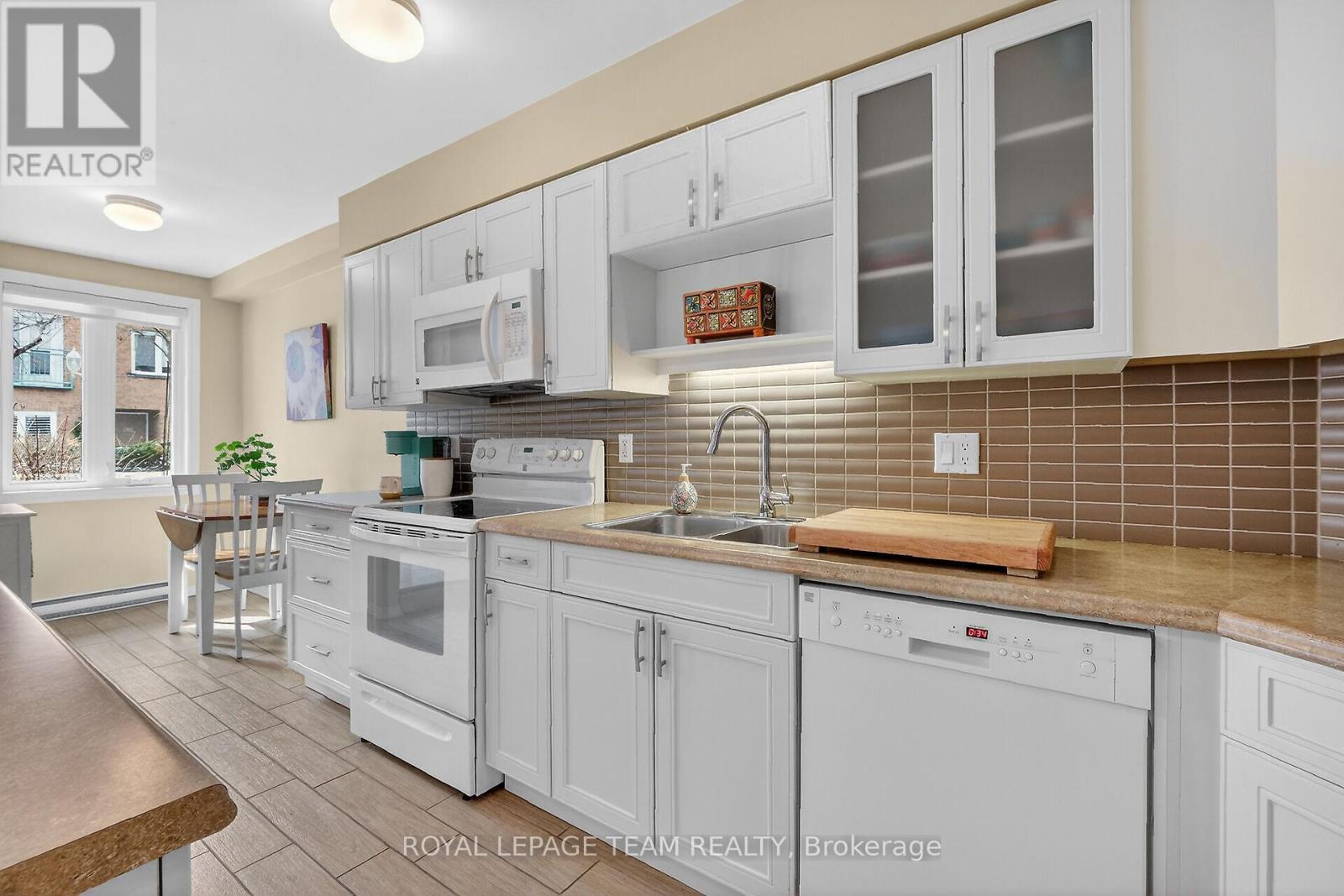 Welcome to effortless living at The Waterbrooke, an inviting ground-floor bungalow condo offering the rare convenience of its own private entrance and terrace in the heart of sought-after Overbrook. Just steps from the Rideau River, Rideau Sports Centre, and Adawe Crossing Bridge, this location blends natural beauty with urban accessibility. Thoughtfully upgraded and meticulously maintained, this bright and airy unit features a reimagined kitchen that opens seamlessly into the living space, allowing natural light to pour in. The stunning island serves as the centrepiece-perfect for casual dining, entertaining, or everyday living-and is complemented by rich hardwood floors that add warmth and elegance throughout. The cozy living room is anchored by a charming wood-burning fireplace, creating the perfect ambiance for relaxing evenings. The spacious primary bedroom offers comfort and tranquillity, paired with a beautifully updated 3-piece bathroom featuring sleek glass shower doors. A generously sized second bedroom and an additional 3-piece bath provide flexibility for guests, family, or a home office. Enjoy the convenience of in-unit laundry, a large storage room, and a separate utility space, ensuring everything has its place. Step outside through patio doors onto your private terrace, where you can unwind while overlooking a lush, landscaped courtyard filled with vibrant flowers and greenery. This exceptional offering also includes indoor parking, a private locker, bike storage, and visitor parking, delivering both comfort and practicality in a truly desirable setting. (id:64974)