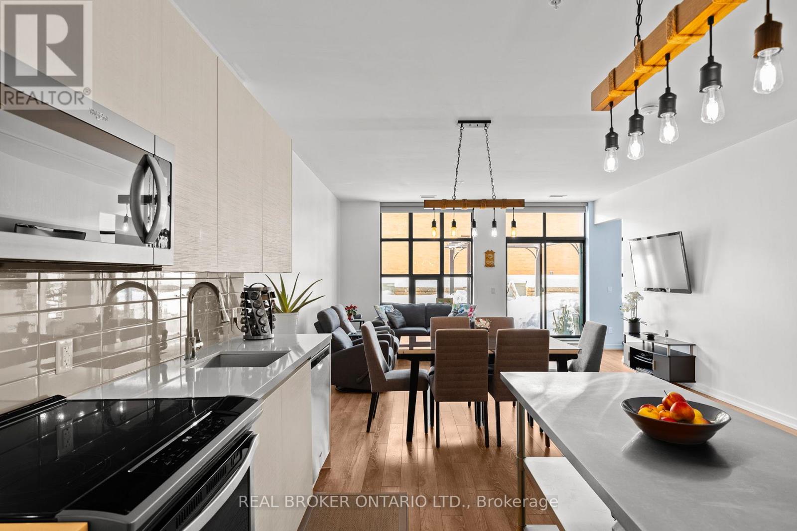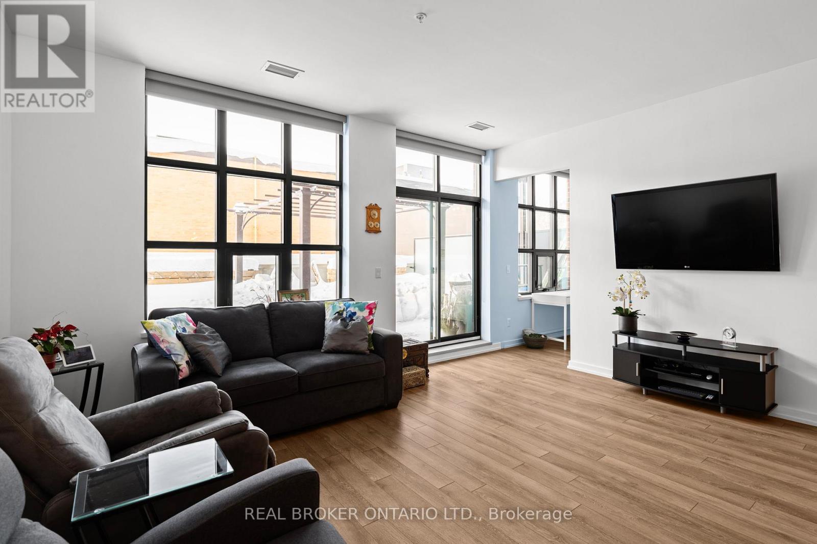 Welcome to Matchedash Lofts - one of downtown Orillia's most sought-after condo buildings. This exceptionally rare offering features over 1,000 square feet of interior living space plus an incredible 540 square foot private terrace, creating a true indoor/outdoor living experience seldom found in condo living. Flooded with natural light, this modern residence offers an open-concept layout with stainless steel appliances, a large centre island, and contemporary finishes throughout. A spacious den provides excellent flexibility for a home office or guest space, complemented by a second full 4-piece bathroom. The primary bedroom features a walk-in closet and private ensuite. Step outside to your expansive terrace complete with a natural gas BBQ hookup and gazebo - perfect for entertaining and relaxing. Built in 2020, Matchedash Lofts is a top-quality, well-managed building offering premium amenities including a rooftop patio and function room with sweeping views of Lake Couchiching. Enjoy a truly walkable lifestyle with downtown Orillia's shops, restaurants, waterfront, Metro, Shoppers Drug Mart, LCBO, and more just steps away. The unit also includes a premium underground parking space with no vehicles on either side and an additional storage locker - no snow, no door dings, just convenience. A rare combination of space, outdoor living, and location - this is condo living without compromise. (id:64974)