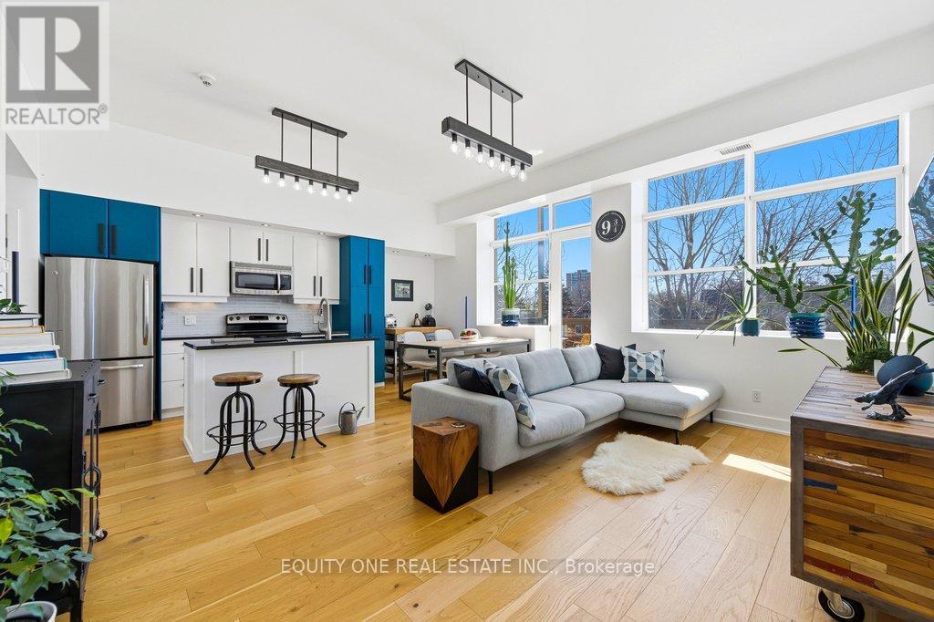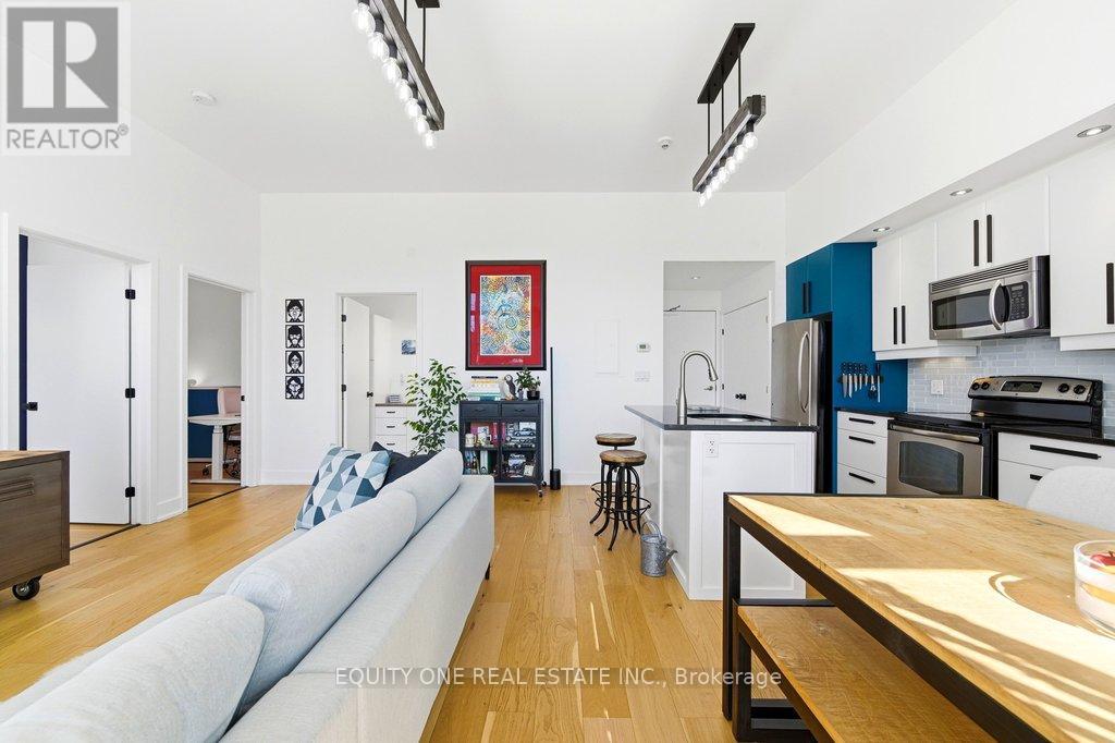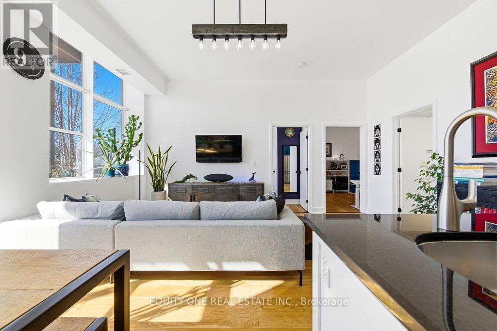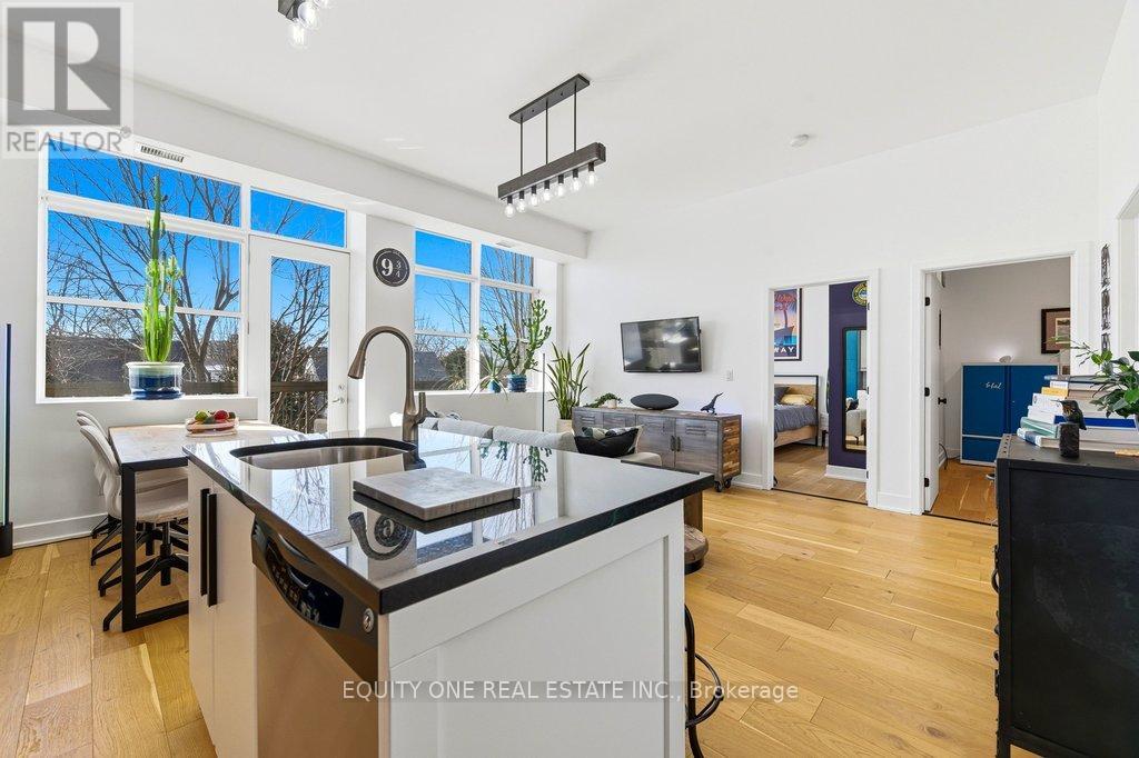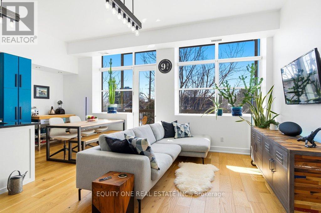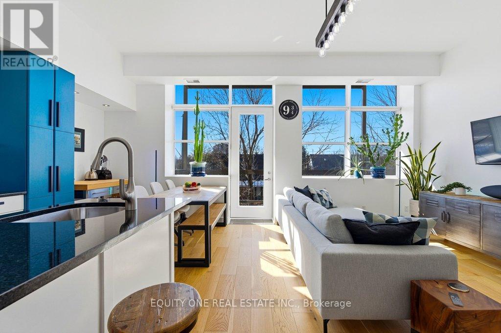 Imagine waking up to soft natural light pouring through oversized south-facing windows, with mature trees just beyond your view-offering both privacy and a peaceful, green backdrop in the heart of the city. Welcome to this beautifully designed 1-bedroom + den condo in a unique boutique building, where modern comfort meets quiet, refined living. LEED Silver certified building, ideally located in a quiet, tree-lined residential pocket just minutes from downtown Ottawa. Originally redeveloped from École Cadieux, this boutique building offers modern living with low operating costs and approximately 855 sq ft of thoughtfully designed space. Soaring 10'4" ceilings and expansive south-facing windows flood the home with natural light year-round, while mature trees provide privacy and seasonal comfort. The open-concept living, dining, and kitchen area features granite countertops, engineered French oak hardwood flooring, and updated LED lighting throughout.The spacious primary bedroom includes double closets and custom window coverings, while the versatile den-enhanced with internal glazing-makes an ideal home office or guest space. The modern entry showcases porcelain tile, ample storage, in-unit laundry, and a clean, functional layout. Step outside to your oversized 6' x 18' private balcony with retractable screen door -perfect for relaxing or entertaining-with durable construction and BBQs permitted. Additional highlights include a deeded parking space in a private courtyard and a secure storage locker. Enjoy a prime central location just 4 km to Parliament Hill, steps to the Rideau River pathways, and close to Beechwood Village shops, cafés, and amenities. A rare opportunity to own a bright, modern condo in a quiet yet connected neighbourhood! (id:64974)