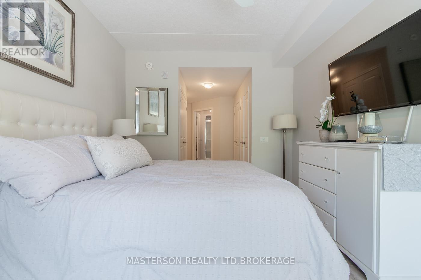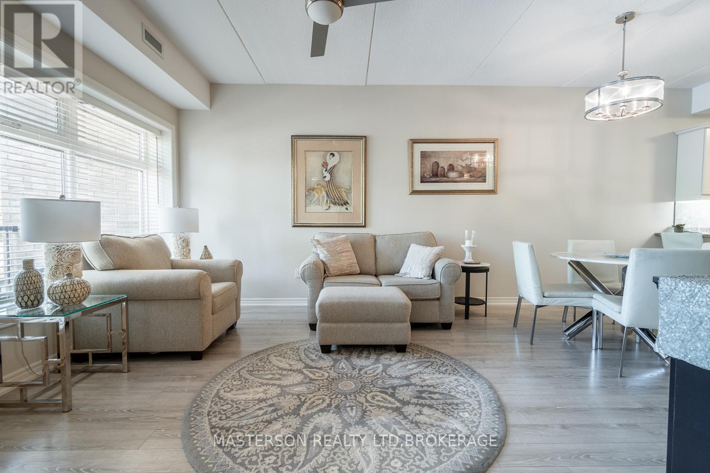 Second Floor with Detached Garage and surface parking space in prime location at Olympia Retirement Condos! Come be the next resident of the in-gated Olympia Retirement Community located within walking distance to grocery stores, restaurants, banking and a short drive to highway access and Niagara's finest amenities. Welcome to Suite #203, a privately located unit with beautiful views of the Community's landscaped grounds. This suite offers an open concept layout with 9-foot ceilings, in suite laundry, and modern interior finishes. The living and dining arrangement is filled with natural light and has a walkout to a covered balcony. The Master bedroom is generous in size (24' X 11')and features two double closets and an 3pc ensuite bathroom. The 2nd bedroom is a good size with a double closet. Inclusion include: a detached garage just steps away from the 1 surface parking space, storage room in the building's basement, all appliances included and window coverings. Olympia Retirement Condominiums is a safe and secure in-gated community geared towards active seniors with State of the Arc amenities - inground pool, garden area, gazebo, 2nd floor common room, exercise room, 3rd floor banquet hall and walking trails. (id:64974)
