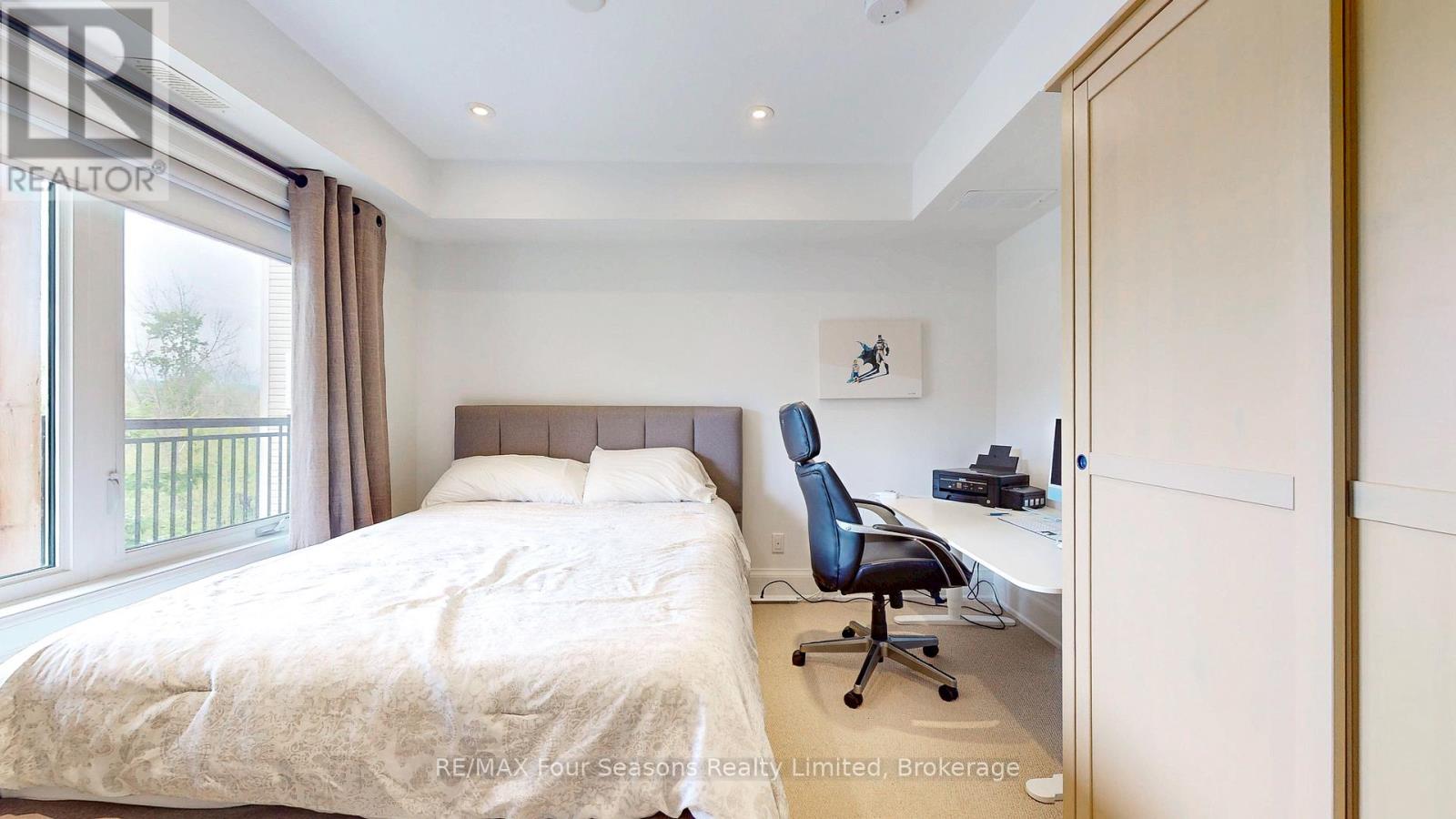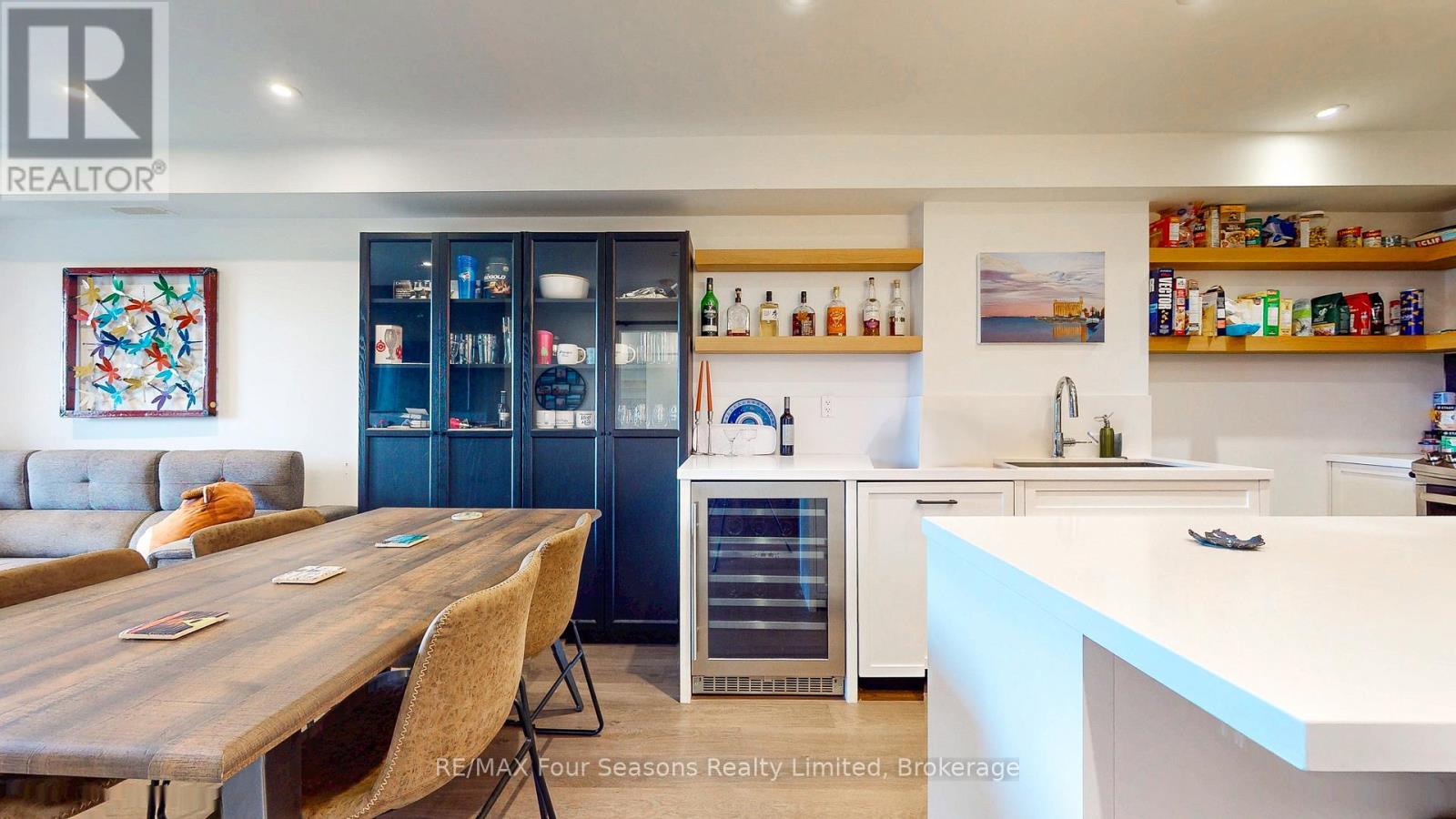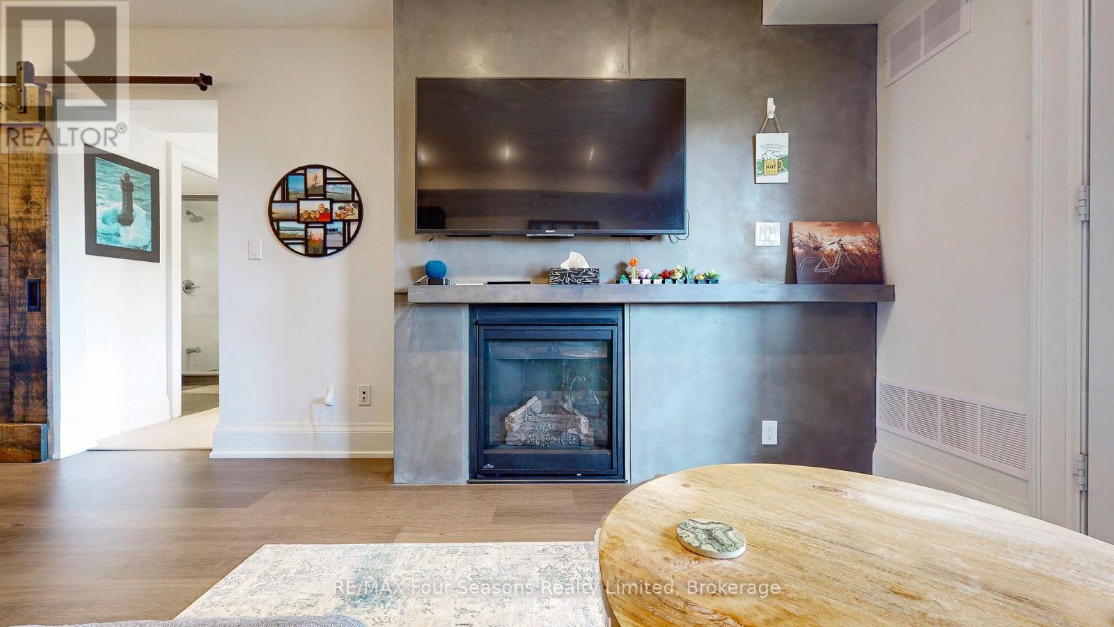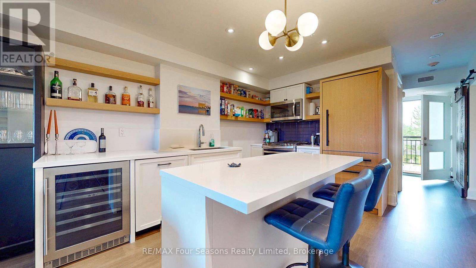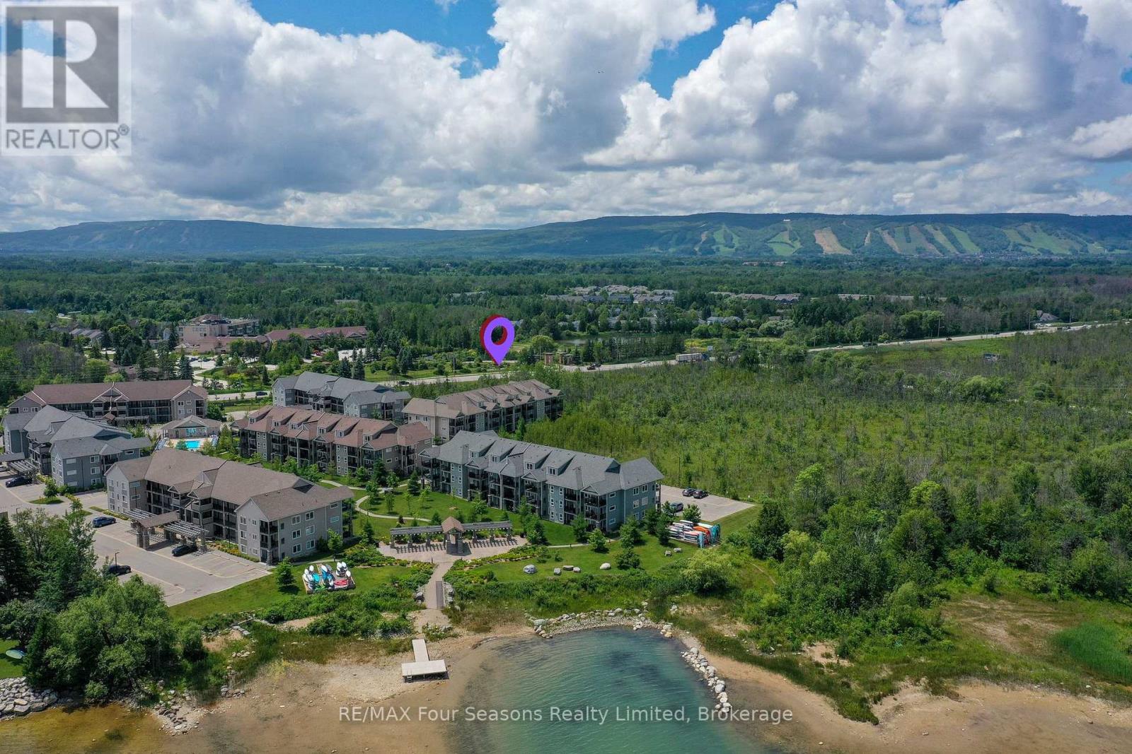 A Truly Unique Wyldewood Cove Osler Unit! This exceptional, one-of-a-kind residence was fully redesigned and retrofitted by renowned Toronto designer and gallery owner, Alison Milne. With panoramic views of the Niagara Escarpment from the front of this second floor unit and stunning seasonal Georgian Bay vistas from the back balcony, this home features over $250,000 in upgrades, custom improvements, and meticulous attention to detail. The space is move-in ready, offering a seamless living experience. Inside, you'll find pot lights throughout, each controlled by Lutron Maestro dimmers, and complemented by elegant Elte fixtures in every room. The chef's kitchen is a dream, complete with a new wine fridge (2025), GE Elite gas stove, new microwave/rangehood (2025), deep pocket pot drawers, and a fully integrated fridge and dishwasher. The luxurious master suite is a serene retreat, featuring a custom barn board headboard, a king-sized bed, under-bed storage, and a built-in wall closet. The ensuite bath boasts heated floors for ultimate comfort. After a day of outdoor adventure, unwind in the spacious open concept great room featuring living room and dining area/kitchen, complete with custom concrete gas fireplace. Step outside to the private balcony and soak in the breathtaking seasonal Georgian Bay views. This impeccably maintained condo offers the perfect balance of luxury and convenience, with active lifestyle amenities, including a gym, change rooms, and a year-round heated outdoor pool for winter enjoyment. Wyldewood Cove is an exclusive waterfront community and also features kayak/paddleboard area by the beach area and dock featuring a small channel to the Bay and serene views of the historic Nottawasaga Lighthouse. This executive condo truly embodies the best of four-season nestled living minutes from Collingwood, golf, skiing and biking! (id:64974)