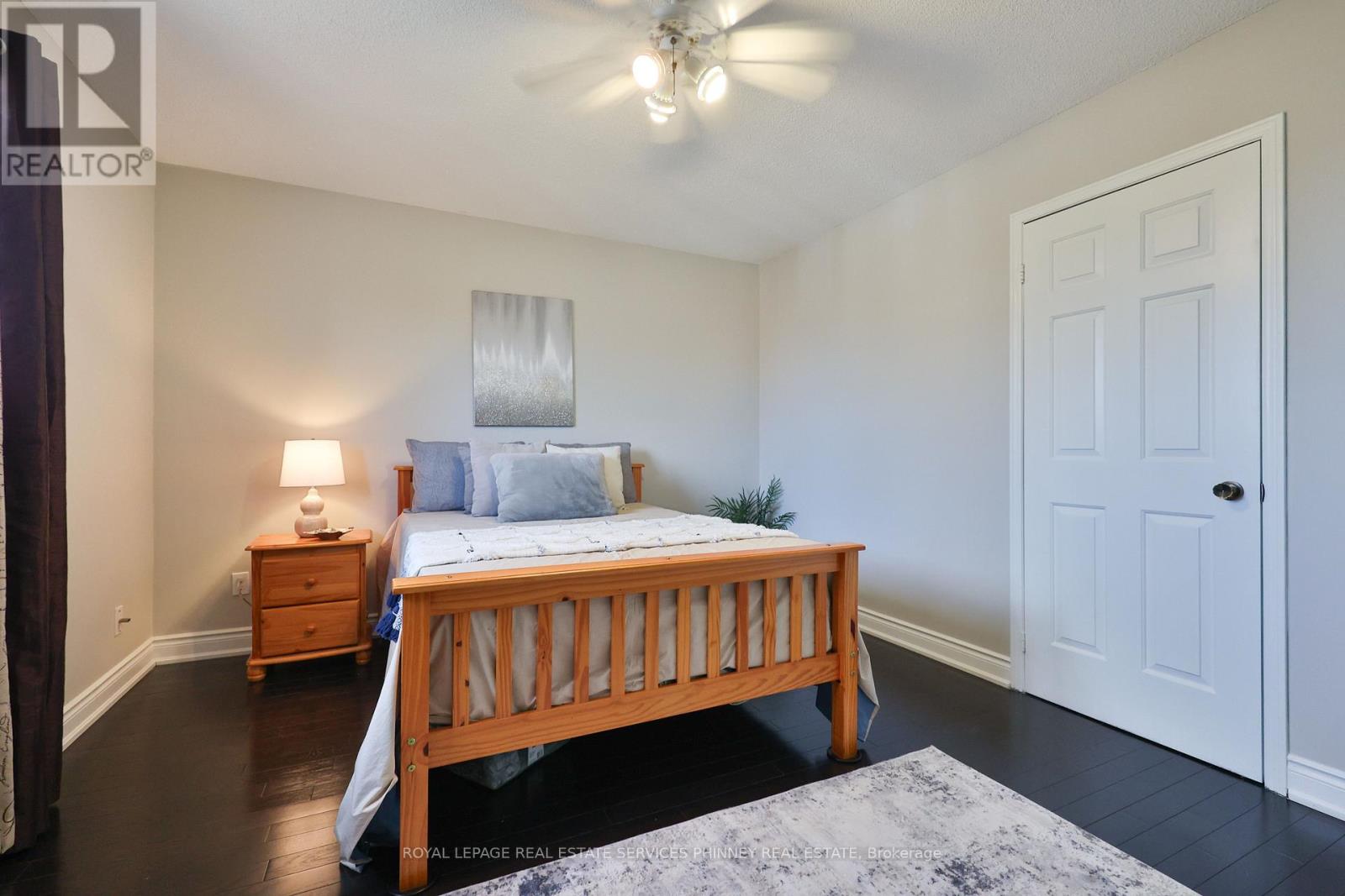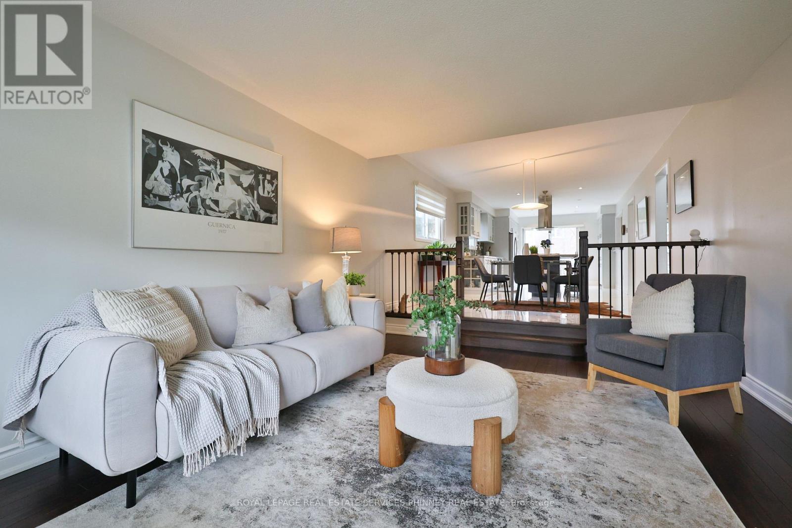 Nestled within a highly sought-after, family-oriented neighbourhood, this tastefully updated residence offers nearly 4,000 square feet of beautifully appointed living space. The bright, open-concept main level is designed for both comfort and elegance, highlighted by a stunning picture window in the living room that floods the space with natural light. Rich hardwood floors flow seamlessly throughout, leading to a thoughtfully renovated kitchen featuring a spacious island, natural stone countertops, and premium built-in stainless steel appliances. A walkout extends to the private backyard-an ideal setting for entertaining, family gatherings, and outdoor dining.The home further boasts an expansive family room centered around a charming wood-burning fireplace, as well as a private office-perfectly suited for remote work or quiet study.Upstairs, four generously proportioned bedrooms provide ample accommodation for family and guests alike. The primary suite offers a large closet and a well-appointed ensuite, while the shared bathroom has been elegantly renovated with contemporary finishes.The lower level presents exceptional versatility, offering a variety of functional spaces tailored to suit any lifestyle. Highlights include an additional bedroom with a three-piece bathroom, a spacious recreation room, a dedicated gym area, and abundant storage.Outdoors, the fully fenced backyard is framed by mature trees and complemented by a patio, creating a serene and private retreat.Ideally situated near top-rated schools, scenic trails, parks, and with convenient access to the QEW and GO Station, this exceptional property represents the ultimate in family living. A/C New 2025. (id:64974)