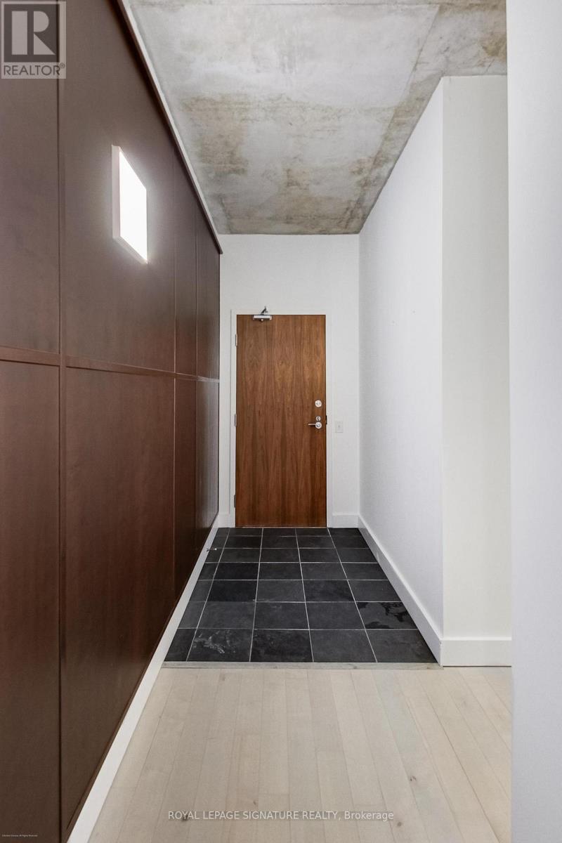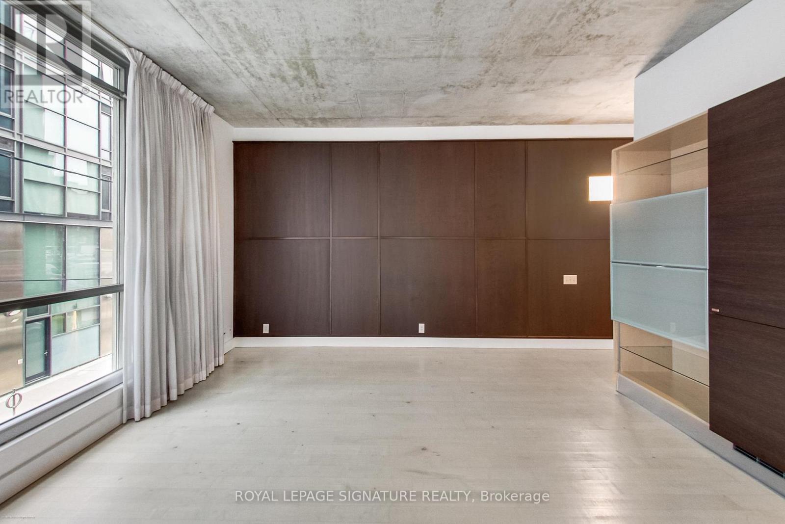 Welcome to the iconic Charlotte Lofts, a stunning 884sqft one bedroom corner loft in an exclusive 63-suite boutique building, perfectly situated in one of Toronto's most walkable, energetic neighbourhoods. Steps to King West, Queen West, and the Financial District, you're surrounded by the city's best dining, nightlife, shopping, and transit. This sun-filled loft blends industrial character with modern design, featuring soaring exposed concrete ceilings, a statement column, and wrap-around floor-to-ceiling windows with blackout blinds. The expansive living/dining area with a wainscoting feature wall offers exceptional flexibility for entertaining or working from home, with a Juliette balcony showcasing southeast city views. The Scavolini kitchen is sleek and functional with Corian counters, built-in stainless steel appliances, ample storage, and a movable island. Incredible custom storage solutions-including a front hall closet and a den converted into a massive walk-in closet, add thoughtful luxury. The primary suite features floor-to-ceiling windows, built-ins, and a spa-like 4-piece bath with dual rainfall shower heads. A true statement loft in an unbeatable downtown location. Hydro, water, heat, and central air are all included in monthly fees. (id:64974)