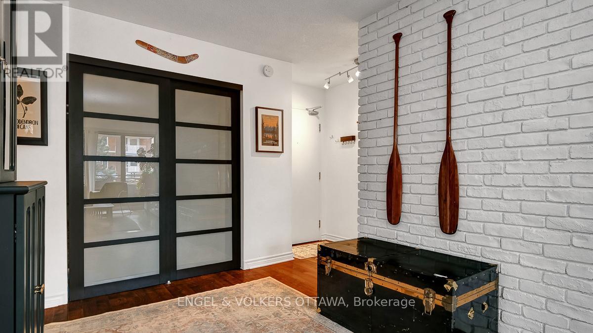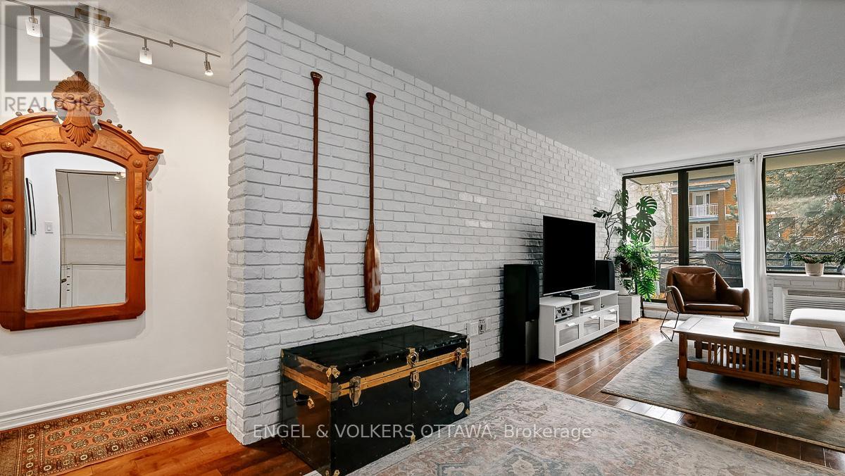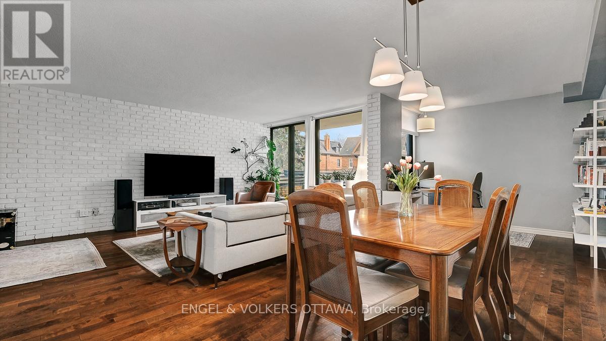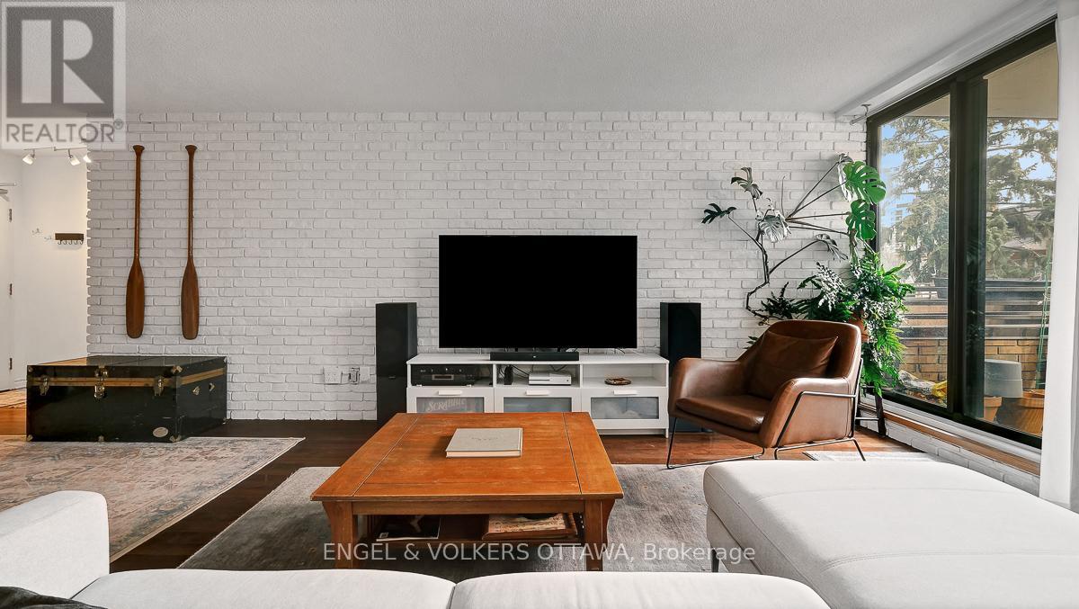 Welcome to this bright and inviting two bedroom plus den unit in a highly sought after building, perfectly positioned in the heart of the Golden Triangle. Offering a blend of comfort and style, this centrally located home places you just moments from the Rideau Canal, the Parliament Buildings, and the vibrant shops and restaurants along Elgin Street.Inside, you will find hardwood flooring throughout, enhancing the warmth and character of the space. The renovated kitchen and updated main bathroom bring a fresh, modern feel, while the striking brick wall adds a contemporary design element that truly stands out. Large windows fill the unit with natural light, creating a sunny and uplifting atmosphere.The versatile den offers the perfect space for a home office or reading nook. Two private balconies provide added outdoor enjoyment, ideal for morning coffee or unwinding at the end of the day.With a functional layout, stylish updates, and an unbeatable central location, this home is ideal for those seeking an urban lifestyle. Flexible closing available. Locker and underground parking included. (id:64974)