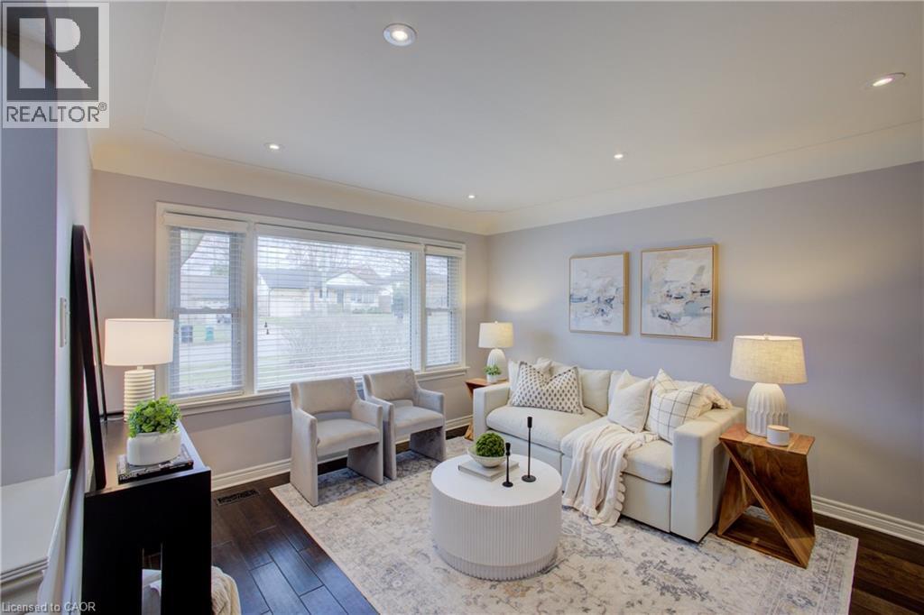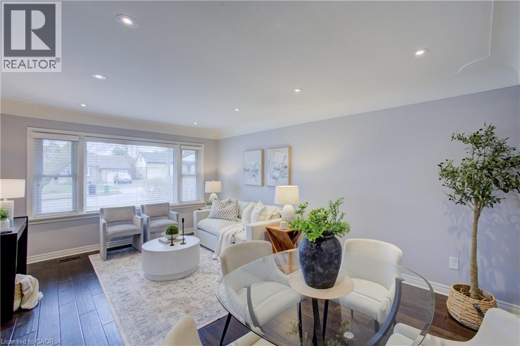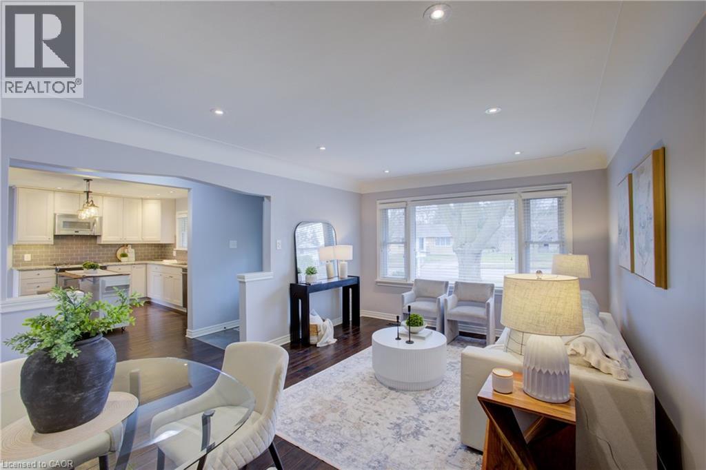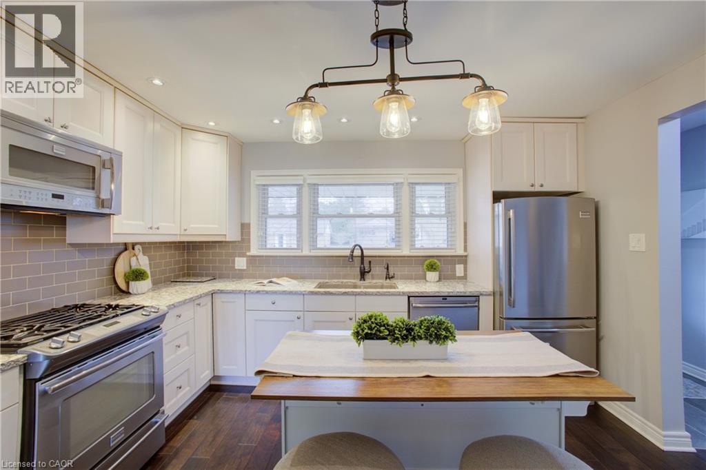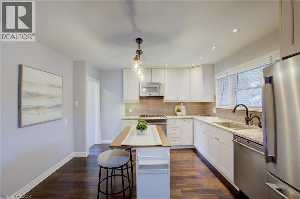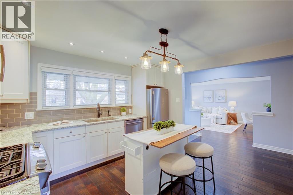 Beautifully updated 3 Bed, 2 bath bungalow in highly desirable neighbourhood. This bright, welcoming home offers a spacious open concept living and dining area, enhanced by pot lights and original cove moldings that perfectly blend timeless character with modern style. The fully renovated kitchen is a standout feature, showcasing elegant quartz countertops, stainless steel appliances, abundant cabinetry, and a pantry. Wide plank hardwood flooring runs throughout the main level, complemented by an updated four piece bathroom and three generously sized bedrooms. The thoughtful layout includes easy access from kitchen to backyard, basement and the garage. The fully finished basement provides exceptional additional living space, featuring a large recreation room with gas fireplace rough-in, a cozy family room that could be an office and a versatile hobby room. The finished laundry area is both functional and stylish, complete with washer and dryer, extra cabinetry, and a dedicated folding space. Step outside to your own private backyard with patio, mature perennial gardens, partial fencing and a garden shed. The concrete driveway accommodates two vehicles, in addition to the attached garage. Situated on a quiet street just minutes from Uptown Waterloo, parks, and convenient expressway access, this home offers the perfect combination of comfort, style, and location. (id:64974)