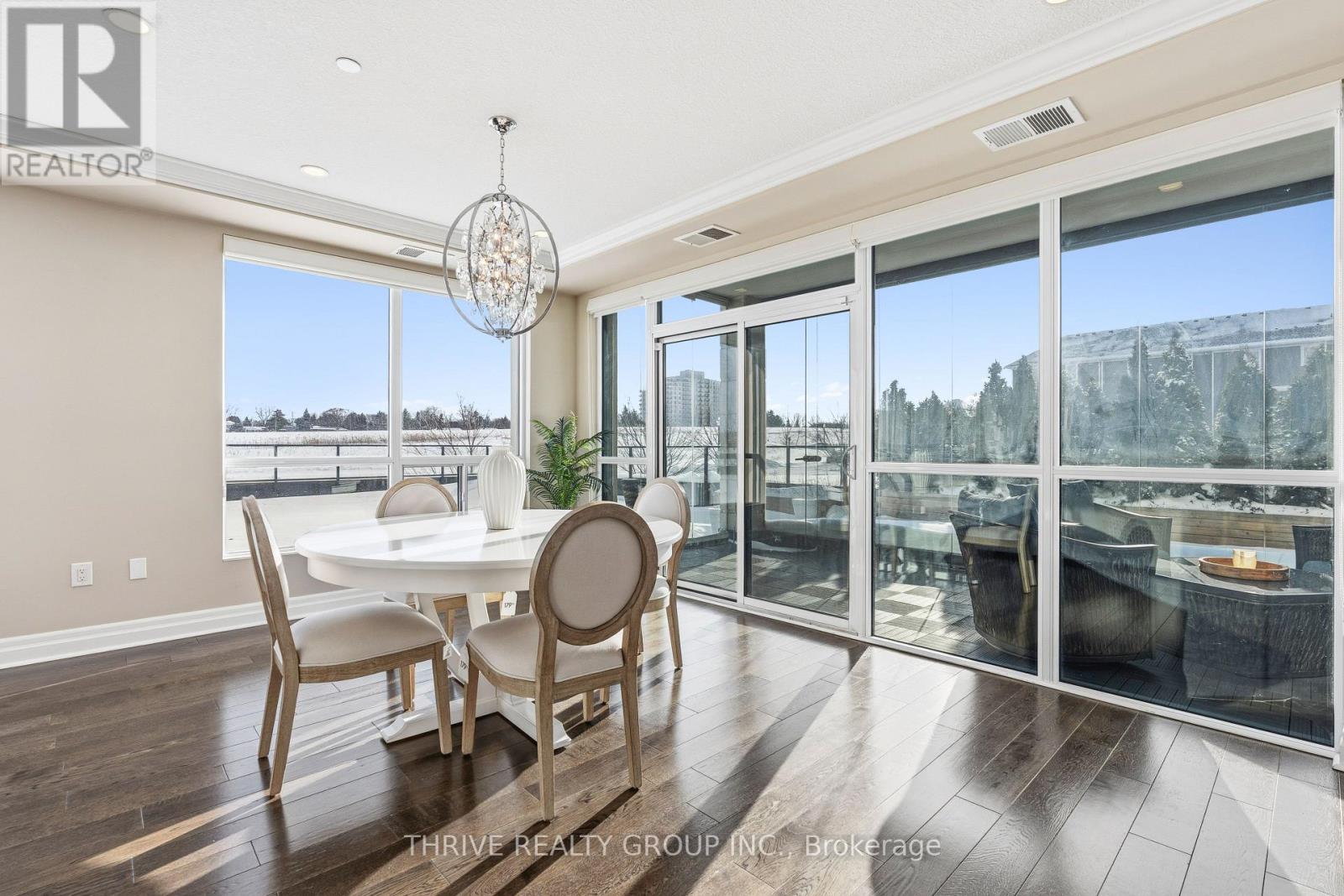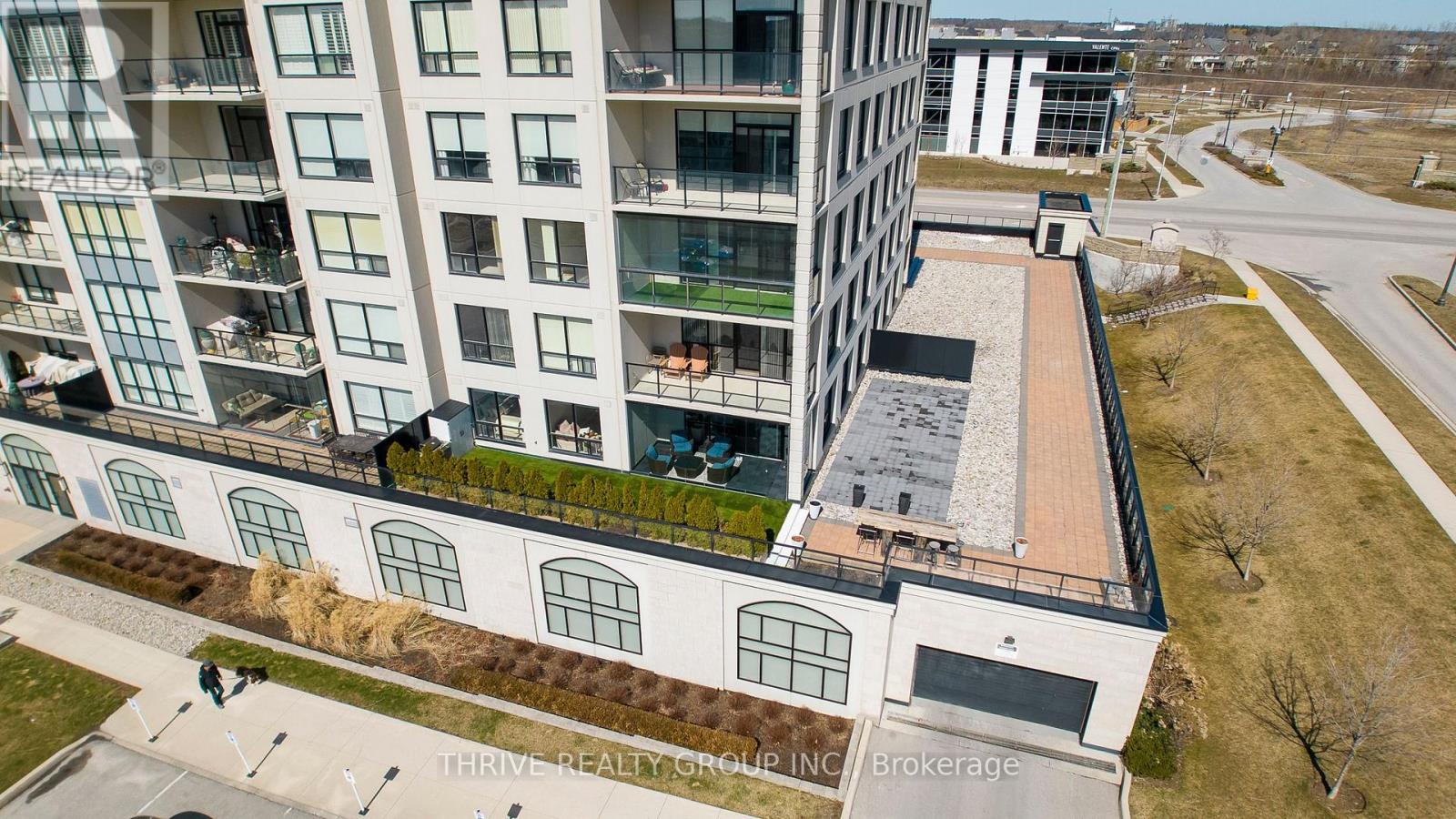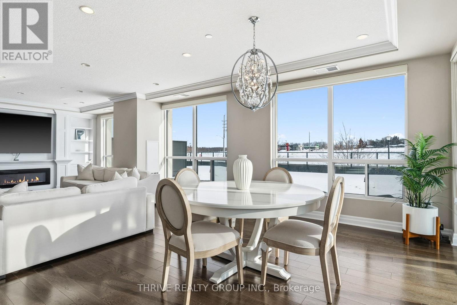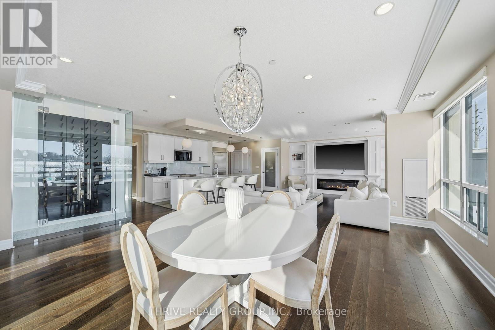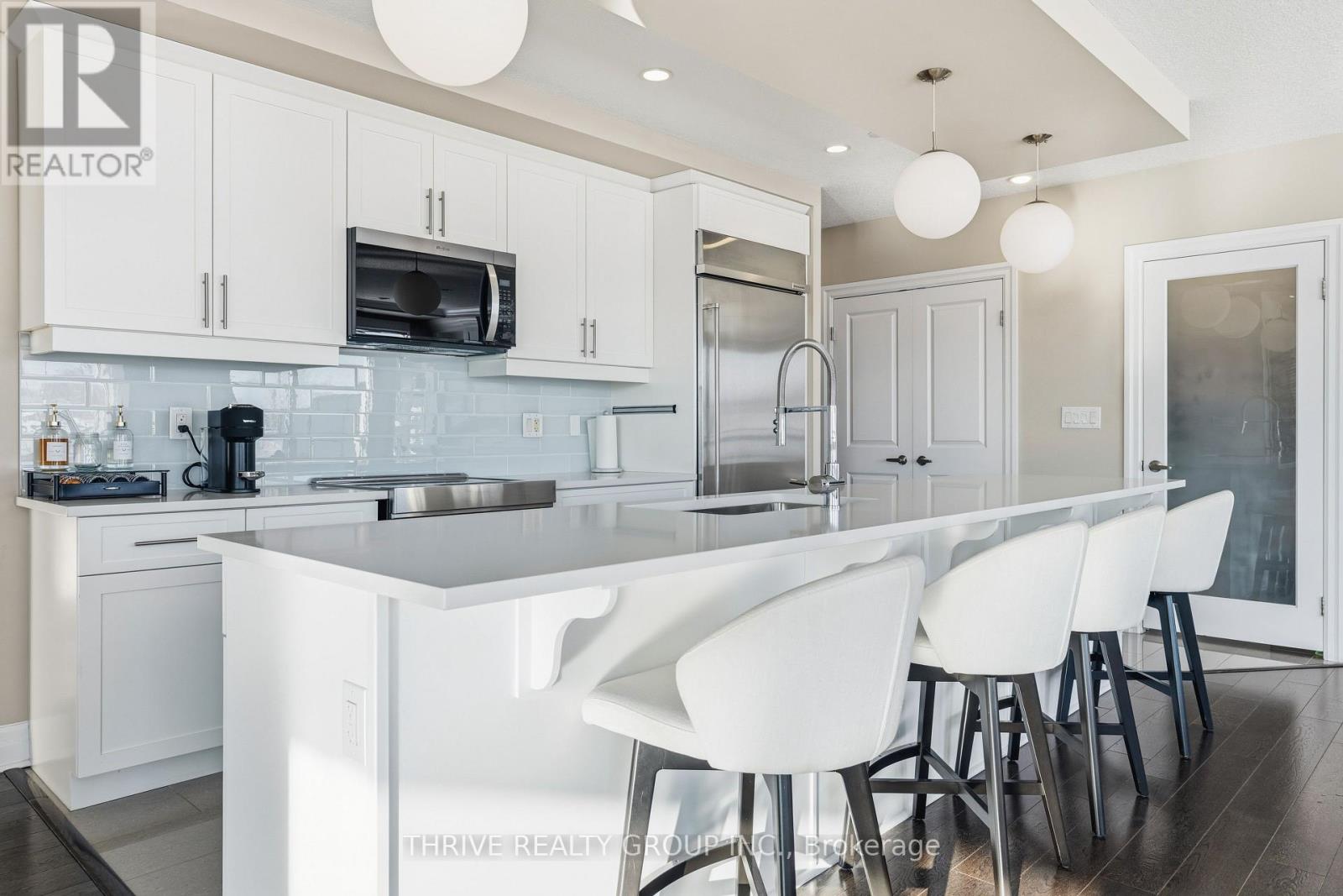 An exceptional executive residence offering the scale, privacy, and outdoor living of a penthouse-without high floors or long elevator wait times. This beautifully upgraded suite features 1,615 sq. ft. of refined interior space paired with a rare 2,342 sq. ft. exclusive-use terrace, creating an outstanding indoor-outdoor lifestyle.The open-concept Great Room is ideal for everyday living and elegant entertaining, seamlessly integrating generous living and dining areas with a striking chef's kitchen, all surrounded by expansive windows and natural light. Premium finishes include hardwood and porcelain tile flooring, extensive pot lighting, upgraded fixtures, and heated bathroom floors.The gourmet kitchen offers ceiling-height white cabinetry, quartz countertops, stainless steel appliances including a built in counter-depth refrigerator, designer tile backsplash, an oversized 12-foot island with seating for four, and a walk-in pantry. The living area features custom built-ins and an extended linear fireplace, with the dining space accented by a glass-enclosed wine display. The primary bedroom retreat accommodates a king-size bed and includes a walk-in closet and a spa-inspired five-piece ensuite with granite countertops, double vanity, glass and tile shower, soaker tub, and heated floors. The second bedroom is ideal as a guest suite or home office. A three-season Lumon sunroom with floor-to-ceiling retractable glass and UV protection extends year-round enjoyment. Outdoor living is exceptional, with a south-facing terrace featuring astroturf and cedar hedge border, plus an expansive open patio with eastern exposure-perfect for entertaining and sunrise views.Includes four underground parking spaces and an owned storage locker. Building amenities include an indoor pool, fitness centre, dining room, billiards room, library/lounge, and theatre. Desirable North London location near shopping, golf, hospitals, and nature trails. Condo fees include heat and air conditioning. (id:64974)