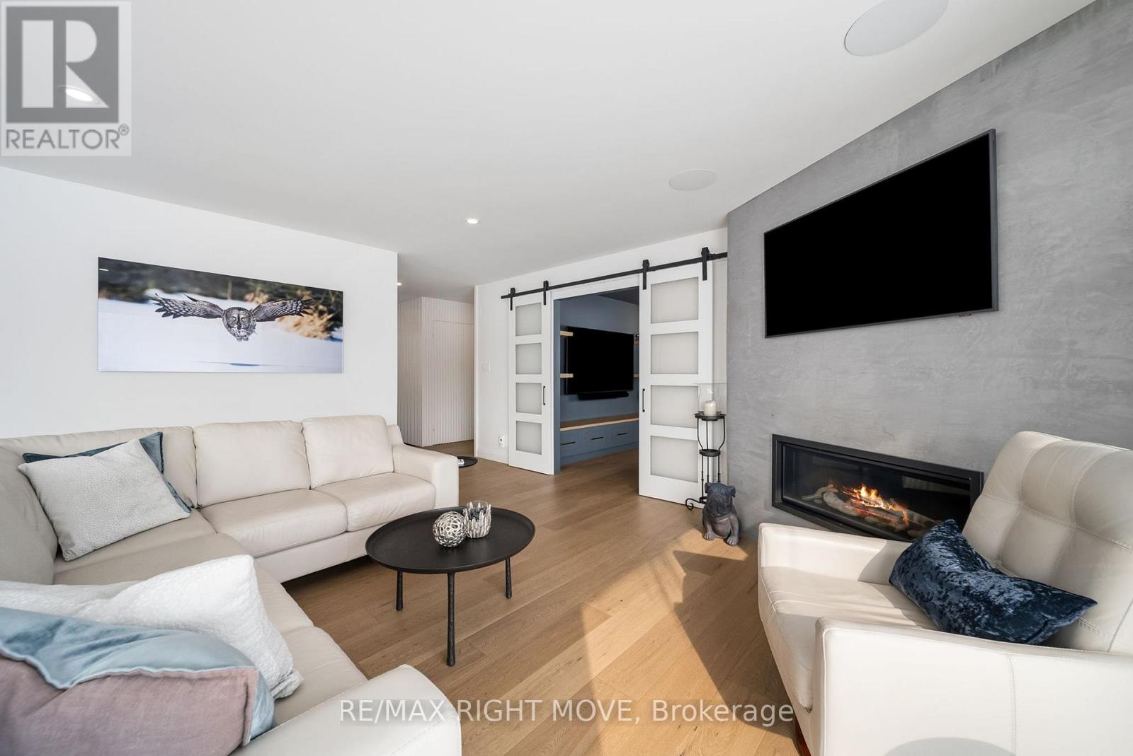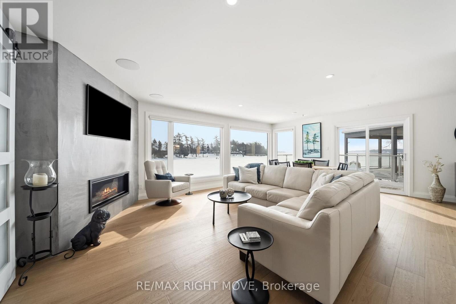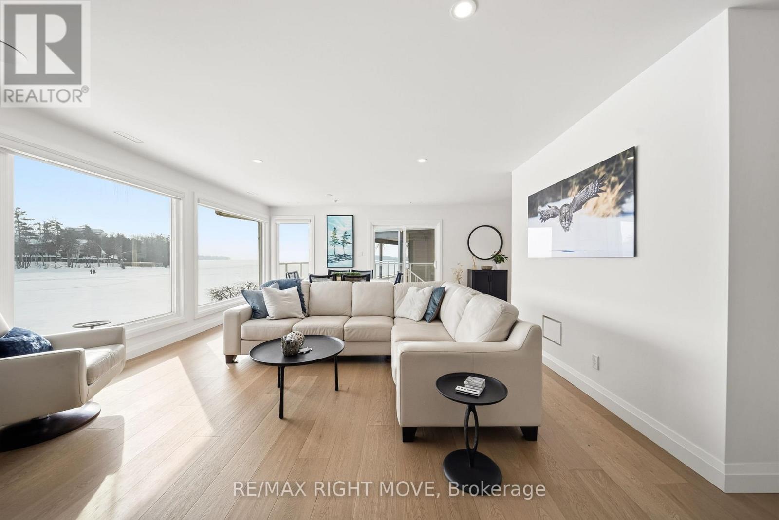 Spectacularly remodelled and exceptionally well finished, this waterfront condominium offers approximately 1,460 square feet of refined living space with breathtaking views of Lake Simcoe from the principal rooms. Extensive renovations were completed in 2023 with careful attention to both function and design, resulting in one of the nicest condominium offerings in Orillia. The kitchen, living, and dining areas are all oriented toward the water, allowing the views to remain the focal point of the home, while a private balcony provides an ideal place to relax and enjoy the lakefront setting.The custom kitchen is both stylish and functional, complemented by quality appliances and a layout well suited for entertaining. The living area features a gas fireplace and in ceiling speakers, creating a comfortable and inviting atmosphere. One of the bedrooms is currently set up as a media room and has been designed specifically for movie nights, while still offering flexibility for other uses. The primary bedroom enjoys a peaceful outlook and custom window coverings. Engineered hardwood flooring, ceramic tile in key areas, custom closets, updated lighting, doors, trim, and hardware reflect the level of care taken throughout the unit. Residents enjoy access to a lakeside pool, spa area with sauna, and social room, along with two parking spaces, one garage and one outdoor, making this a rare opportunity to secure a meticulously updated waterfront condominium with outstanding views and lifestyle appeal. Roger's internet & wifi included in the maintenance fees. The unit comes with it own Boat Slip. (id:64974)