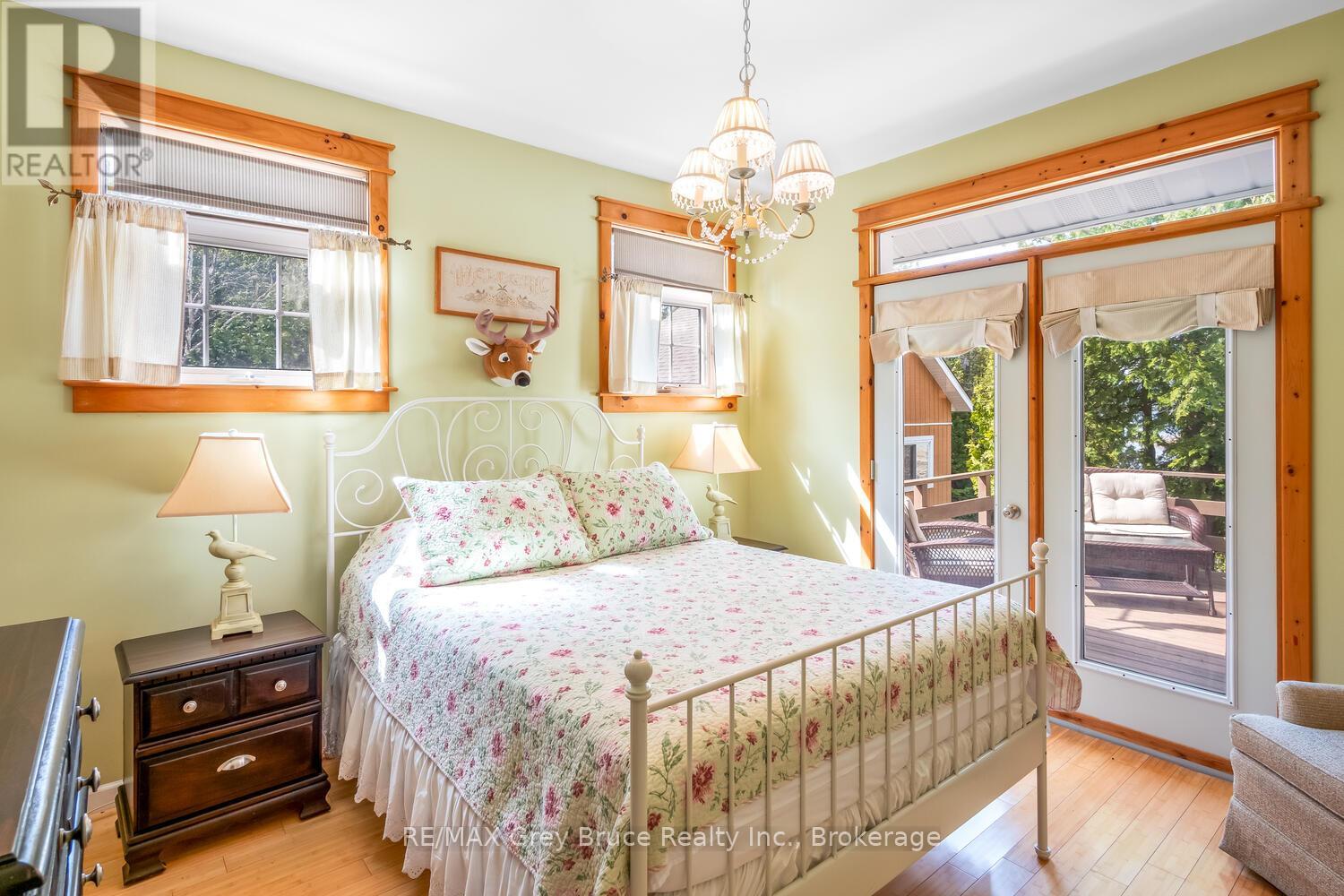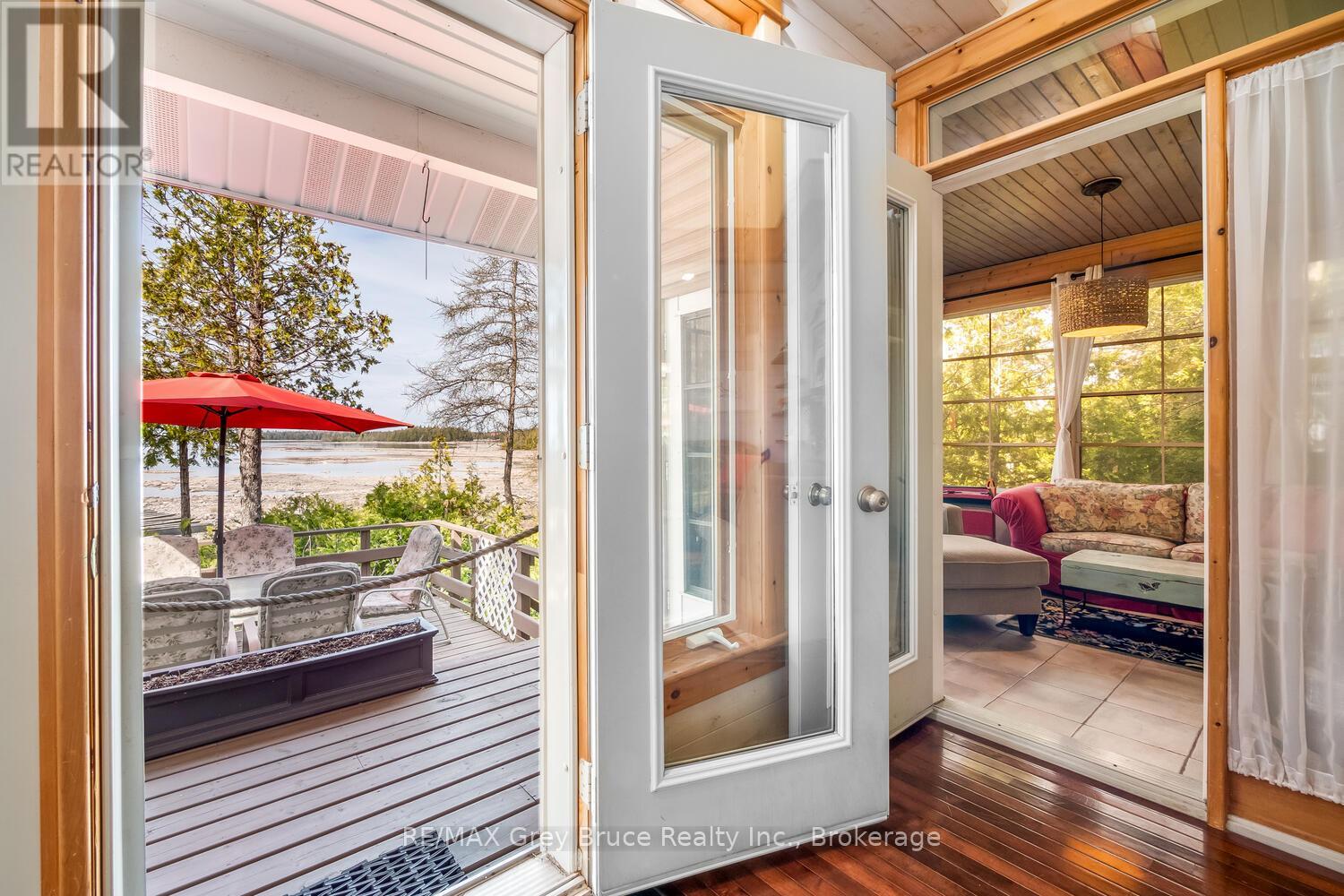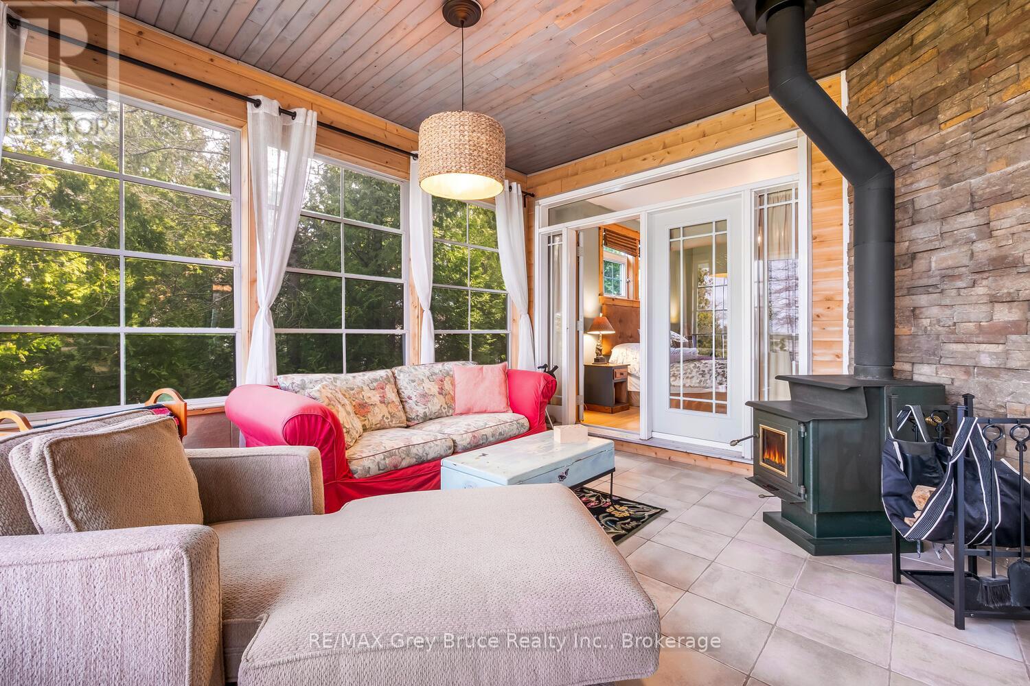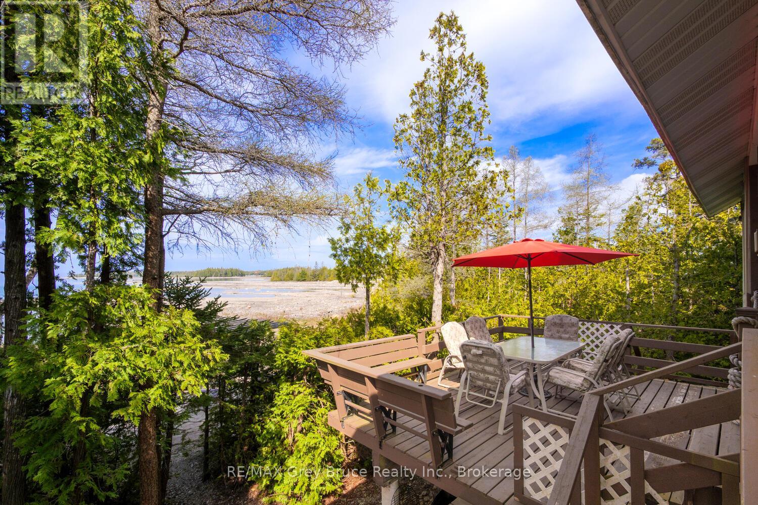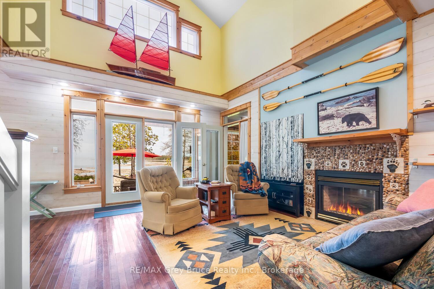 Turn-key Lakefront Home/Cottage with Sandy Shoreline! Your Bruce Peninsula retreat near Tobermory awaits. Offering a rare sandy beach shoreline in a protected cove, this property is perfect for family getaways, weekend retreats or retirement living. Sited a short drive to Tobermory and directly across from the Bruce Peninsula National Park, this property delivers the ultimate four-season recreational lifestyle. Arrive via a winding, tree-lined driveway and step into a serene setting with panoramic lake views and spectacular sunsets. Enjoy outdoor living with expansive decks, a stone waterfront patio, and covered porches - ideal for relaxing, entertaining, or soaking in the natural surroundings. The clean, sandy-bottom waterfront offers easy entry for all ages-perfect for swimming, kayaking, paddleboarding, and endless summer fun. Evenings are made for campfires by the shore, with the gentle sound of waves completing the experience. Inside, this thoughtfully designed 3 bedroom, 2-bathroom home/cottage features a bright kitchen, dining, and living area with vaulted ceilings. A double-sided fireplace adds warmth and ambiance to both the living room and primary bedroom retreat. The main floor includes a spacious secondary bedroom, a full bath, plus a private primary suite with ensuite and walkout to a screened three-season sunroom. A perfect getaway for morning coffee or quiet evenings by the woodstove. The loft-style bedroom is a dream for kids, with space for bunk beds and play, or consider use as a home office, taking in the elevated lake views. Additional features include a detached garage with loft space for storage. Offered fully furnished (turnkey), this is a ready-to-enjoy waterfront property in one of Ontario's premier cottage country destinations. Close to hiking the Bruce Trail, the Grotto, Georgian Bay, and Lake Huron - this is your gateway to adventure and relaxation. (id:64974)