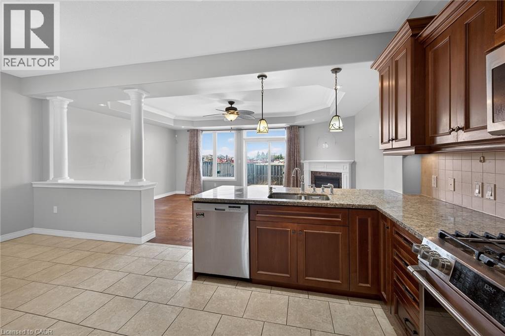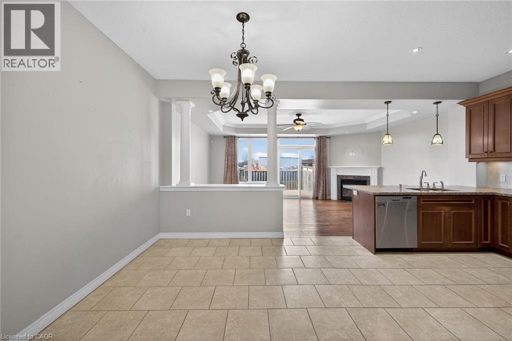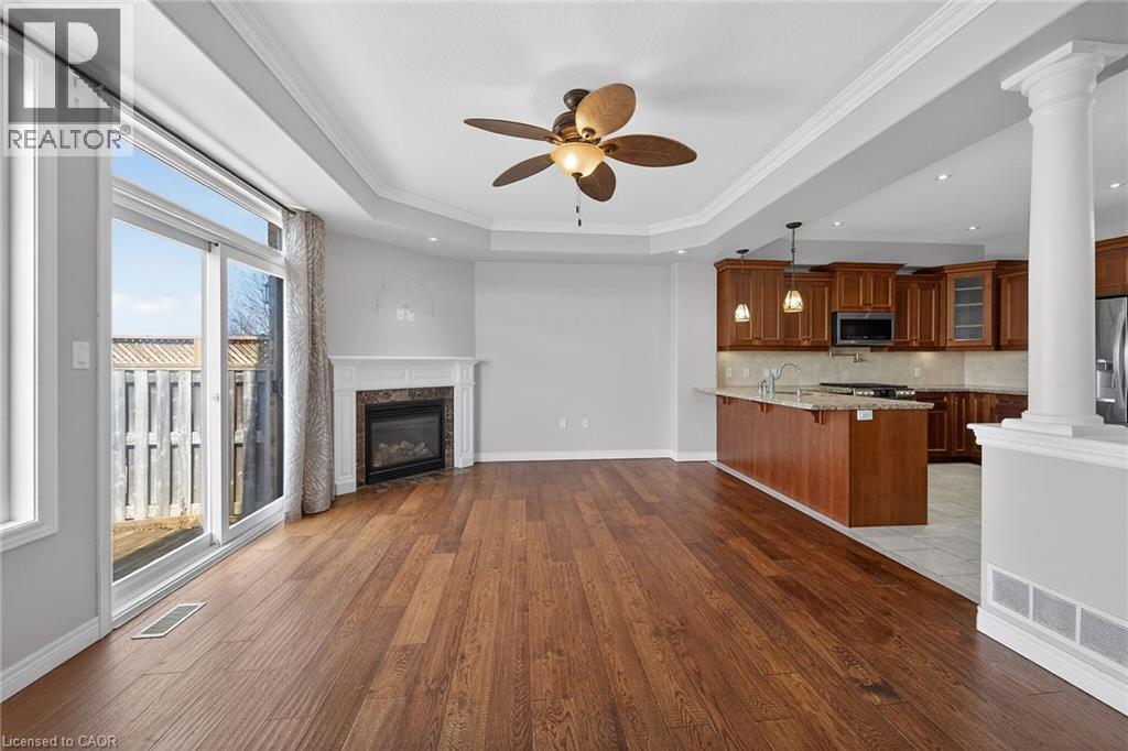 Spacious freehold townhome in desirable Binbrook location. Bright, open concept main level with large kitchen, dining room and living room. Cozy living room Patio door access from the living room to the rear yard. The kitchen features rich dark stained cabinets, granite counters and convenient breakfast bar. The living room is inviting with a cozy fireplace and gleaming hardwood floors. The upper level offers 3 bedrooms and 2 bathrooms. The primary bedroom has a private ensuite and a walk in closet. The two additional bedrooms, an office space and a second bathroom complete this level. The basement is fully finished with a rec room and a 3 pce bathroom. (id:64974)