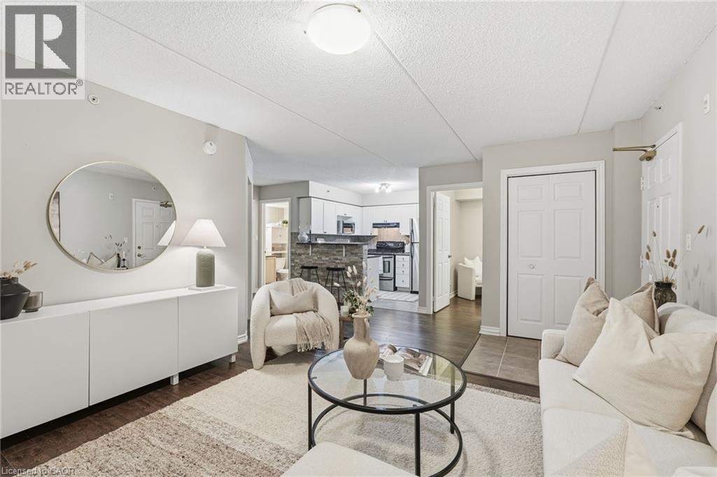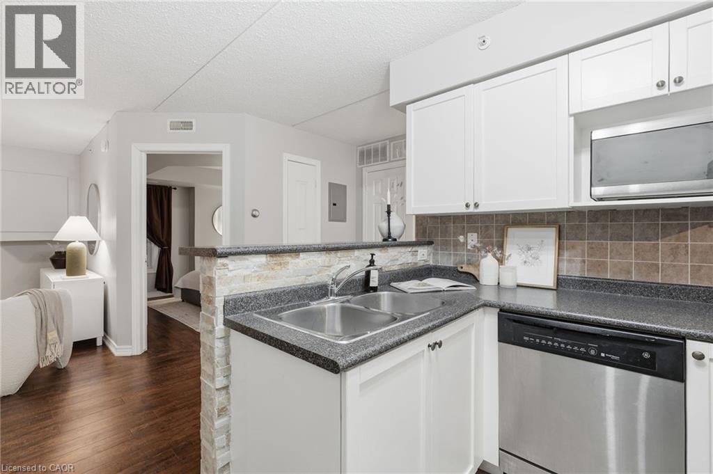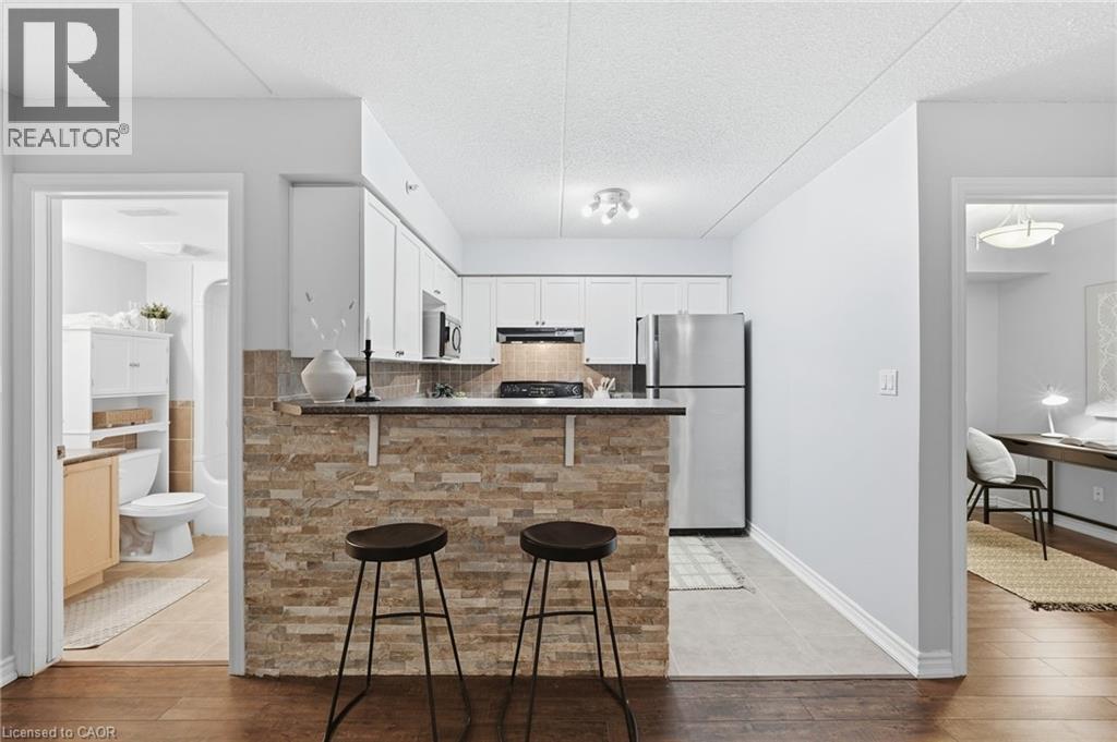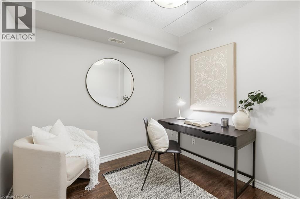 1 YEAR OF CONDO FEES PREPAID BY THE SELLER. Stylish, low-maintenance living in the heart of Burlington! This modern 1 bedroom plus den, 1 bathroom unit is the perfect fit for young professionals looking to own their first home or retirees seeking comfort, convenience, and lifestyle. Located just minutes from the QEW and Hwy 407, commuting is a breeze while being steps to restaurants, cafes, and all the shopping you need means keeping your time spent in the car to a minimum. Bright kitchen cabinetry and sleek laminate flooring throughout the main living space make this space fresh and move in ready. The spacious den provides an ideal work from home space or hobby room. Other conveniences include in-suite laundry, 1 underground parking space, and 1 locker for extra storage. Plus an additional bonus storage room can be found on the balcony for added convenience. Plenty of visitor parking means friends and family can drop by anytime. Residents also enjoy access to a fitness centre and party room, ideal for socializing or staying active without ever leaving home. Whether you’re working downtown, hybrid, or remote, this is a smart move in a fantastic location! Don't miss this opportunity to simplify your life without sacrificing style, comfort, or location! (id:64974)