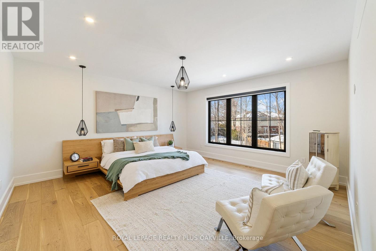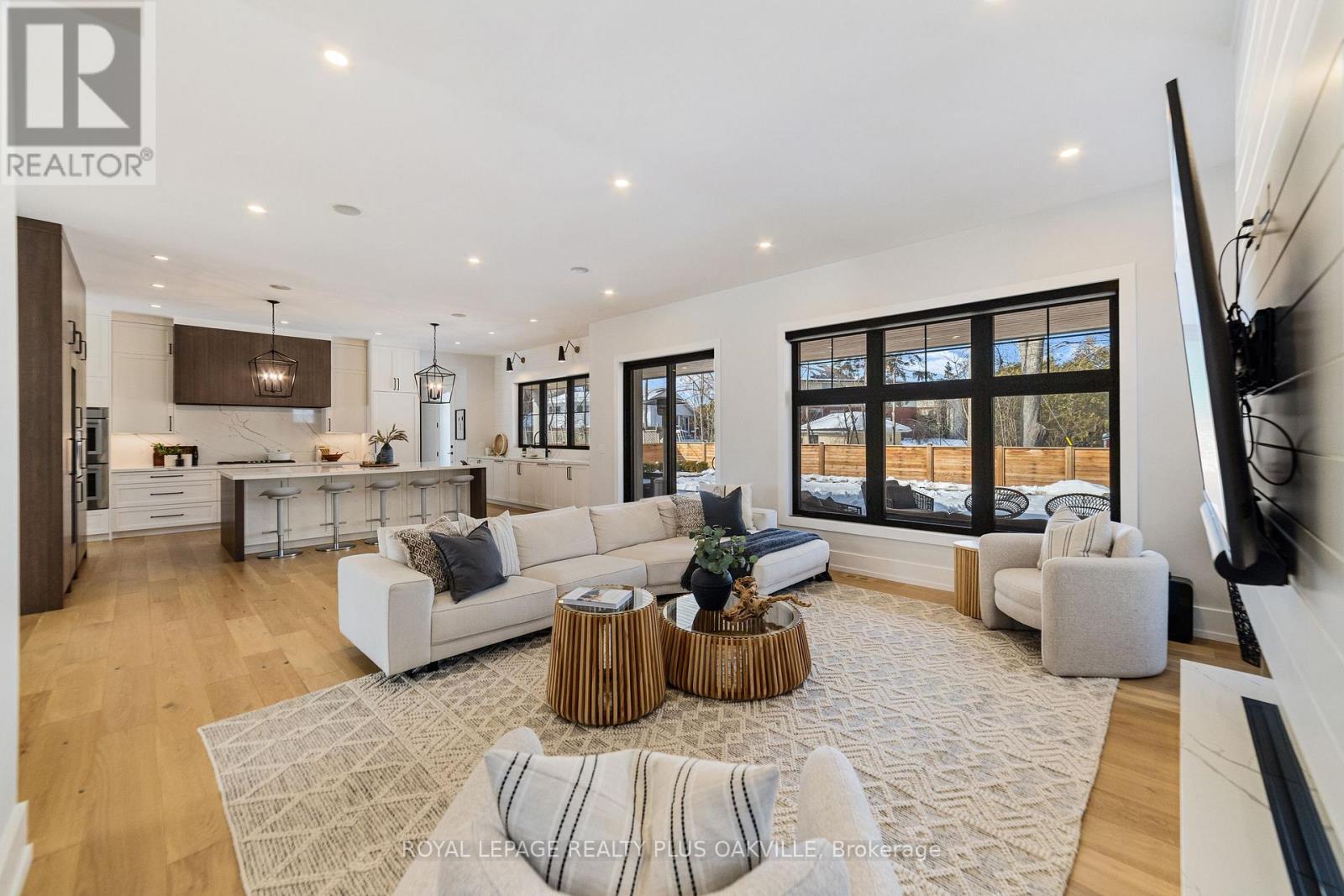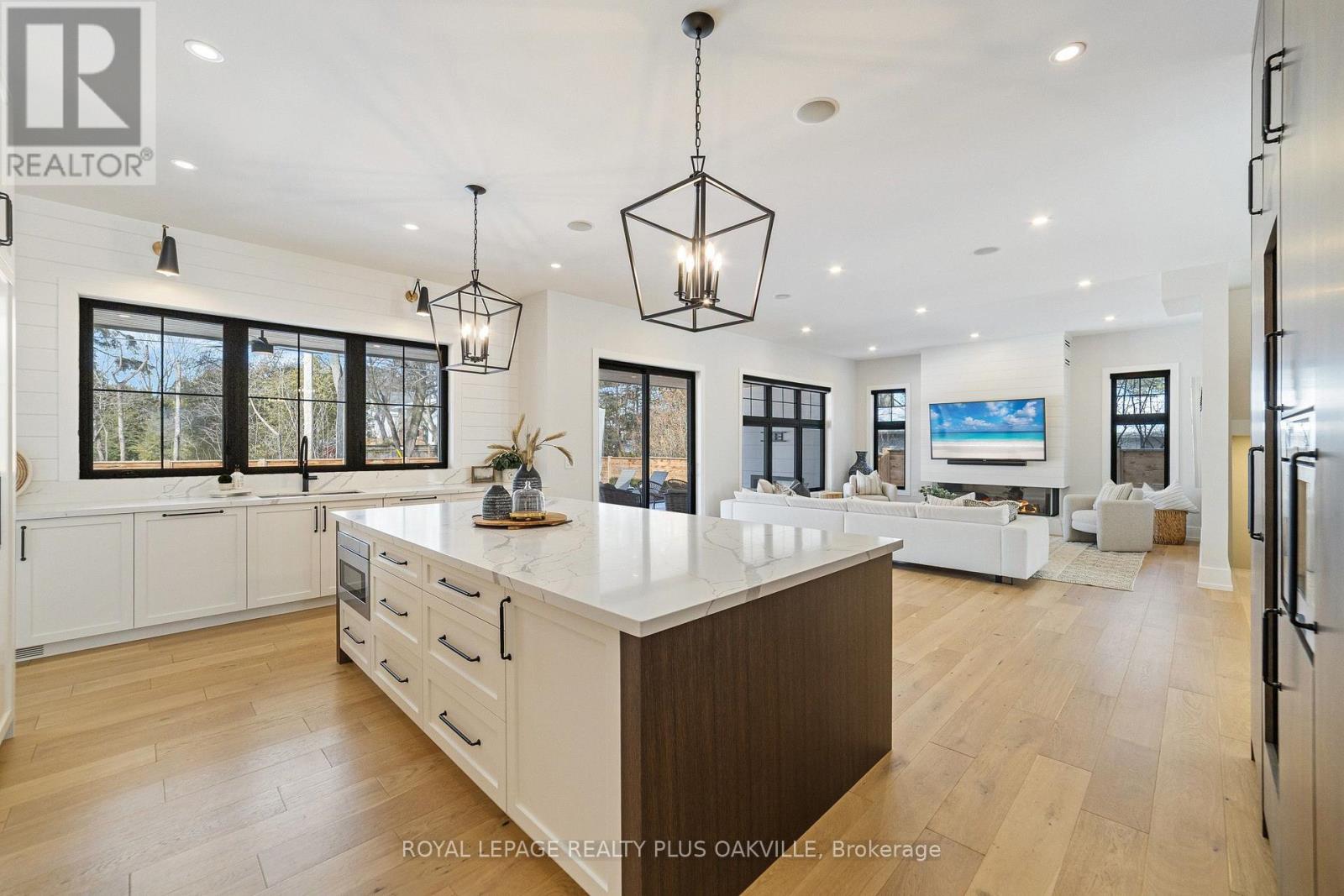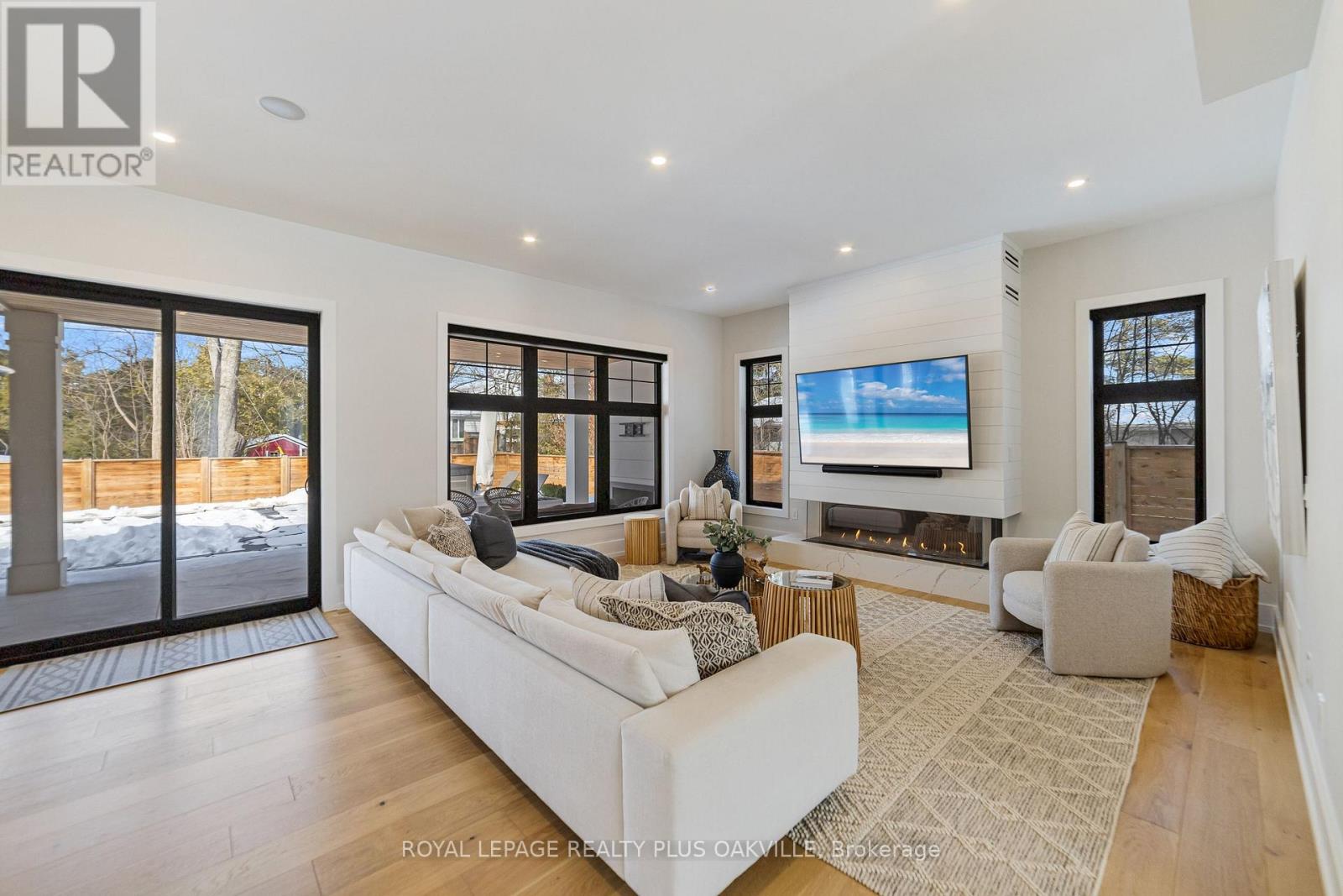 Stunning custom Modern Farmhouse (2022/2023) set on an expansive 85 x 133 ft lot on a quiet, family-friendly street just steps to the lake, Bronte Harbour, and Coronation Park. This exceptional residence blends sophisticated design with premium finishes and state-of-the-art functionality throughout. The open-concept main floor showcases soaring 10 ft ceilings, integrated ceiling speakers, designer farmhouse lighting, and automatic shutters. Sun-filled dining room with accent wall flows seamlessly into a showpiece chef's kitchen featuring Thermador appliances, dual wall ovens, 36" cooktop, integrated fridge, built-in coffee maker, dishwasher, and a Gaganeau wine fridge with 150-bottle capacity. The oversized island with custom storage and microwave drawer is complemented by a fully outfitted walk-in pantry with bespoke cabinetry and full-size stand-alone freezer. The family room is anchored by a dramatic three-sided 60" Napoleon glass fireplace with custom millwork. A private office, two elegant powder rooms, & a custom mudroom with backyard access complete the level. Upstairs offers 9 ft ceilings, skylit hallways, and four spacious bedrooms with walk-in closets and automatic shutters. The luxurious primary suite features custom barn doors, an expansive 12' x 11' dressing room, and a spa-inspired 5-pc ensuite. Two additional bathrooms, including a Jack & Jill, and a well-appointed laundry room provide exceptional convenience. The finished lower level adds approx. 1,500 sq ft of finished space with a gym, 5th bedroom, full bath, and recreation space with built-ins. Advanced HVAC, smart home integration, and ample storage complete the space. The private backyard oasis features a full-width covered living area with gas fireplace and outdoor kitchen with gas BBQ, heated saltwater pool with built-in bench, hot tub, cabana, professional landscaping, lighting, and irrigation. A heated, professionally finished double garage with Tesla charger completes this remarkable home (id:64974)