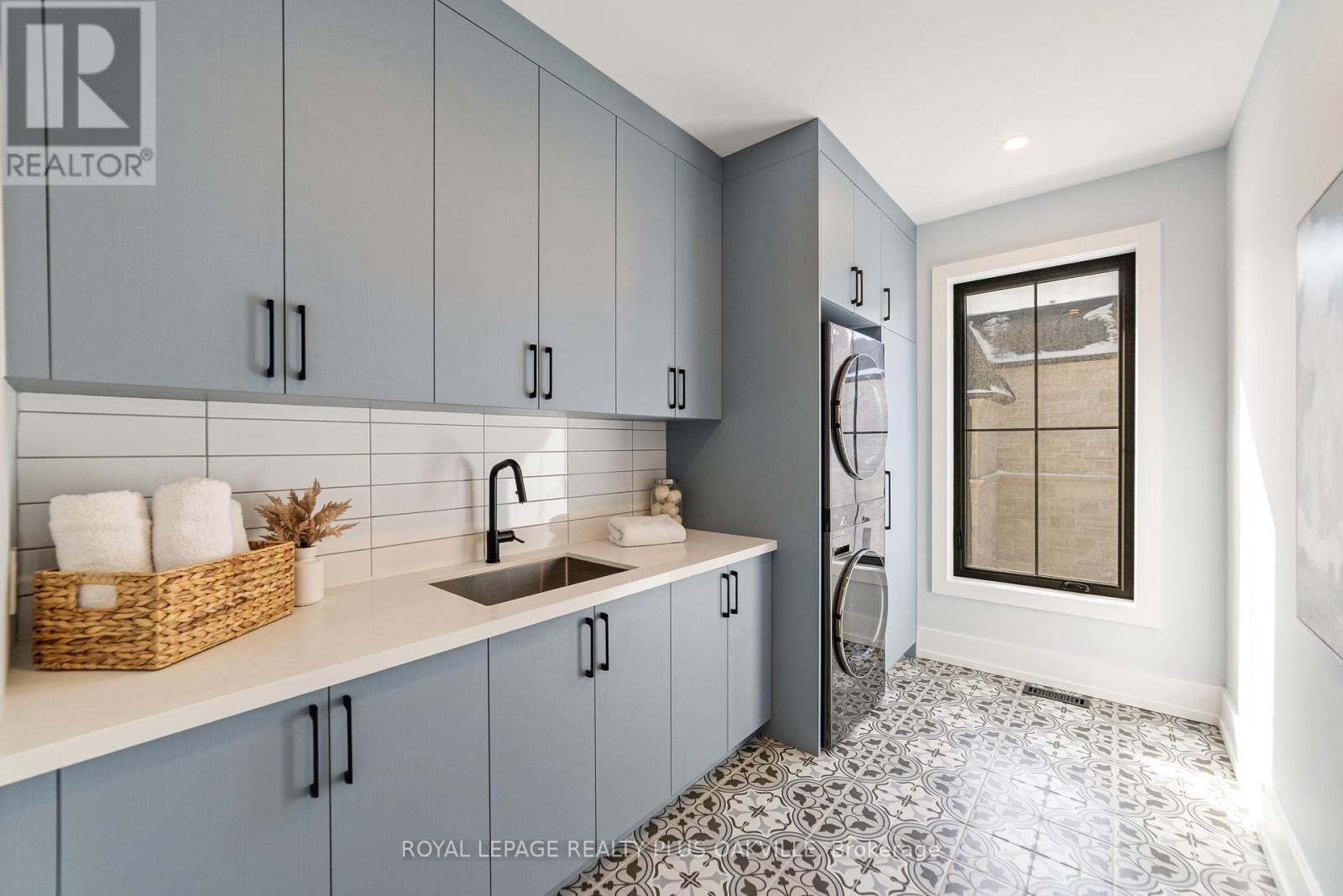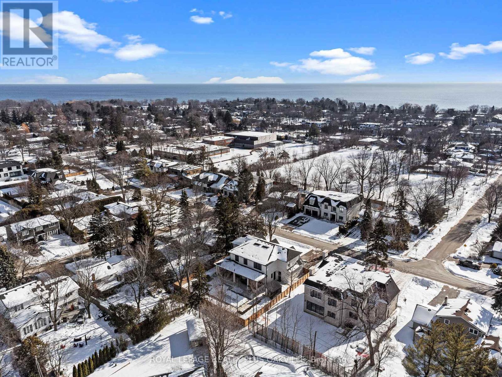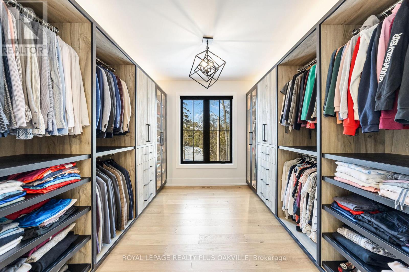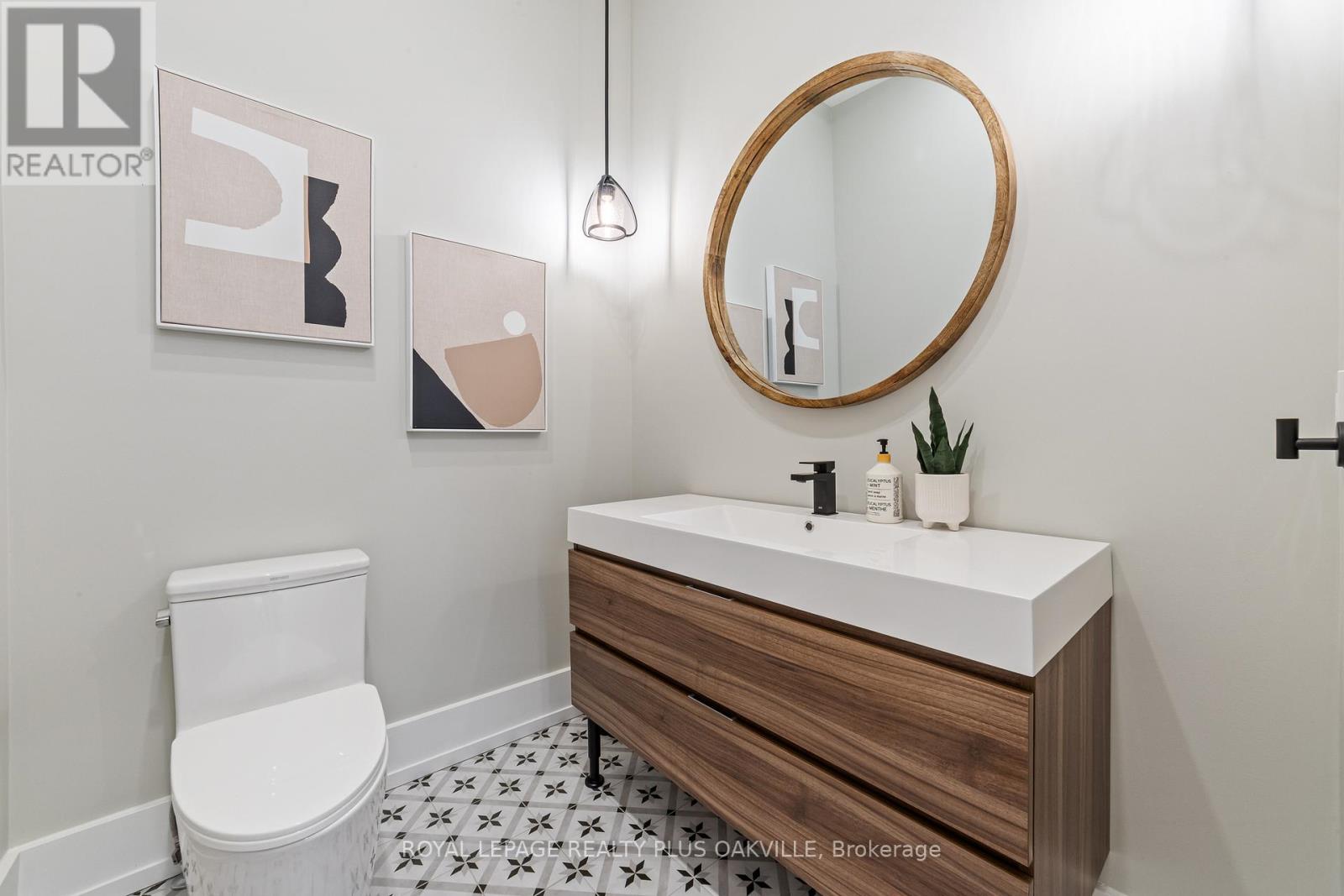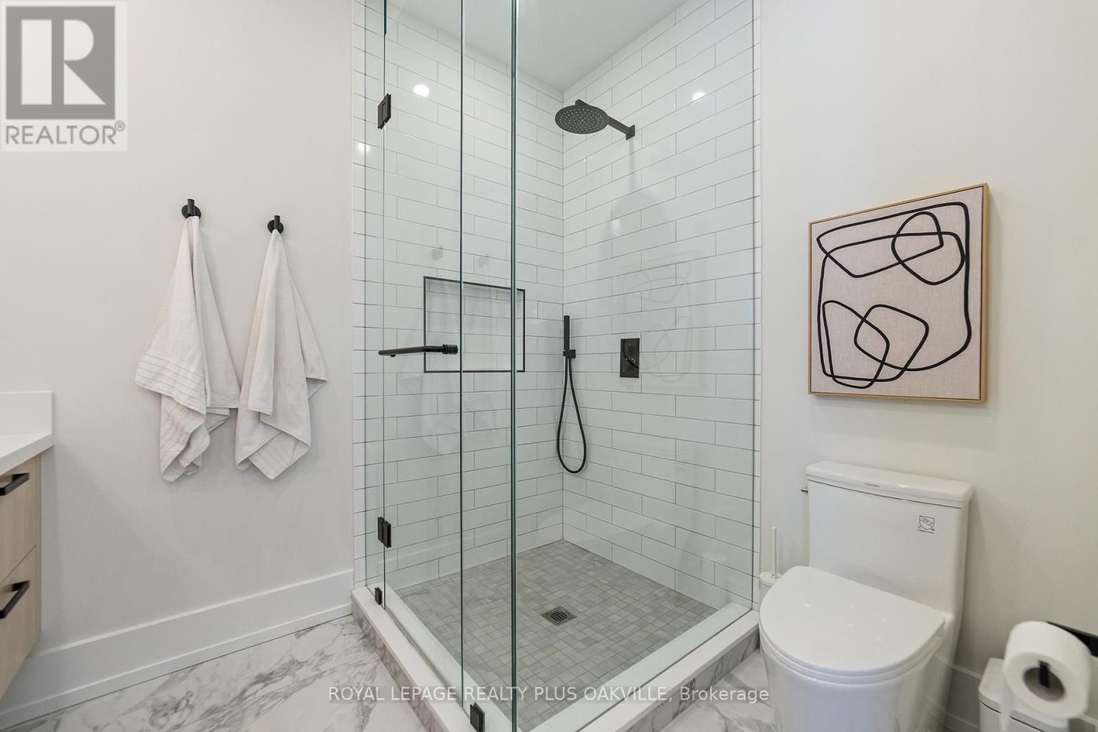 Stunning custom Modern Farmhouse (2022/2023) set on an expansive 85 x 133 ft lot on a quiet, family-friendly street just steps to the lake, Bronte Harbour, and Coronation Park. This exceptional residence blends sophisticated design with premium finishes and state-of-the-art functionality throughout. The open-concept main floor showcases soaring 10 ft ceilings, integrated ceiling speakers, designer farmhouse lighting, and automatic shutters. Sun-filled dining room with accent wall flows seamlessly into a showpiece chef's kitchen featuring Thermador appliances, dual wall ovens, 36" cooktop, integrated fridge, built-in coffee maker, dishwasher, and a Gaganeau wine fridge with 150-bottle capacity. The oversized island with custom storage and microwave drawer is complemented by a fully outfitted walk-in pantry with bespoke cabinetry and full-size stand-alone freezer. The family room is anchored by a dramatic three-sided 60" Napoleon glass fireplace with custom millwork. A private office, two elegant powder rooms, & a custom mudroom with backyard access complete the level. Upstairs offers 9 ft ceilings, skylit hallways, and four spacious bedrooms with walk-in closets and automatic shutters. The luxurious primary suite features custom barn doors, an expansive 12' x 11' dressing room, and a spa-inspired 5-pc ensuite. Two additional bathrooms, including a Jack & Jill, and a well-appointed laundry room provide exceptional convenience. The finished lower level adds approx. 1,500 sq ft of finished space with a gym, 5th bedroom, full bath, and recreation space with built-ins. Advanced HVAC, smart home integration, and ample storage complete the space. The private backyard oasis features a full-width covered living area with gas fireplace and outdoor kitchen with gas BBQ, heated saltwater pool with built-in bench, hot tub, cabana, professional landscaping, lighting, and irrigation. A heated, professionally finished double garage with Tesla charger completes this remarkable home (id:64974)