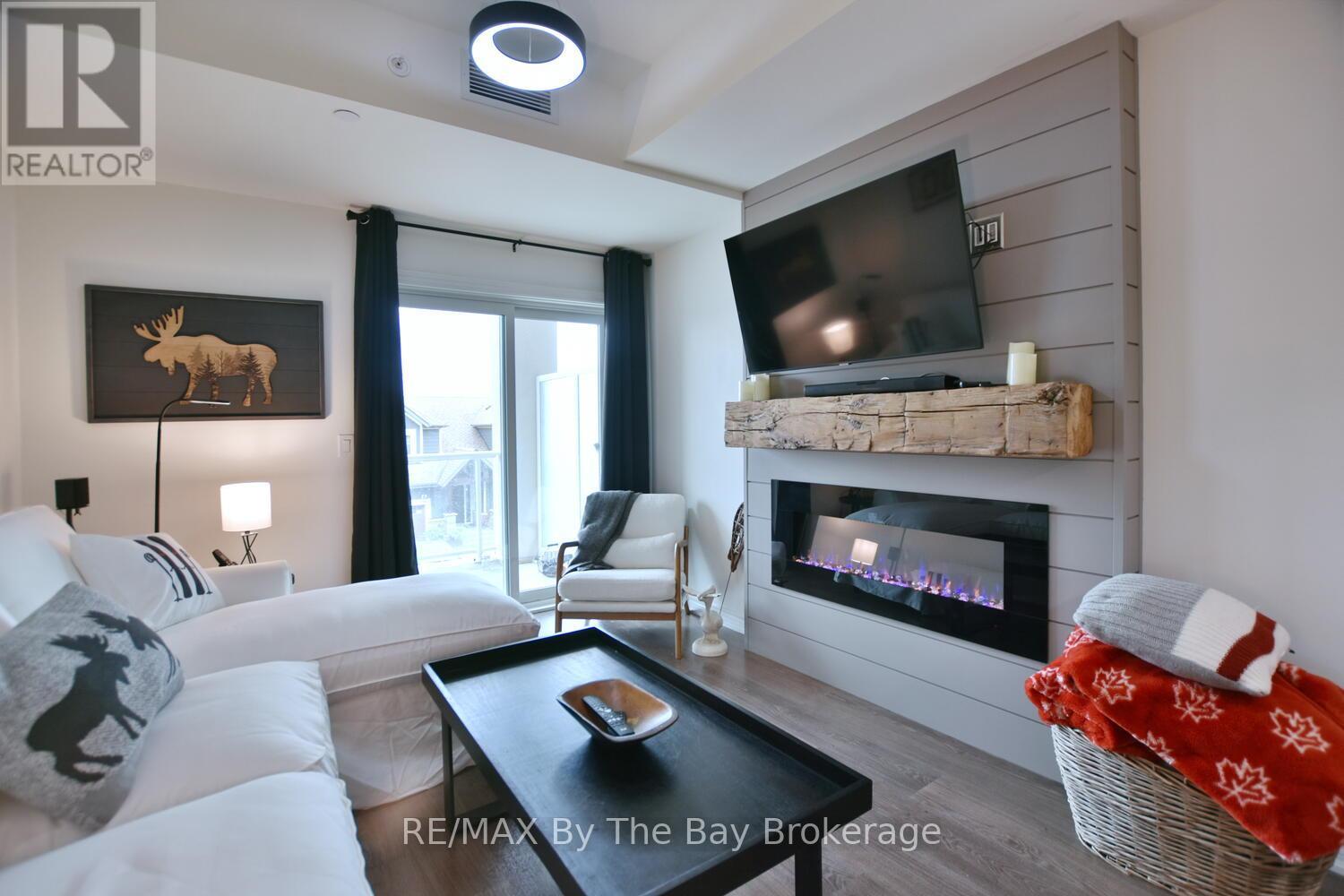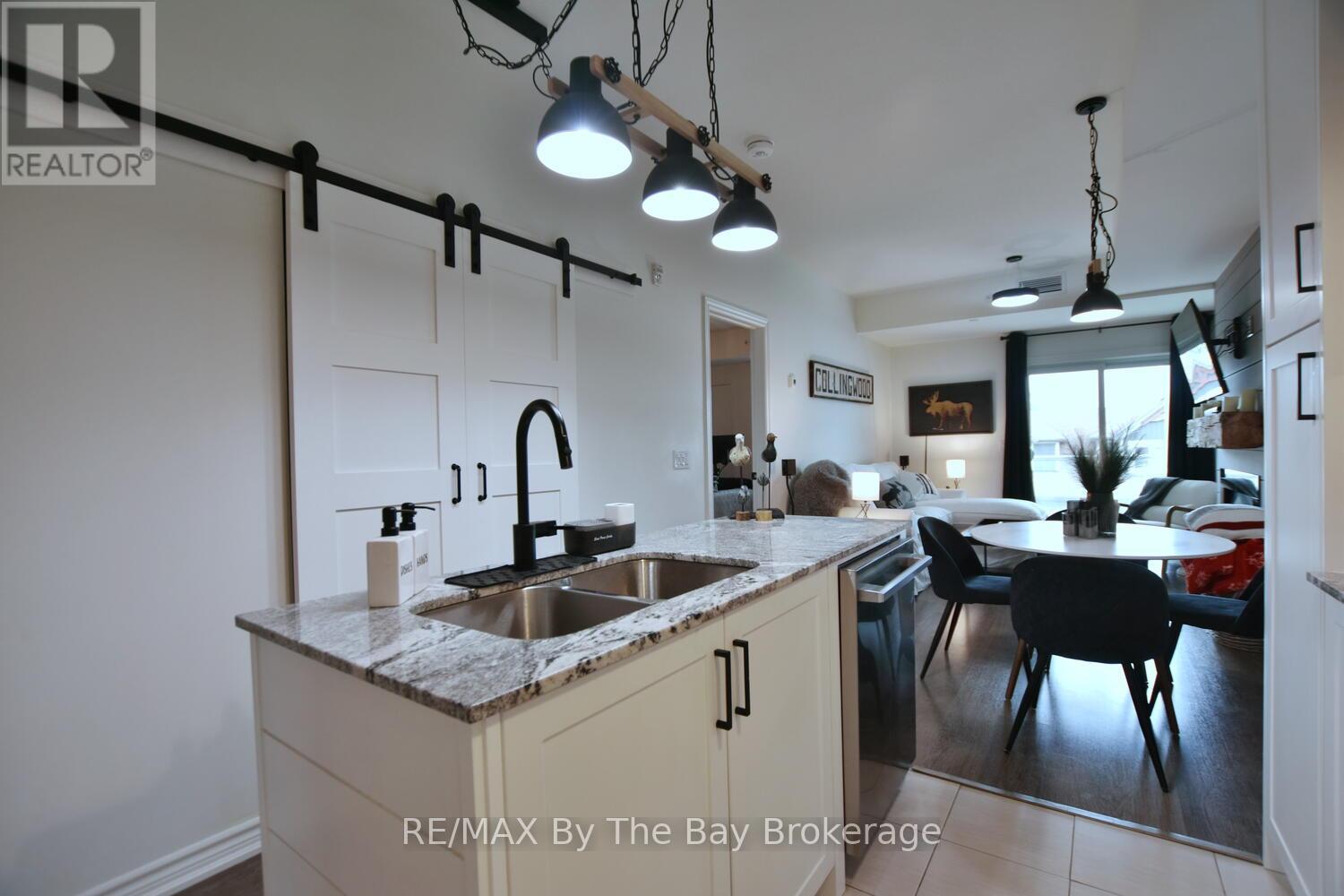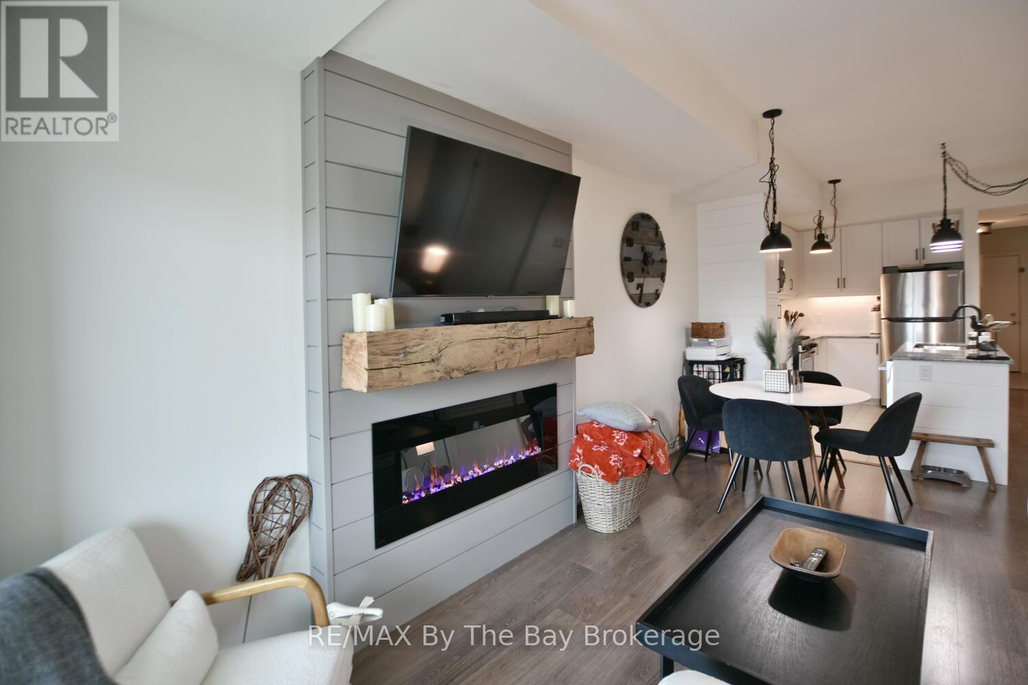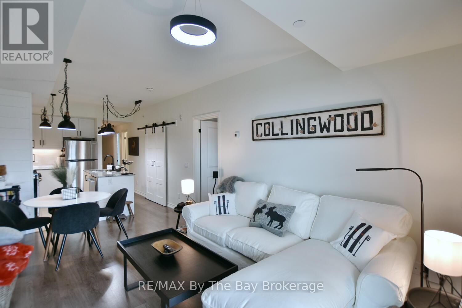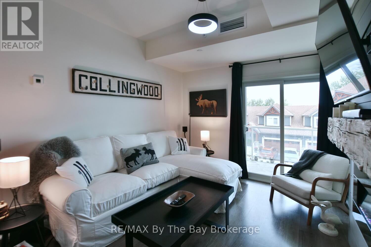 Welcome to Maintenance-Free Condo Living in the Heart of Collingwood. Discover the charm of Collingwood's sought-after Blue Fairway community with this beautifully appointed 2-bedroom, 2-bathroom condo. Perfectly situated just steps from the stunning Cranberry Golf Course, this condo offers the ultimate blend of luxury, comfort, and convenience. Step inside to an open-concept layout designed for modern living complete with beautiful upgraded lighting, barn doors and window coverings. The stylish upgraded kitchen features a large island, stainless steel appliances, accent lighting and custom cabinetry with updated hardware which is ideal for casual meals or entertaining guests. The bright living room with its cozy fireplace and dining area flows seamlessly together, creating a warm and inviting space. Both bedrooms are generously sized, and the spa-inspired bathrooms offer a touch of everyday indulgence. Extend your living outdoors on the spacious patio with serene distant views of the golf course and Blue Mountain in the distance. Practical touches include elevator access for easy grocery trips, underground parking, and a convenient storage locker. Residents enjoy exclusive access to the outdoor pool and recreation centre, making this the perfect four-season destination. Located close to restaurants, shopping, biking trails, golf, and skiing, this condo places the best of Collingwood right at your doorstep. (id:64974)
