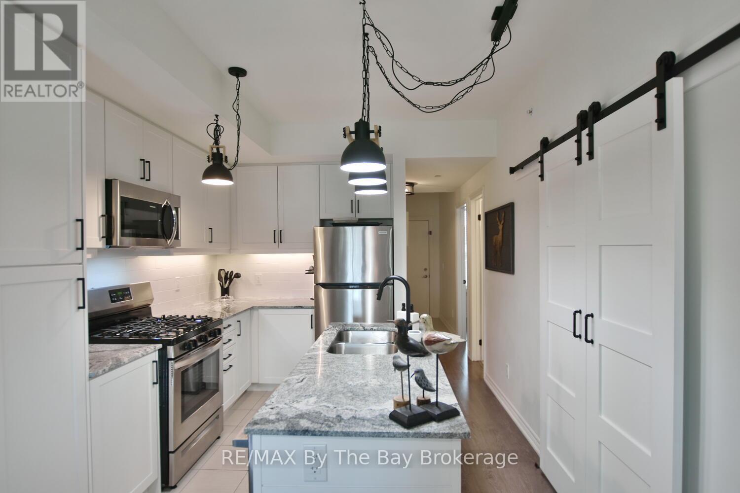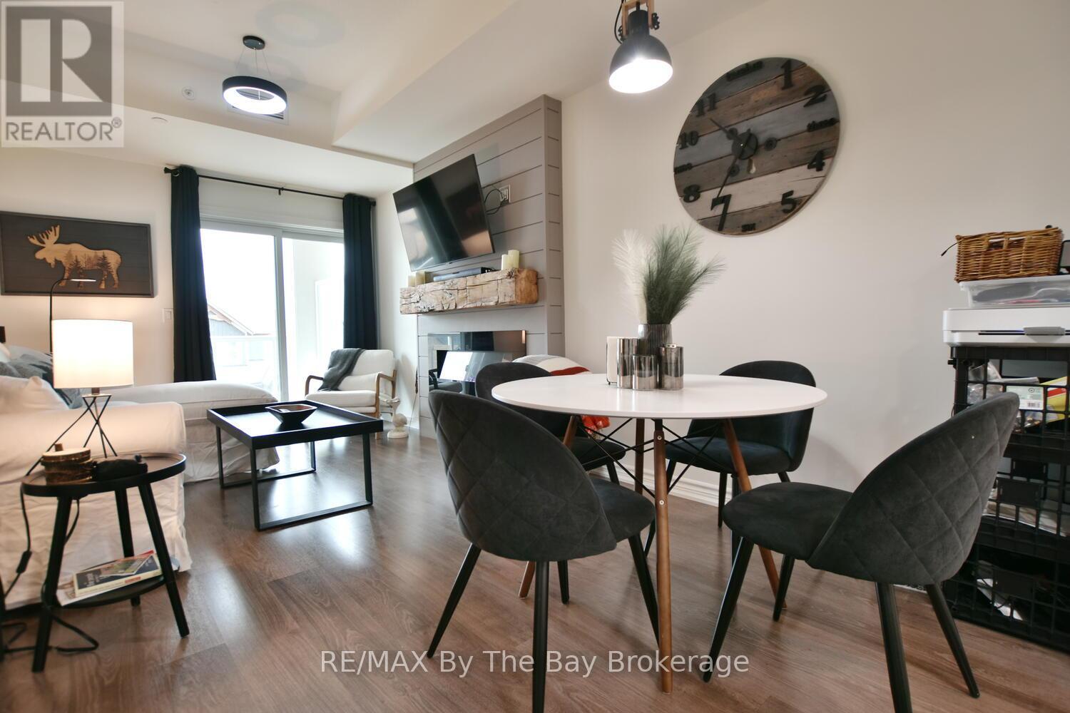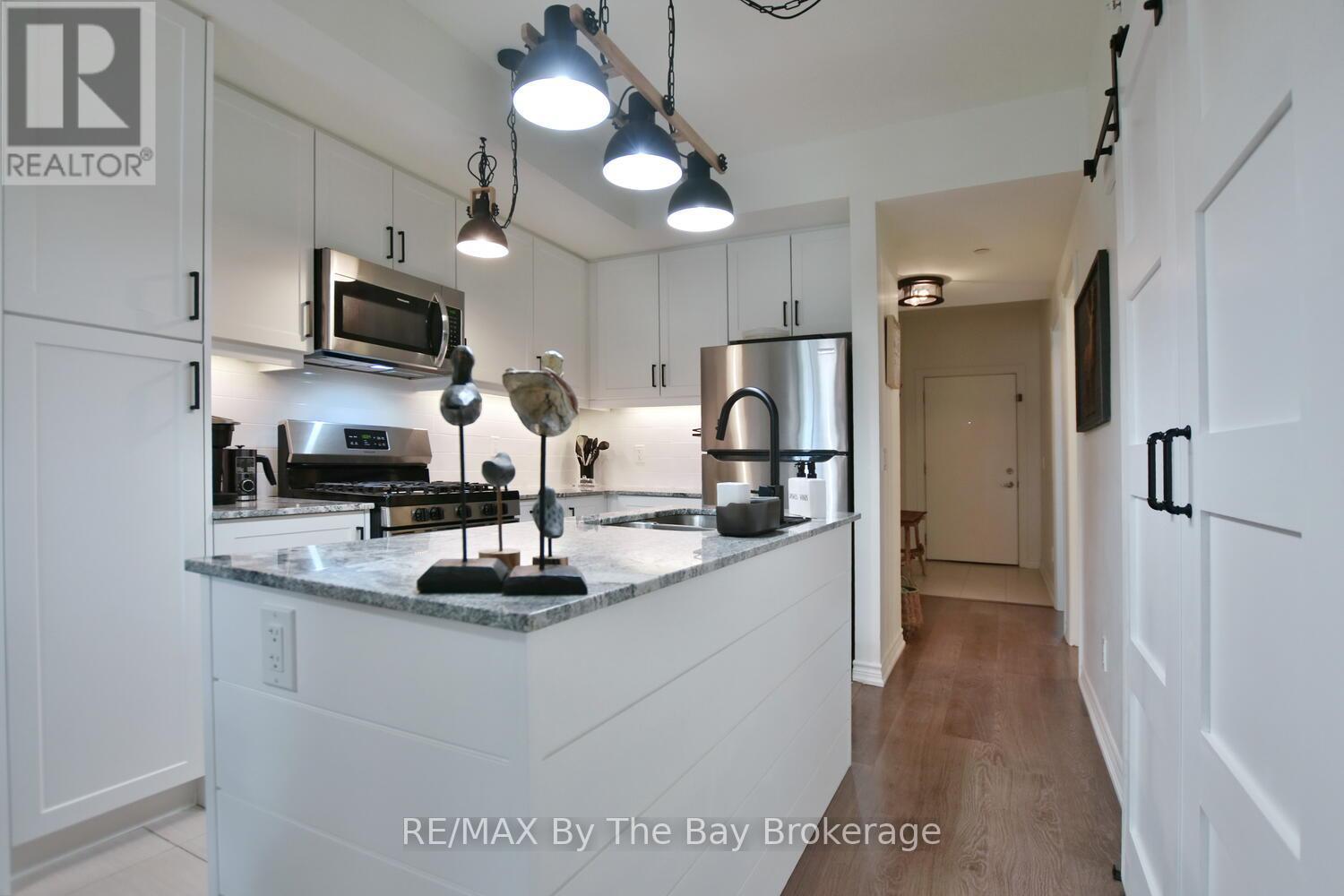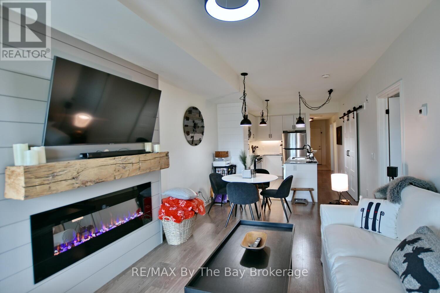 Welcome to Maintenance-Free Condo Living in the Heart of Collingwood. Discover the charm of Collingwood's sought-after Blue Fairway community with this beautifully appointed 2-bedroom, 2-bathroom condo. Perfectly situated just steps from the stunning Cranberry Golf Course, this condo offers the ultimate blend of luxury, comfort, and convenience. Step inside to an open-concept layout designed for modern living complete with beautiful upgraded lighting, barn doors and window coverings. The stylish upgraded kitchen features a large island, stainless steel appliances, accent lighting and custom cabinetry with updated hardware which is ideal for casual meals or entertaining guests. The bright living room with its cozy fireplace and dining area flows seamlessly together, creating a warm and inviting space. Both bedrooms are generously sized, and the spa-inspired bathrooms offer a touch of everyday indulgence. Extend your living outdoors on the spacious patio with serene distant views of the golf course and Blue Mountain in the distance. Practical touches include elevator access for easy grocery trips, underground parking, and a convenient storage locker. Residents enjoy exclusive access to the outdoor pool and recreation centre, making this the perfect four-season destination. Located close to restaurants, shopping, biking trails, golf, and skiing, this condo places the best of Collingwood right at your doorstep. (id:64974)