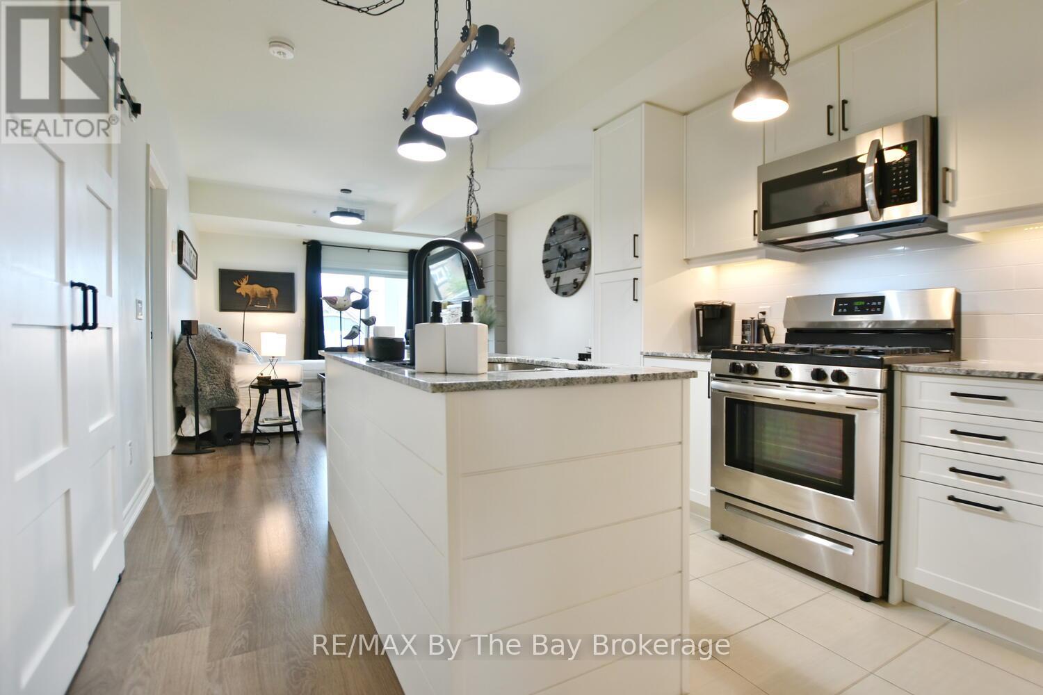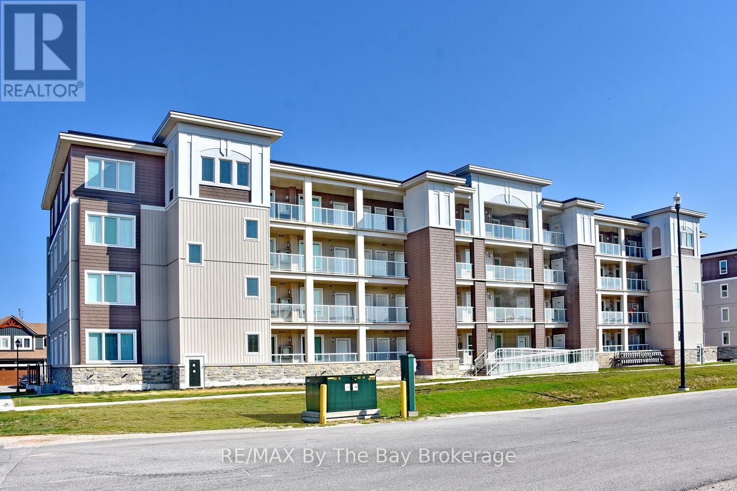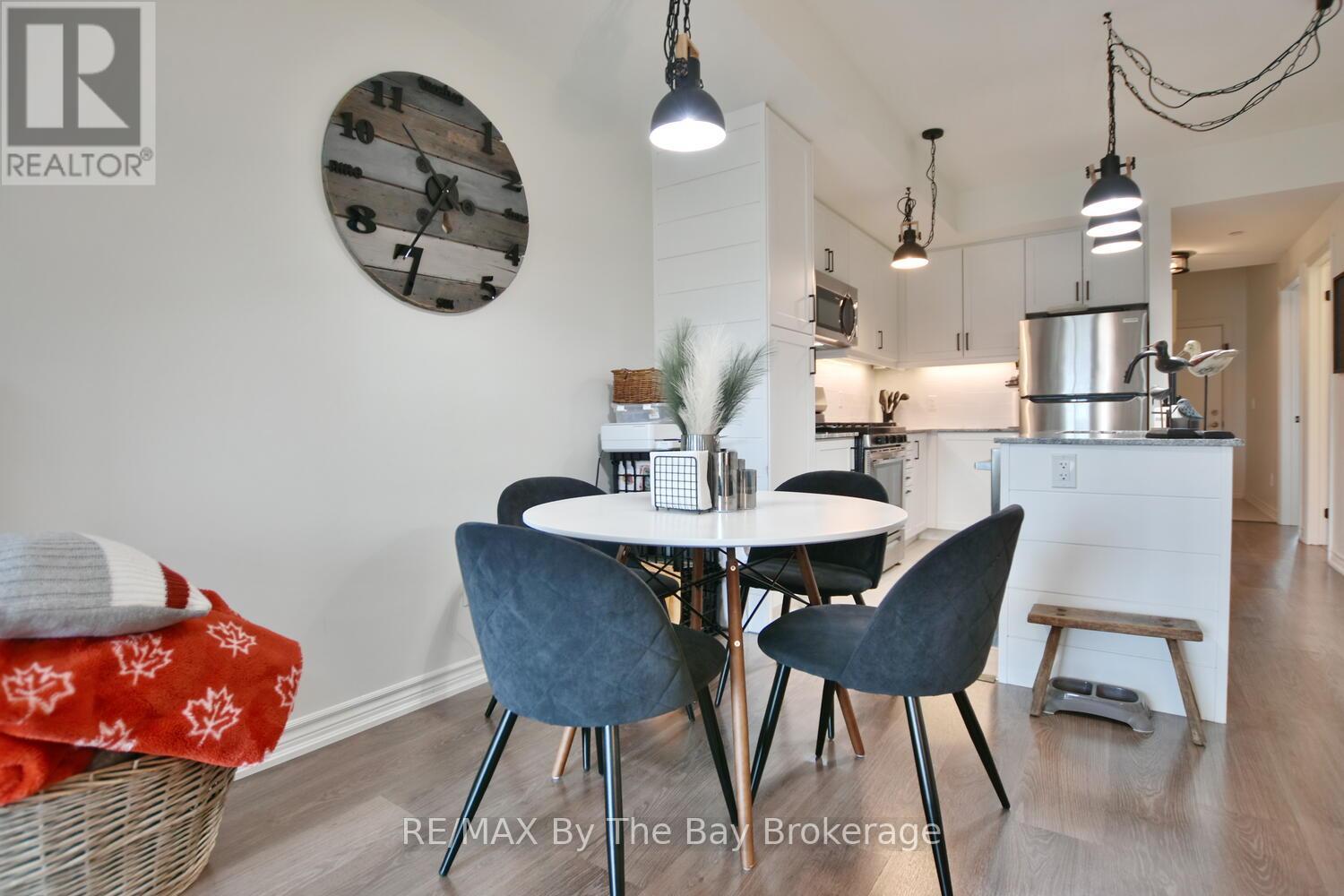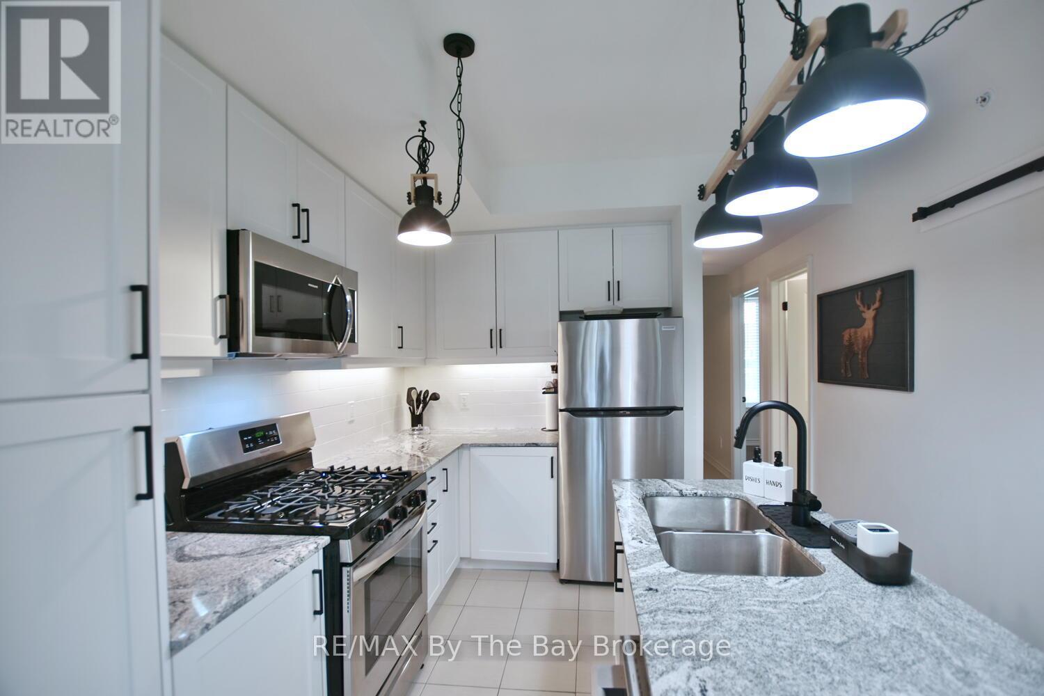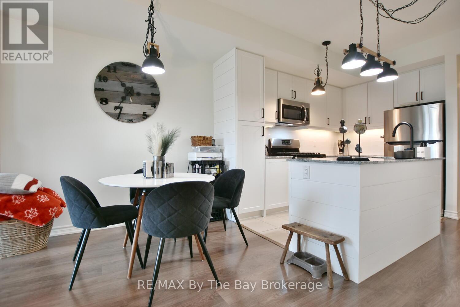 Welcome to Maintenance-Free Condo Living in the Heart of Collingwood. Discover the charm of Collingwood's sought-after Blue Fairway community with this beautifully appointed 2-bedroom, 2-bathroom condo. Perfectly situated just steps from the stunning Cranberry Golf Course, this condo offers the ultimate blend of luxury, comfort, and convenience. Step inside to an open-concept layout designed for modern living complete with beautiful upgraded lighting, barn doors and window coverings. The stylish upgraded kitchen features a large island, stainless steel appliances, accent lighting and custom cabinetry with updated hardware which is ideal for casual meals or entertaining guests. The bright living room with its cozy fireplace and dining area flows seamlessly together, creating a warm and inviting space. Both bedrooms are generously sized, and the spa-inspired bathrooms offer a touch of everyday indulgence. Extend your living outdoors on the spacious patio with serene distant views of the golf course and Blue Mountain in the distance. Practical touches include elevator access for easy grocery trips, underground parking, and a convenient storage locker. Residents enjoy exclusive access to the outdoor pool and recreation centre, making this the perfect four-season destination. Located close to restaurants, shopping, biking trails, golf, and skiing, this condo places the best of Collingwood right at your doorstep. (id:64974)