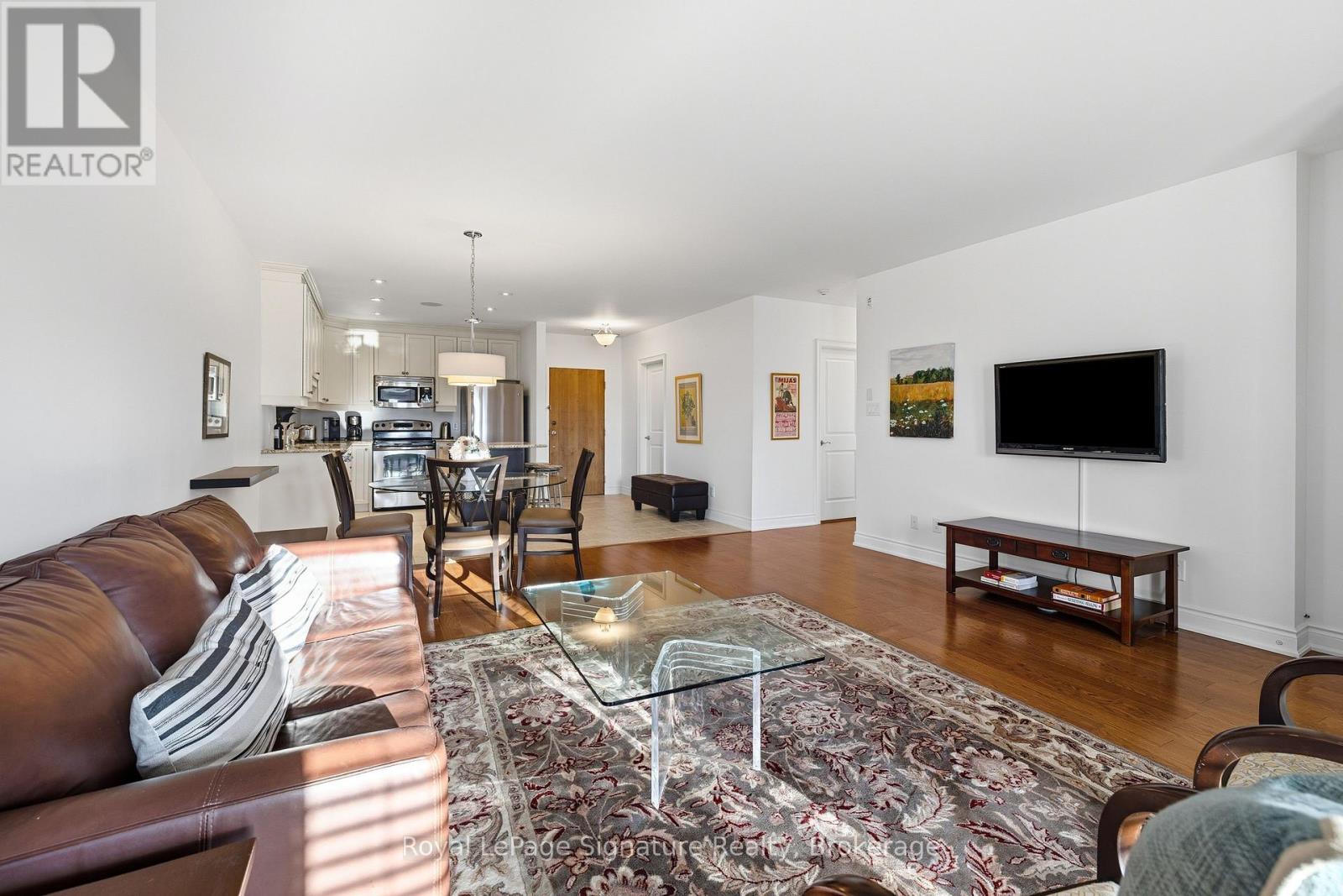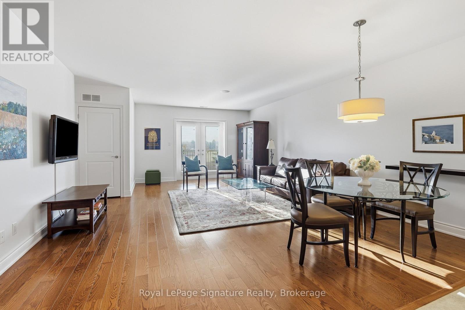 Welcome to Far Hills, a sought-after community perfectly situated within walking distance of downtown Thornbury's shops, restaurants, and amenities. This 2-bedroom, 2-bathroom condo offers a bright and airy second-floor location with an east-facing balcony that captures the morning sun and provides tranquil views of mature trees, manicured baseball fields, and the Niagara Escarpment beyond. Inside, you'll find an open-concept layout designed for comfort and functionality. The large primary bedroom features an ensuite bathroom and a walk-in closet complete with a custom closet system. The second bedroom and full bath offer flexibility for guests or a home office. Additional highlights include in-suite laundry, plenty of storage, and underground parking for year-round convenience. Residents of Far Hills enjoy exceptional amenities, including a community clubhouse, outdoor pool, and tennis/pickleball court all surrounded by beautifully maintained grounds. Whether you're seeking an active lifestyle or a peaceful retreat, this condo delivers the best of Thornbury living. (id:64974)