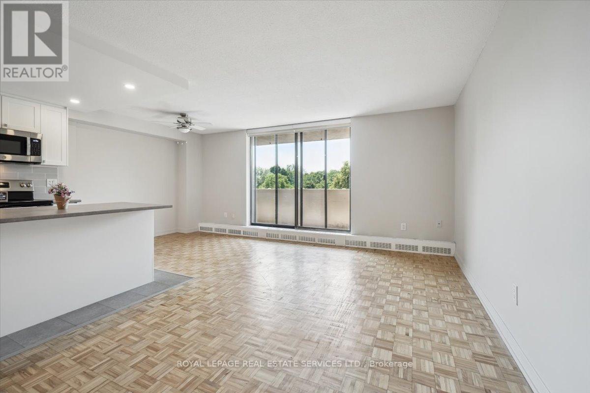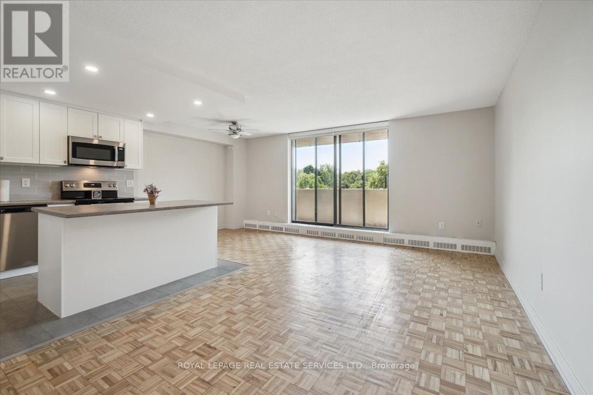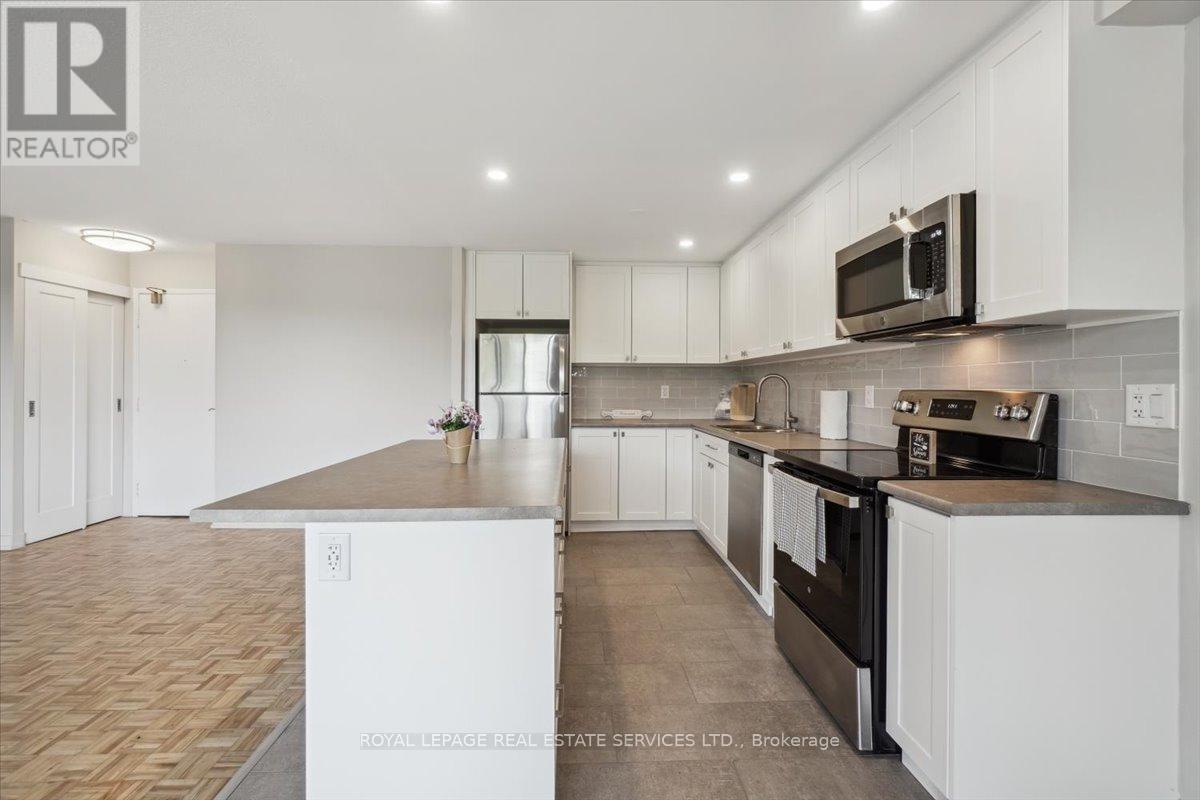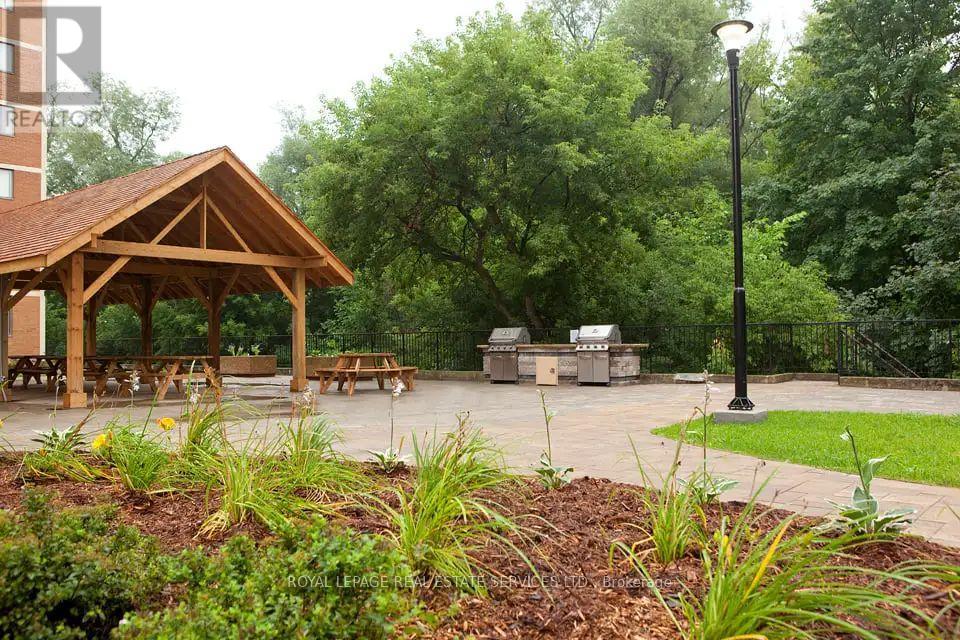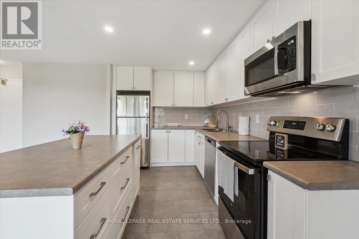 **Welcome to Silvercreek Towers , Where Nature Meets Convenience** Nestled in a peaceful natural setting yet just minutes from the many amenities of Georgetown, Silvercreek Towers offers the perfect blend of tranquility and accessibility. This spacious 2-bedroom suite boasts an open-concept layout with approximately 930 sq ft of living space, featuring hardwood flooring and a fresh coat of neutral paint throughout the suite. The renovated kitchen is a chefs delight, showcasing designer cabinetry with ample storage, a large island ideal for entertaining, sleek stainless steel appliances, a double sink, recessed lighting, a stylish tile backsplash, and plenty of prep space. Both the primary and second bedrooms include double sliding doors with custom built-in closet organizers. Additional updates include contemporary light fixtures and window coverings. Generous storage room located within the unit.. Building Amenities Include: Fitness room, Community BBQ area, Gazebo with picnic space, Pet-friendly environment, Onsite laundry facilities, Covered parking available. With easy access to GO Train and GO Bus services, and within walking distance to downtown Georgetown, shops, restaurants, parks, and trails, Silvercreek Towers offers the best of both worlds: serene surroundings and urban convenience. This is more than just a suite, its a place you will love to call home. (id:64974)