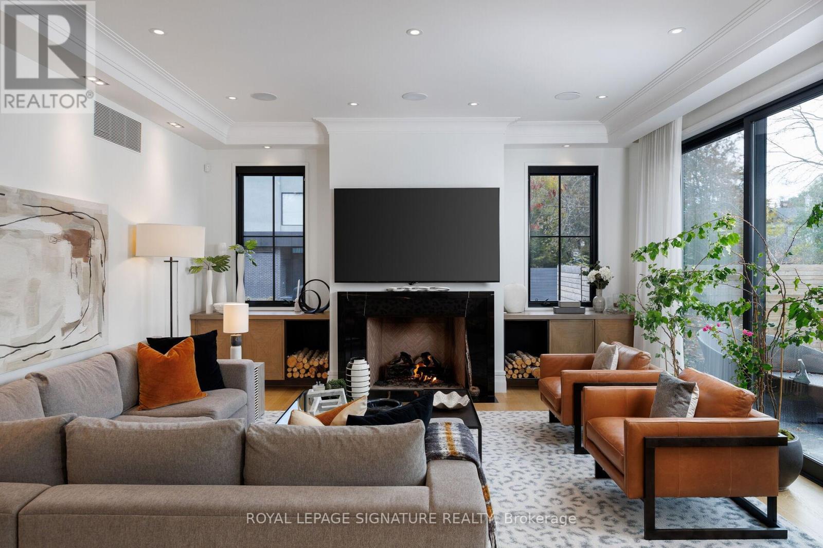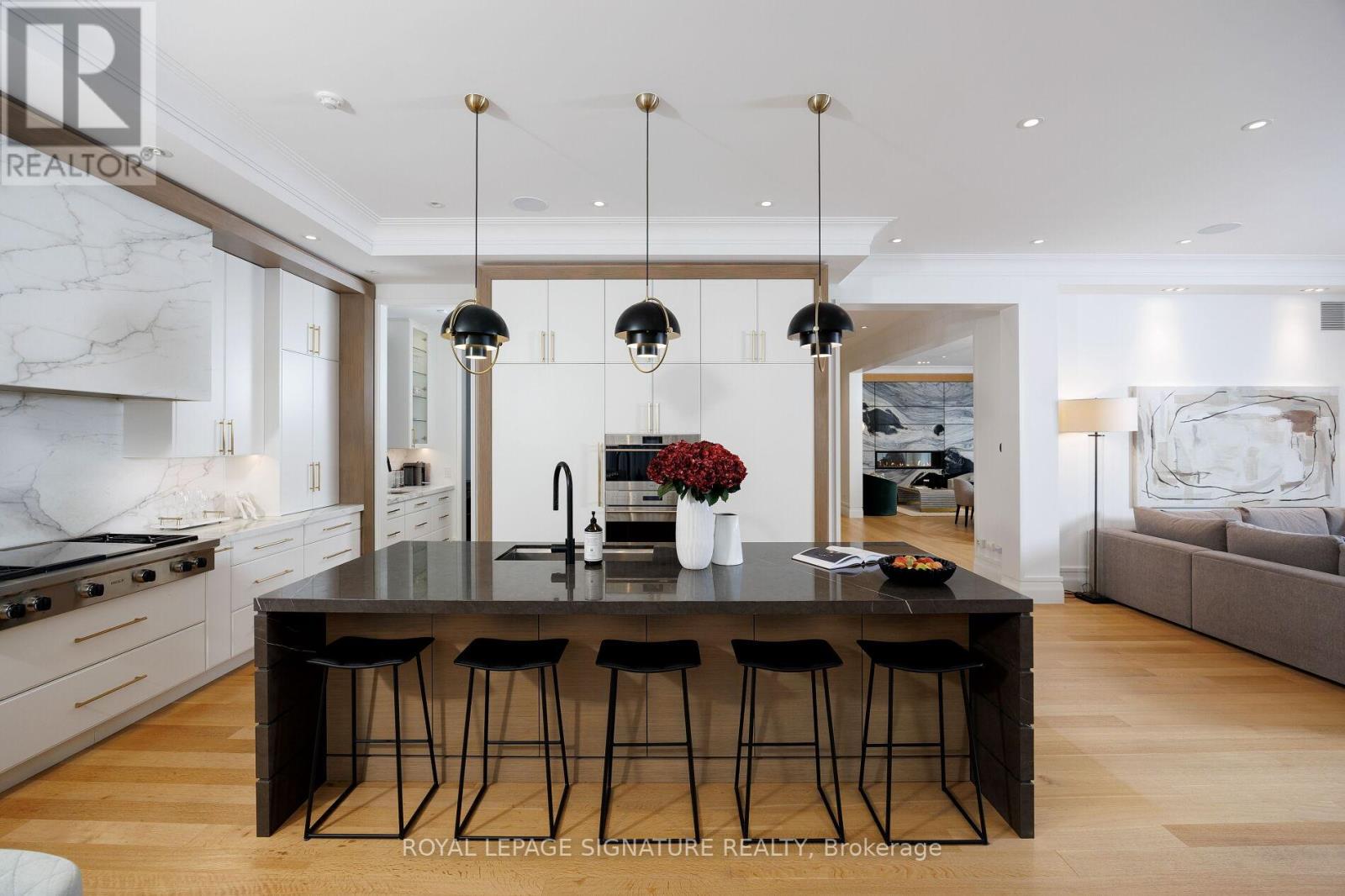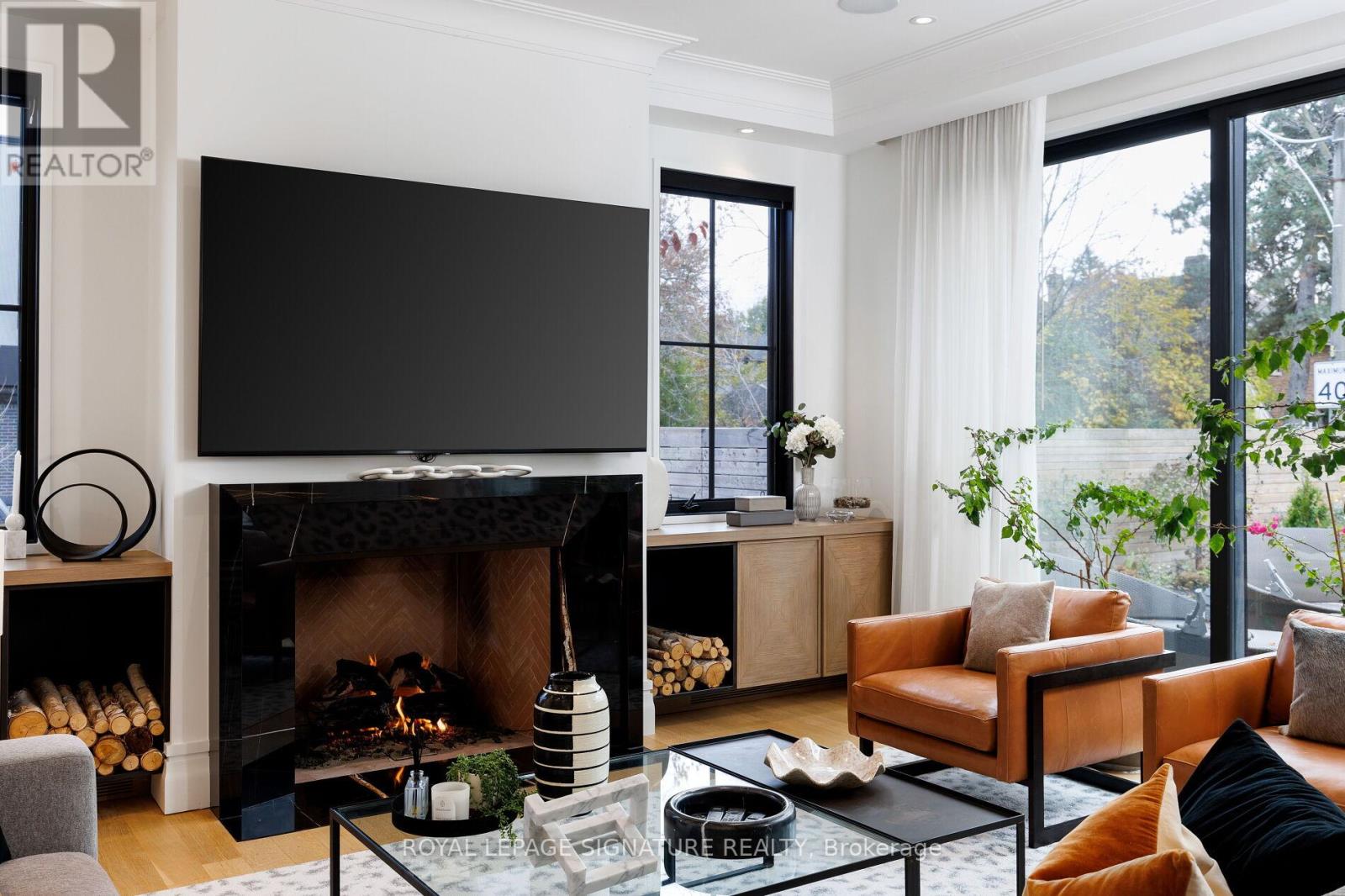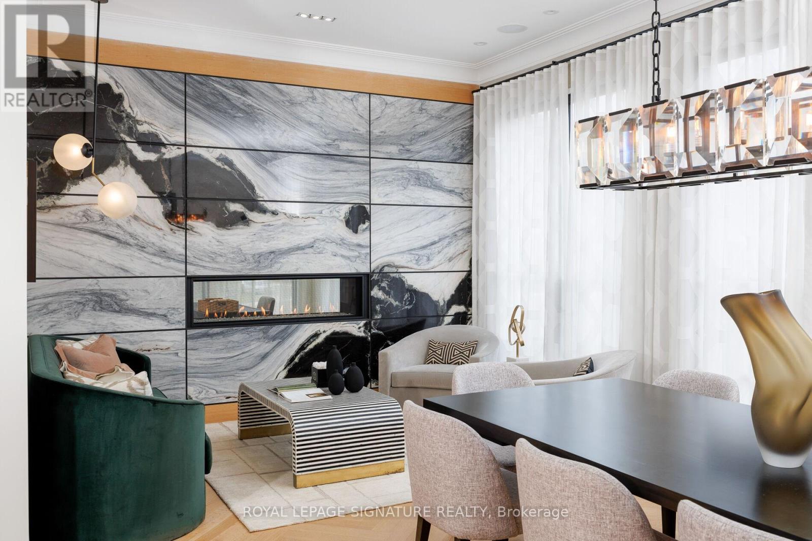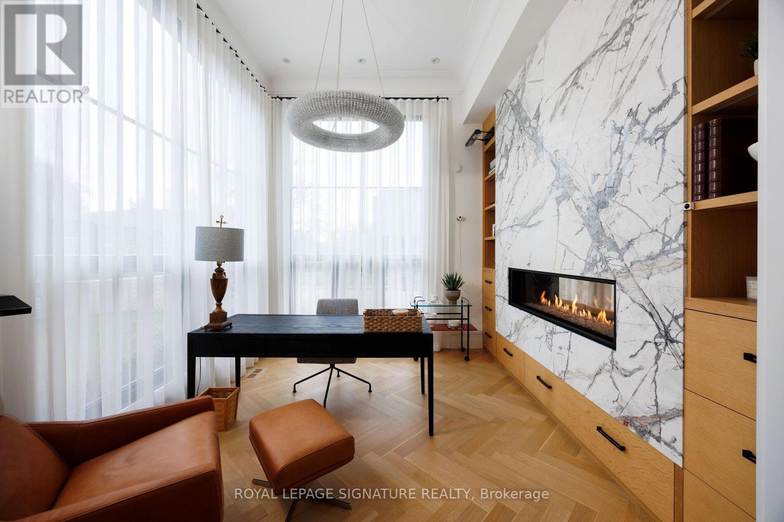 Nestled on a quiet, tree-lined street in Lytton Park, 207 Strathallan Blvd is a bespoke 5+ bedroom residence offering over 6,500 sq.ft. of elegantly crafted total living space. Built in 2019 by Teddington Homes & realized with uncompromising craftsmanship & a refined palette of luxury materials, the home was conceived under the architectural direction of Limor Benmor-Mizrahi (formerly of Peter Higgins Architect) & finished with interiors by Debra Salmoni, embodying a balance of modern sophistication & enduring comfort. A monumental front door opens into a refined foyer with a custom marble-inlay floor. A powder room is conveniently located off the foyer, across from the executive office. White oak & heated stone flooring, soaring ceilings & abundant natural light create an atmosphere of calm refinement. At the front, the executive office is anchored by a sleek see-through gas fireplace that also serves the open-concept formal living & dining areas, where French doors walk out to a flagstone terrace. The centre hall leads into the sun-filled family room with floor-to-ceiling windows & oversized sliders extending the space to the backyard. The south-facing breakfast area enjoys another walk-out. The kitchen, both a design statement & a culinary workspace, features integrated pro-grade appliances, custom Bellini cabinetry, marble countertops & backsplash, an oversized limestone island with seating, extended-height cabinetry & a fully outfitted butler's pantry with access to the mudroom & garage. Upstairs, the primary suite is a private retreat with a gas fireplace, balcony, soaring ceiling & spa-inspired 5pc ensuite. Three additional bedrooms each offer a private ensuite & custom walk-in closet. The 3rd level provides a flexible 5th bedroom suite with a 3pc ensuite & balcony. The lower level features a large entertainment room with kitchenette & walkup, a glass-enclosed fitness studio, a 6th bedroom with 3pc ensuite, the main laundry room, a 2pc bath & a cold room. (id:64974)