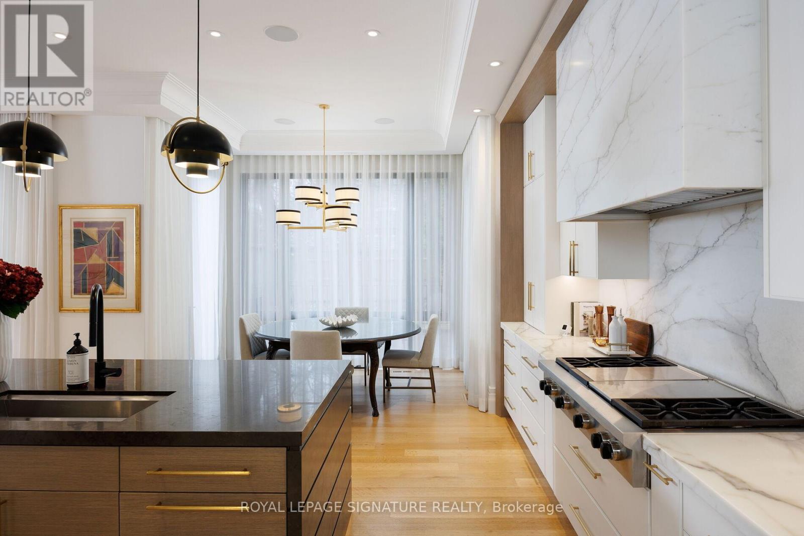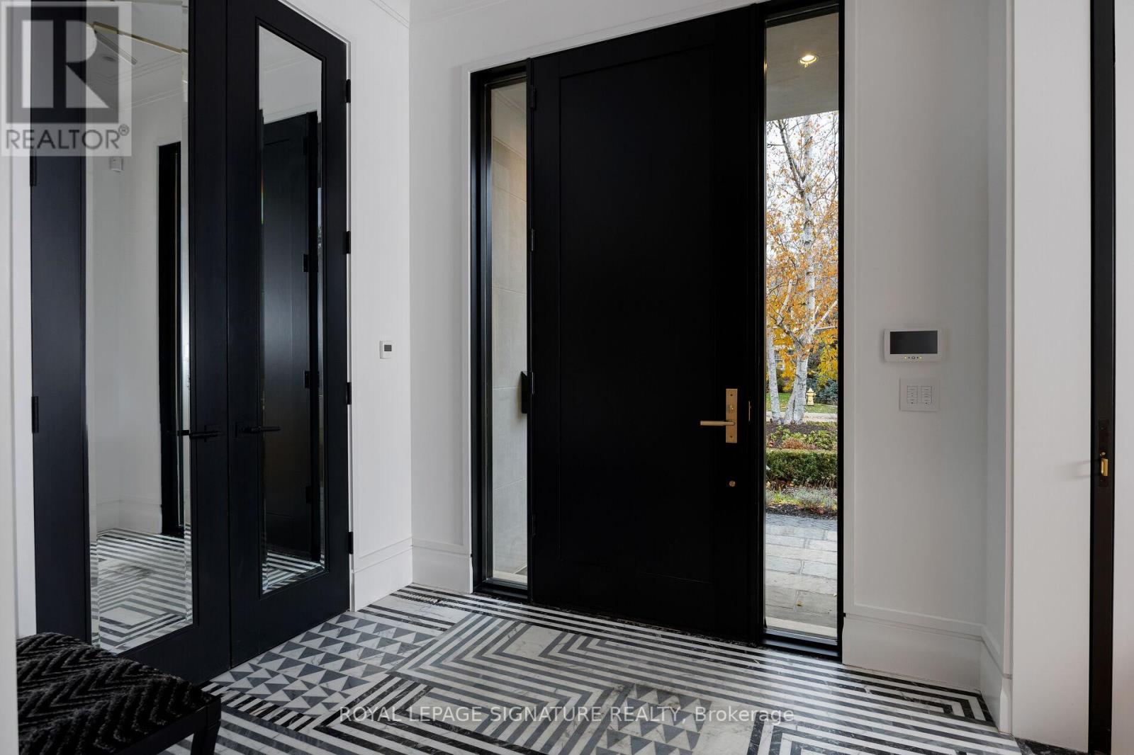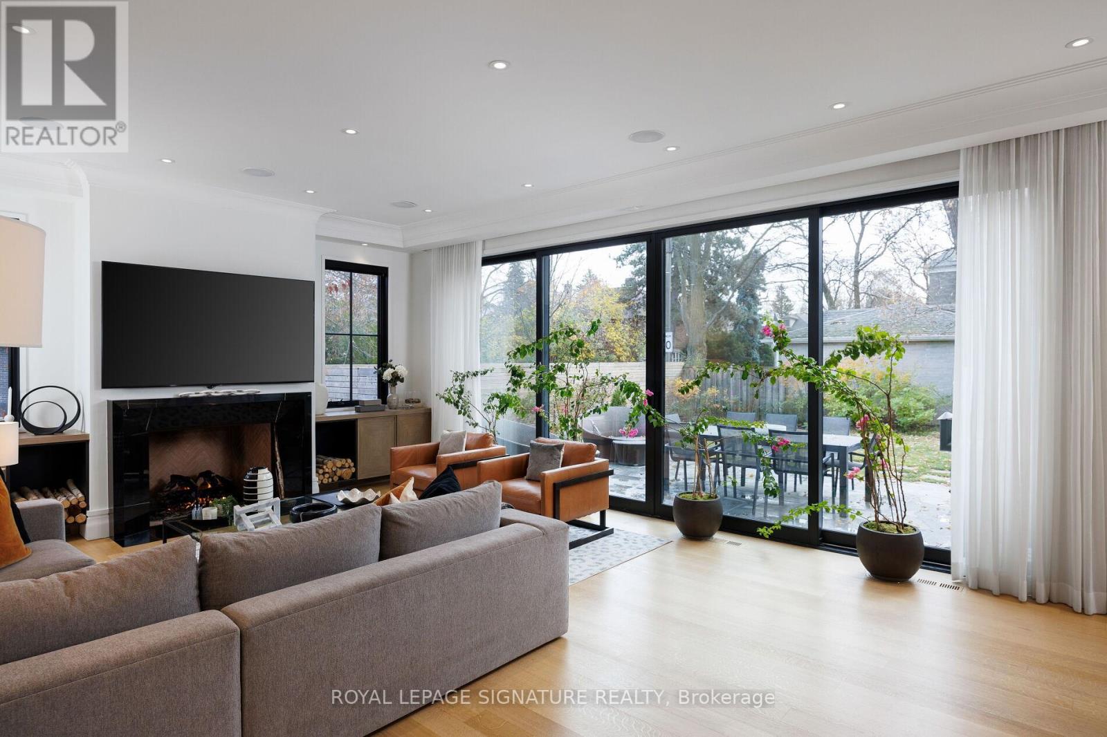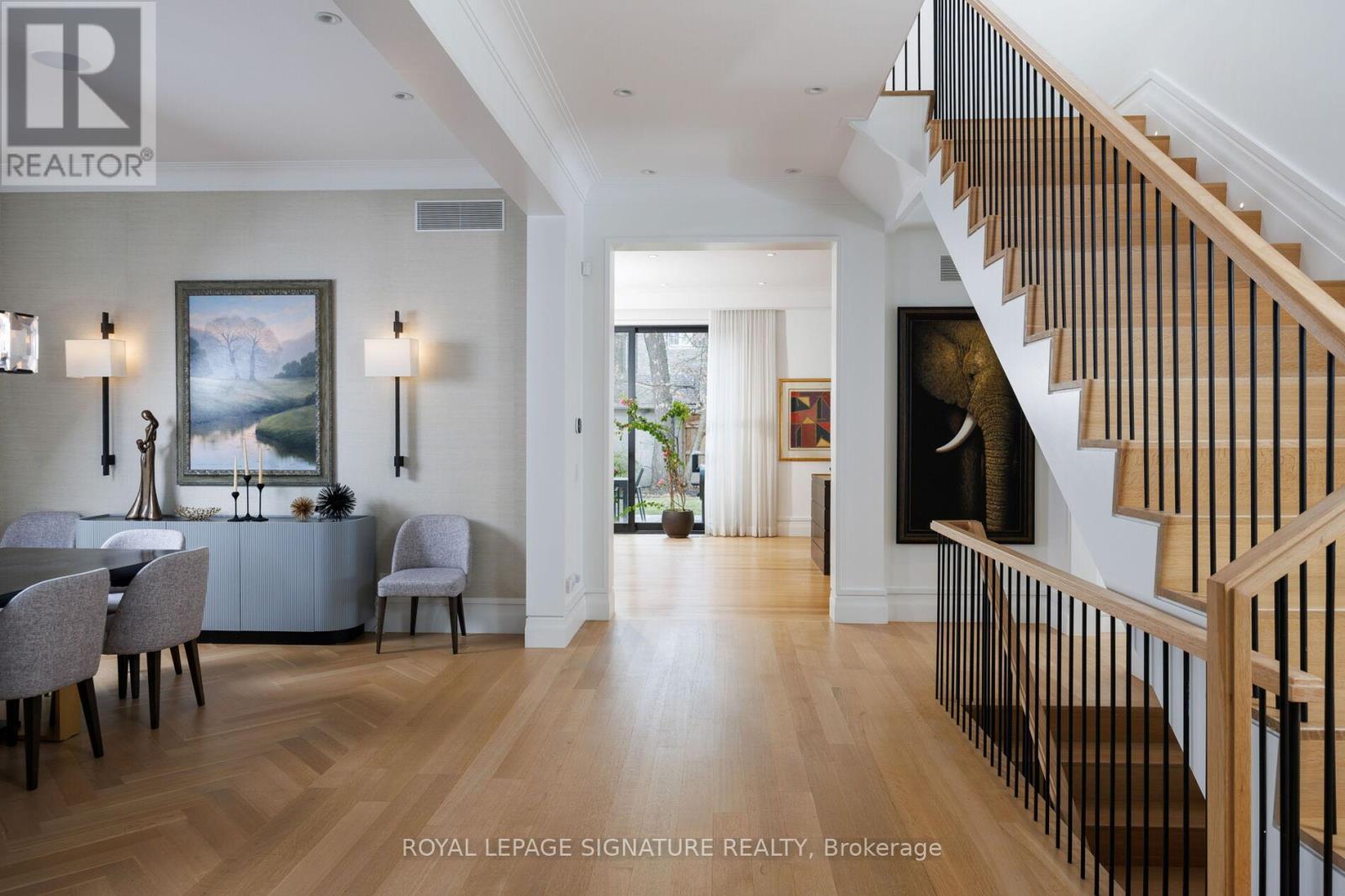 Nestled on a quiet, tree-lined street in Lytton Park, 207 Strathallan Blvd is a bespoke 5+ bedroom residence offering over 6,500 sq.ft. of elegantly crafted total living space. Built in 2019 by Teddington Homes & realized with uncompromising craftsmanship & a refined palette of luxury materials, the home was conceived under the architectural direction of Limor Benmor-Mizrahi (formerly of Peter Higgins Architect) & finished with interiors by Debra Salmoni, embodying a balance of modern sophistication & enduring comfort. A monumental front door opens into a refined foyer with a custom marble-inlay floor. A powder room is conveniently located off the foyer, across from the executive office. White oak & heated stone flooring, soaring ceilings & abundant natural light create an atmosphere of calm refinement. At the front, the executive office is anchored by a sleek see-through gas fireplace that also serves the open-concept formal living & dining areas, where French doors walk out to a flagstone terrace. The centre hall leads into the sun-filled family room with floor-to-ceiling windows & oversized sliders extending the space to the backyard. The south-facing breakfast area enjoys another walk-out. The kitchen, both a design statement & a culinary workspace, features integrated pro-grade appliances, custom Bellini cabinetry, marble countertops & backsplash, an oversized limestone island with seating, extended-height cabinetry & a fully outfitted butler's pantry with access to the mudroom & garage. Upstairs, the primary suite is a private retreat with a gas fireplace, balcony, soaring ceiling & spa-inspired 5pc ensuite. Three additional bedrooms each offer a private ensuite & custom walk-in closet. The 3rd level provides a flexible 5th bedroom suite with a 3pc ensuite & balcony. The lower level features a large entertainment room with kitchenette & walkup, a glass-enclosed fitness studio, a 6th bedroom with 3pc ensuite, the main laundry room, a 2pc bath & a cold room. (id:64974)