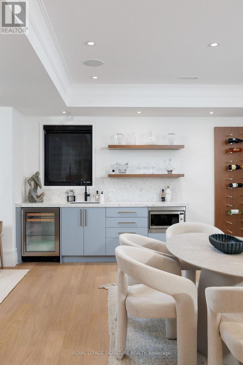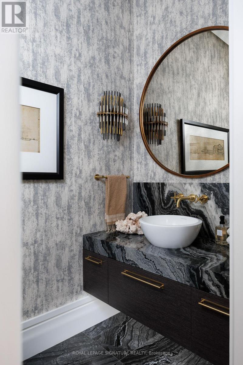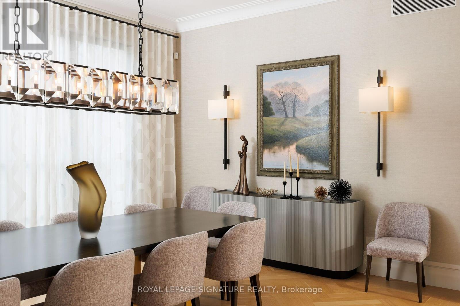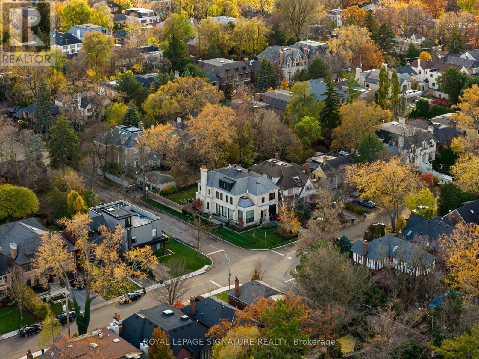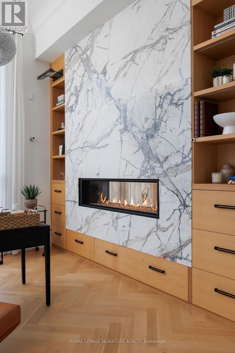 Nestled on a quiet, tree-lined street in Lytton Park, 207 Strathallan Blvd is a bespoke 5+ bedroom residence offering over 6,500 sq.ft. of elegantly crafted total living space. Built in 2019 by Teddington Homes & realized with uncompromising craftsmanship & a refined palette of luxury materials, the home was conceived under the architectural direction of Limor Benmor-Mizrahi (formerly of Peter Higgins Architect) & finished with interiors by Debra Salmoni, embodying a balance of modern sophistication & enduring comfort. A monumental front door opens into a refined foyer with a custom marble-inlay floor. A powder room is conveniently located off the foyer, across from the executive office. White oak & heated stone flooring, soaring ceilings & abundant natural light create an atmosphere of calm refinement. At the front, the executive office is anchored by a sleek see-through gas fireplace that also serves the open-concept formal living & dining areas, where French doors walk out to a flagstone terrace. The centre hall leads into the sun-filled family room with floor-to-ceiling windows & oversized sliders extending the space to the backyard. The south-facing breakfast area enjoys another walk-out. The kitchen, both a design statement & a culinary workspace, features integrated pro-grade appliances, custom Bellini cabinetry, marble countertops & backsplash, an oversized limestone island with seating, extended-height cabinetry & a fully outfitted butler's pantry with access to the mudroom & garage. Upstairs, the primary suite is a private retreat with a gas fireplace, balcony, soaring ceiling & spa-inspired 5pc ensuite. Three additional bedrooms each offer a private ensuite & custom walk-in closet. The 3rd level provides a flexible 5th bedroom suite with a 3pc ensuite & balcony. The lower level features a large entertainment room with kitchenette & walkup, a glass-enclosed fitness studio, a 6th bedroom with 3pc ensuite, the main laundry room, a 2pc bath & a cold room. (id:64974)